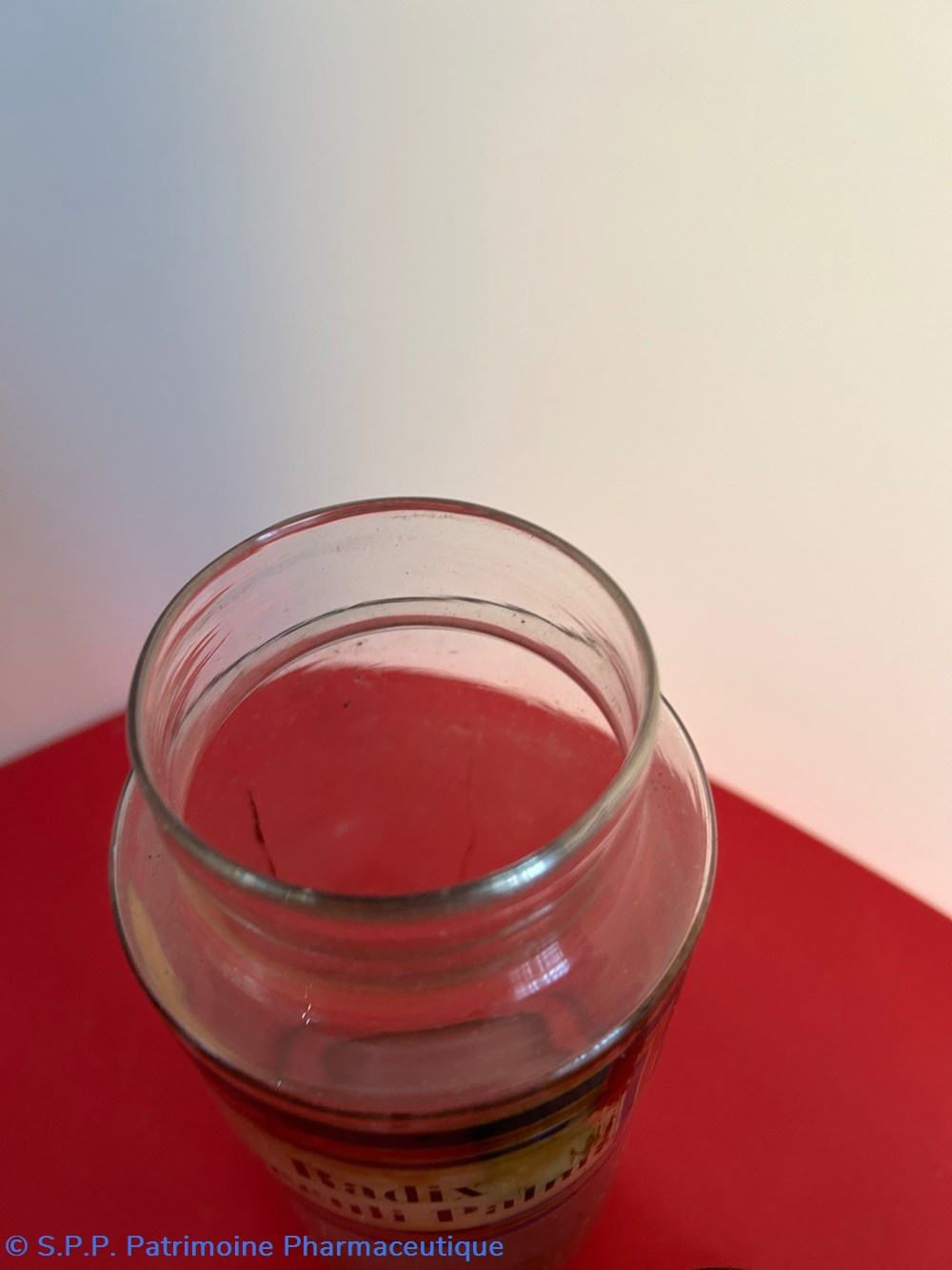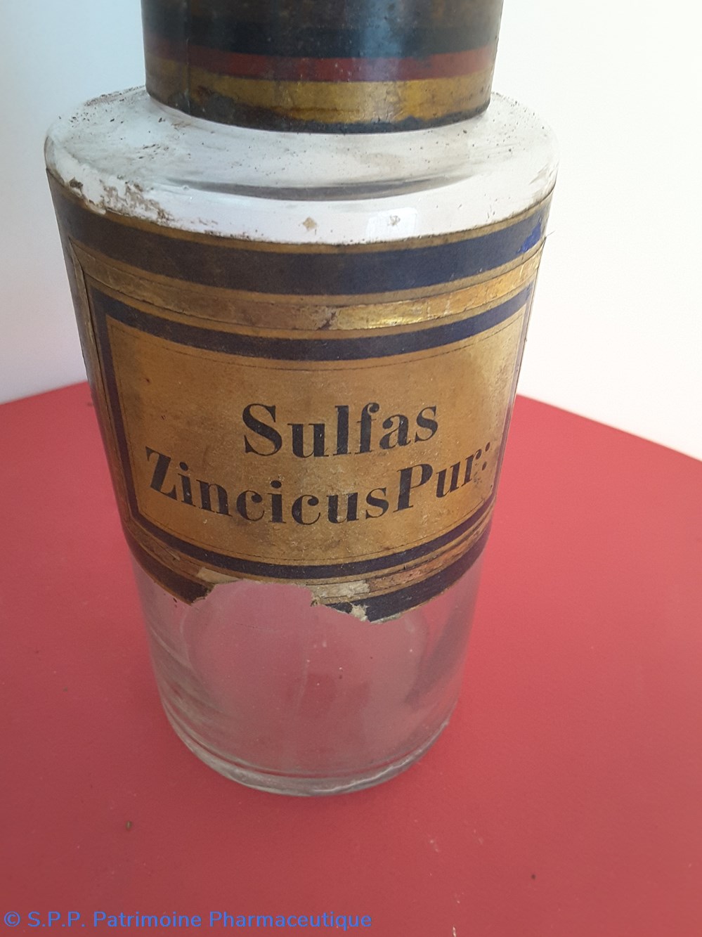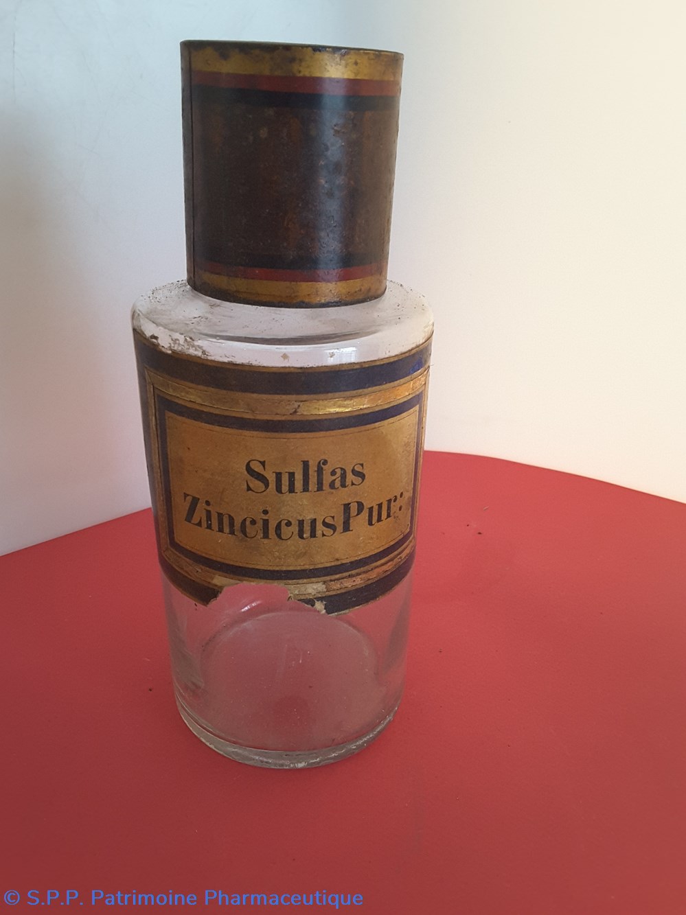 Flacon de pharmacie en verre soufflé avec ouverture en goulot évasé permettant de verser des poudres. Etiquette crème entourée de bandes alternées bleu et or. Le nom est inscrit en noir au milieu d'un rectangle crème au centre de l'étiquette . Un couvercle en tôle peinte surmonte le flacon sans bouchon intérieur. Le goulot est entouré d'une bande de papier. Le couvercle était initialement décoré à sa base et dans la partie supérieure d'un filet doré. et rouge Le flacon est vide de substance; L(étiquette extérieure est abimée à da partie inférieure.