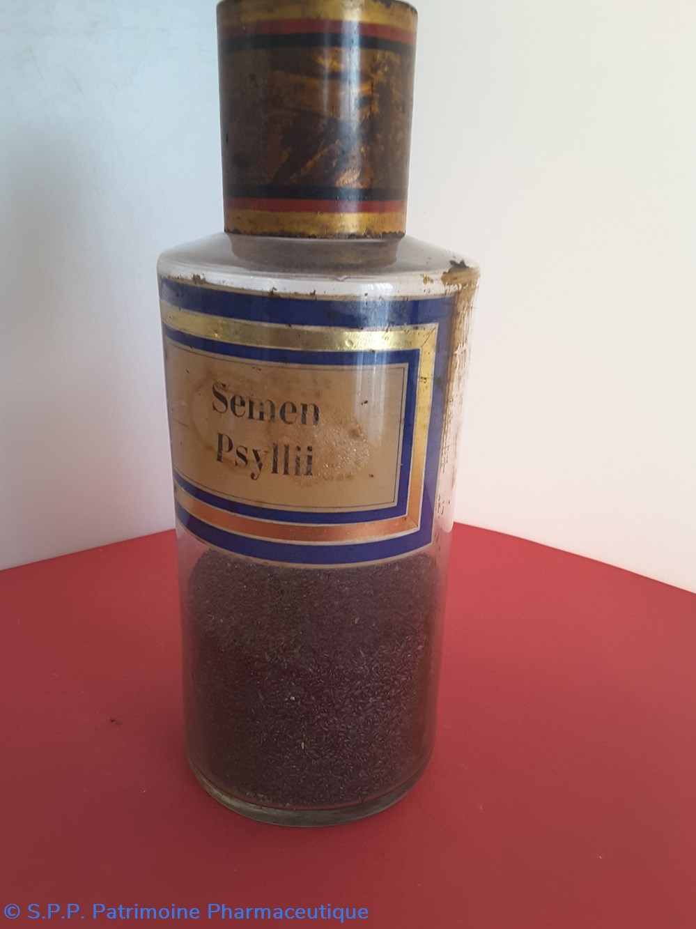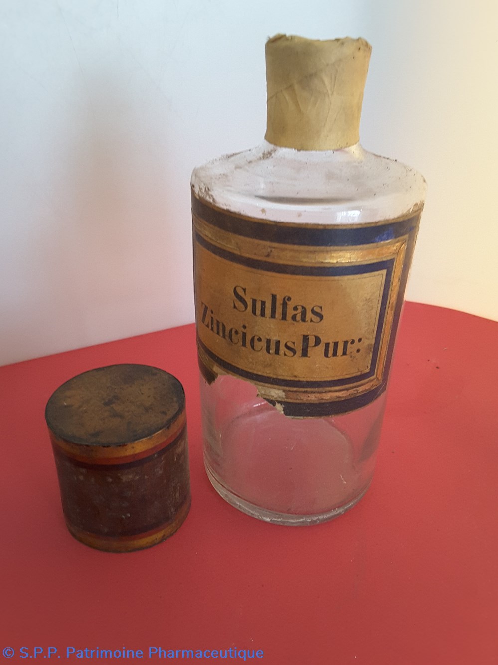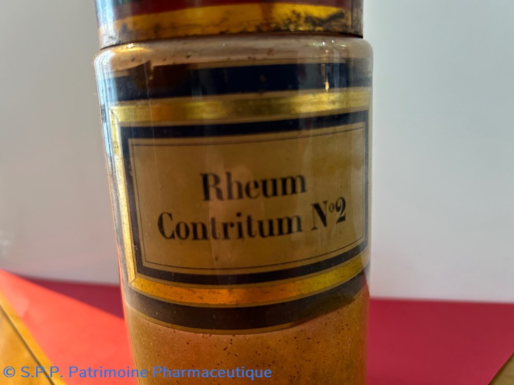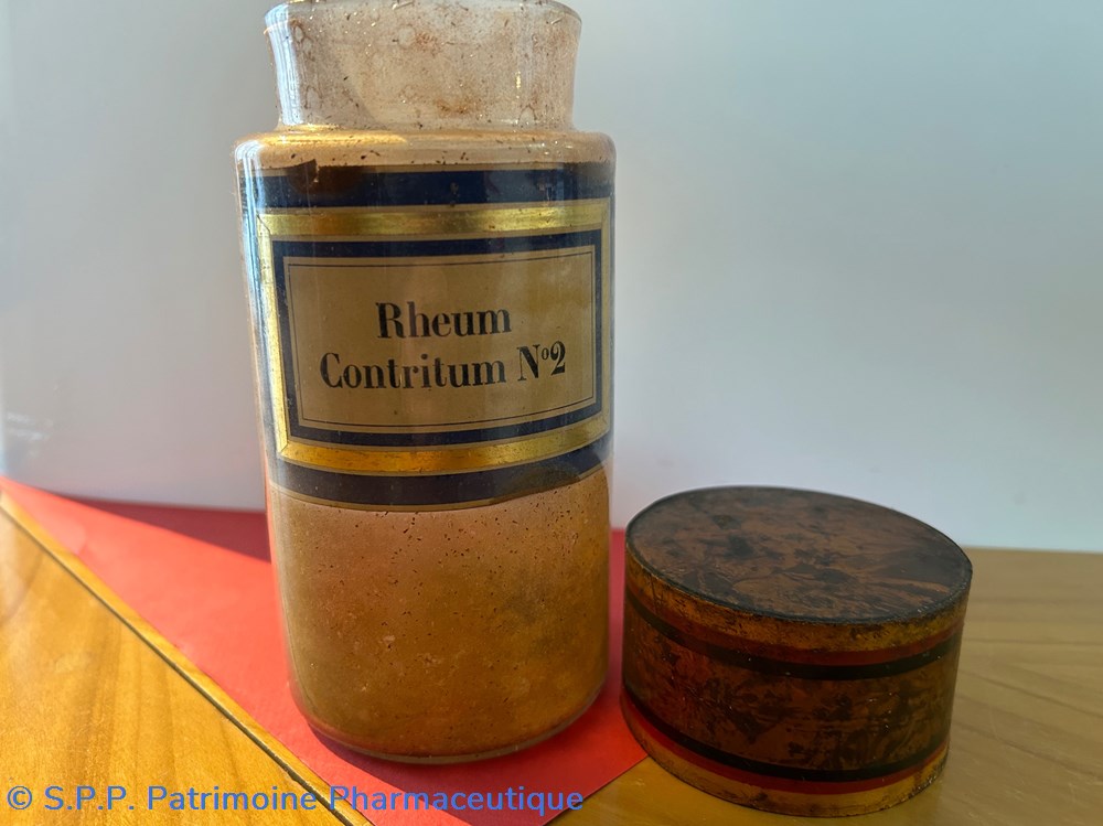 Flacon de pharmacie en verre soufflé à ouverture supérieure à col étroit permettant l'introduction facile de poudre. Etiquette collée à l'intérieur très joliment ornée d'encadrements alternés bleu et or.. Le nom est inscrit en noir au milieu d'un rectangle beige. Un couvercle en tôle peinte surmonte le flacon sans bouchon intérieur. Ce couvercle était initialement décoré à sa base et dans la partie supérieure de filets dorés. et rouge Le flacon est empli de poudre marron fo,ncé au 1/3 de sa contenance.