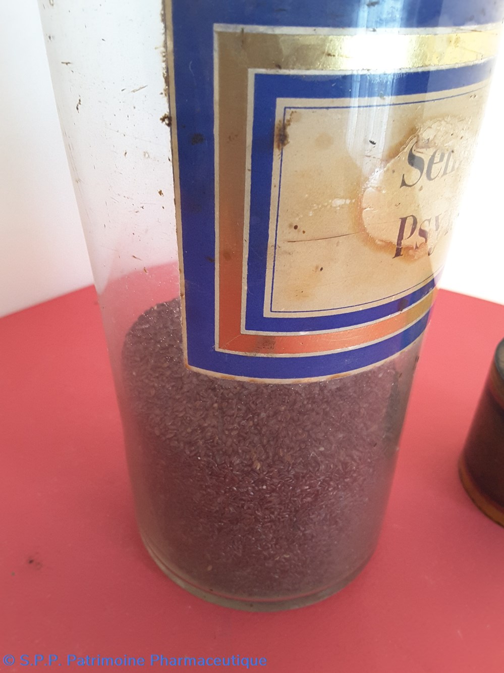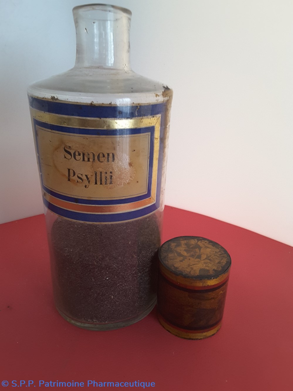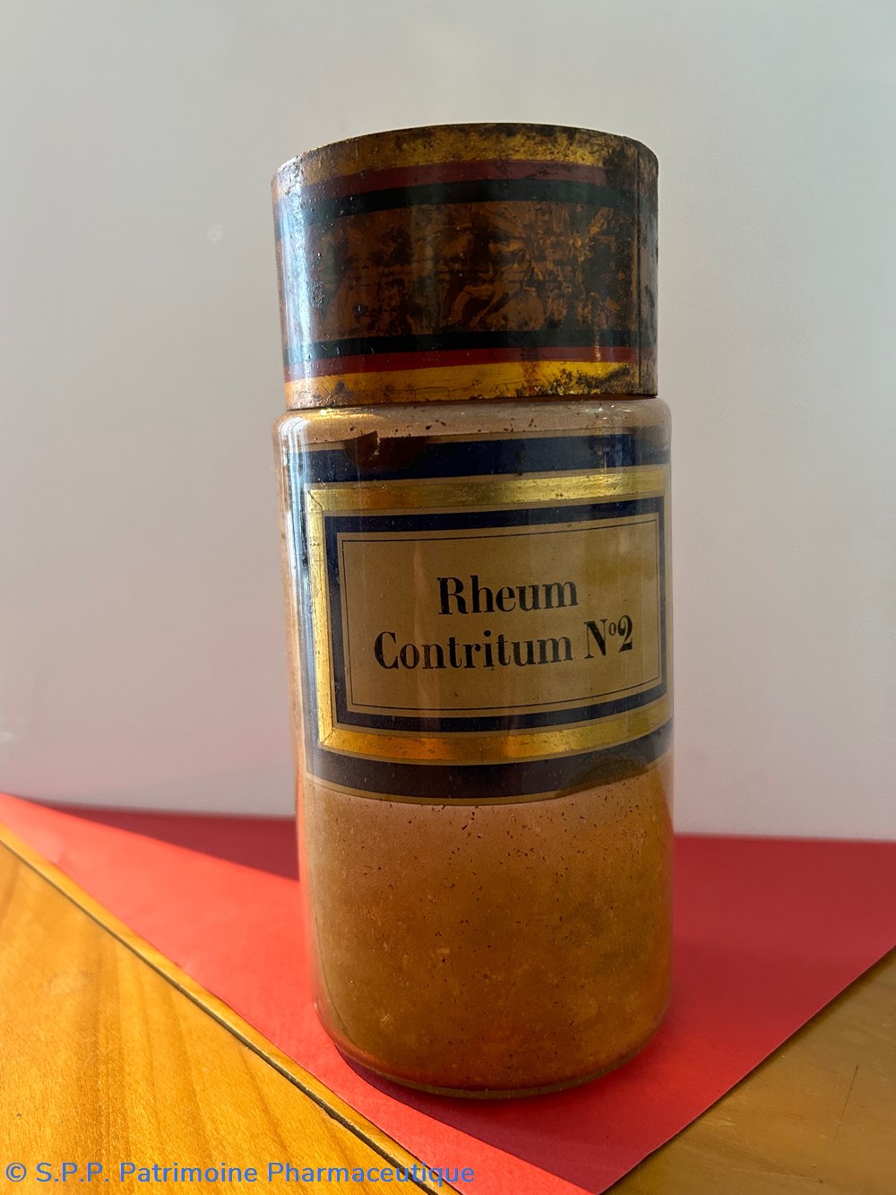 Flacon de pharmacie en verre soufflé à ouverture supérieure à col étroit permettant l'introduction facile de poudre. Etiquette collée à l'intérieur très joliment ornée d'encadrements alternés bleu et or.. Le nom est inscrit en noir au milieu d'un rectangle beige. Un couvercle en tôle peinte surmonte le flacon sans bouchon intérieur. Ce couvercle était initialement décoré à sa base et dans la partie supérieure de filets dorés. et rouge Le flacon est empli de poudre marron fo,ncé au 1/3 de sa contenance.