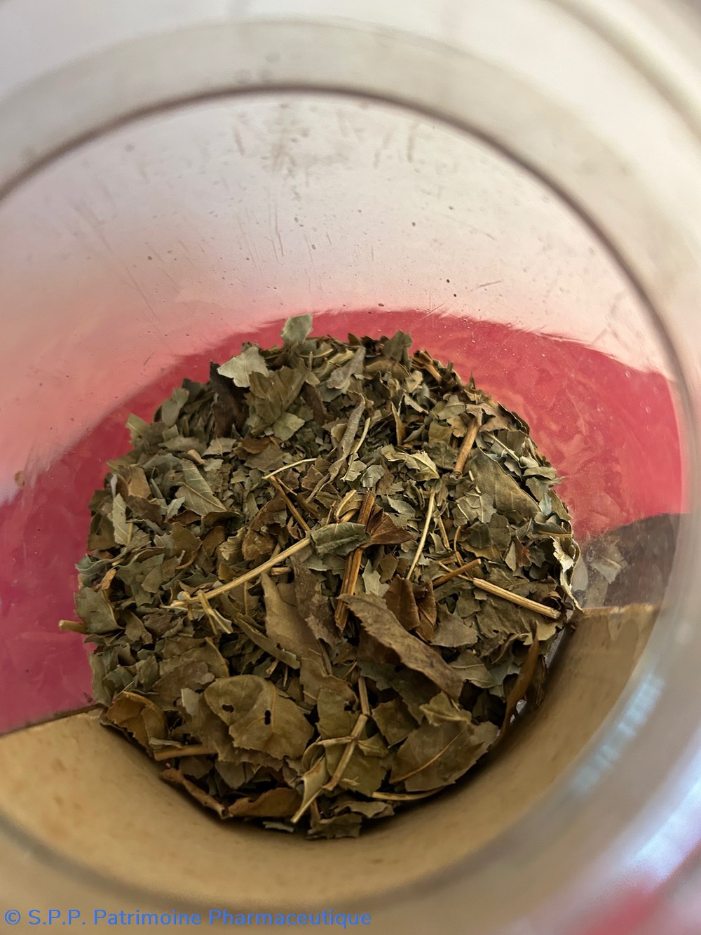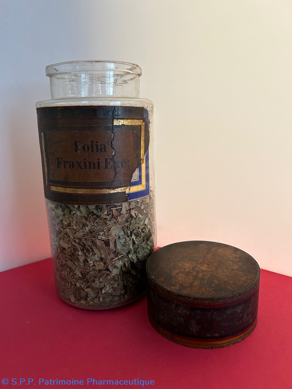 Flacon de pharmacie en verre soufflé à large ouverture supérieure permettant l'introduction facile de plantes. Etiquette collée à l'intérieur très joliment ornée d'encadrements alternés bleu et or. Le nom est inscrit en noir au milieu d'un rectangle beige. Un couvercle en tôle peinte mais fortement rouillé surmonte le flacon sans bouchon intérieur. Ce couvercle était initialement décoré à sa base et dans la partie supérieure de filets dorés et rouges. Le flacon est rempli aux 3/4 de plantes.