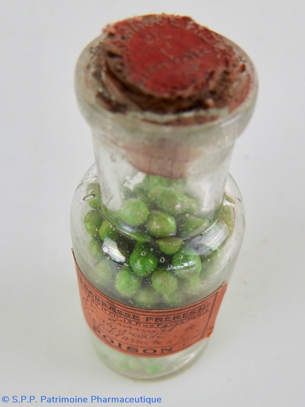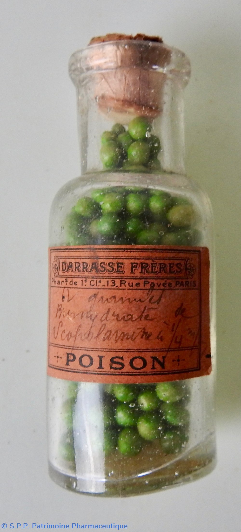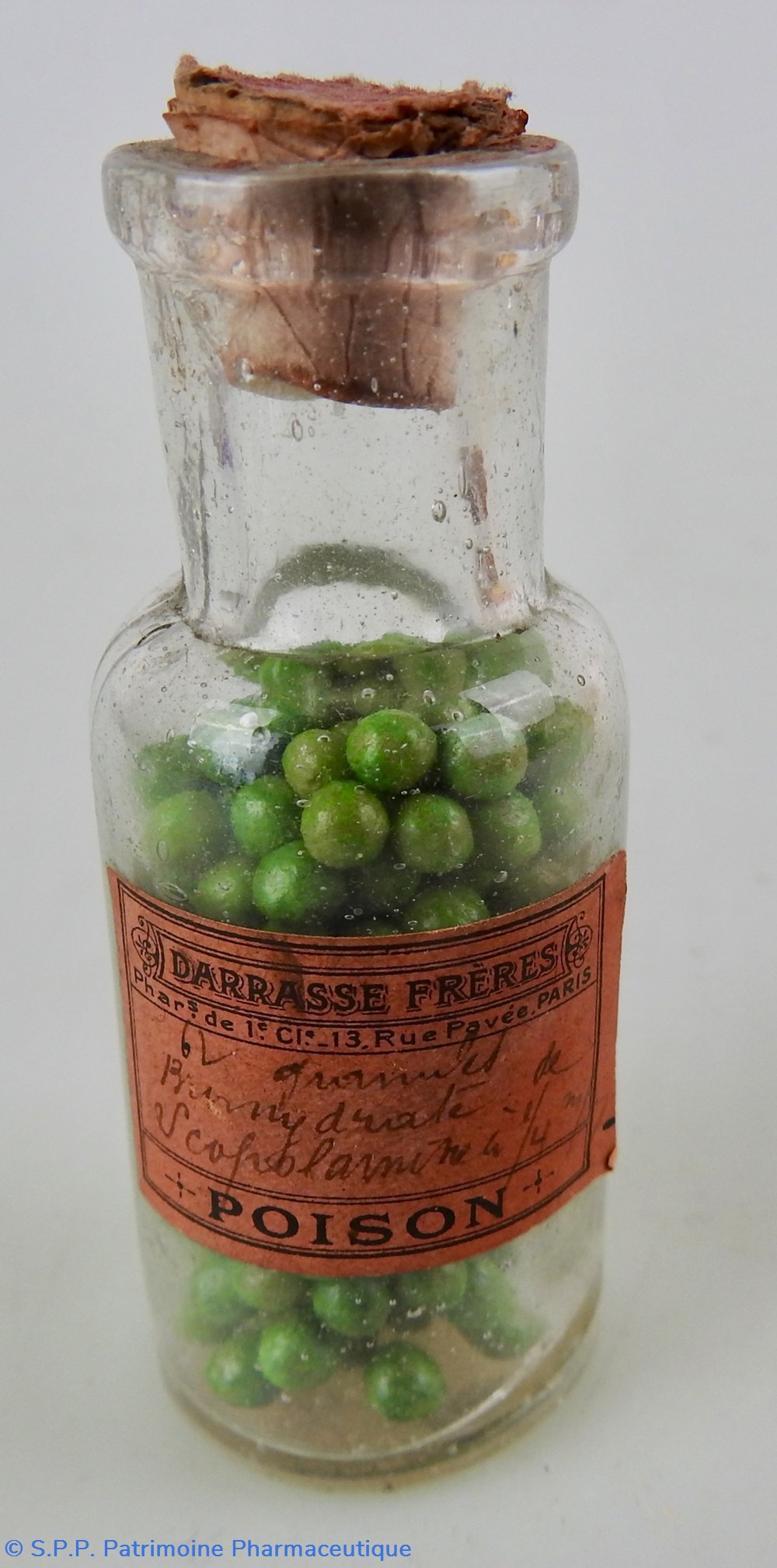 Flacon verre transparent Hauteur 7,5 cm - Base diamètre 3cm. contenant des granulés verts ferme avec un petit bouchon en liège.