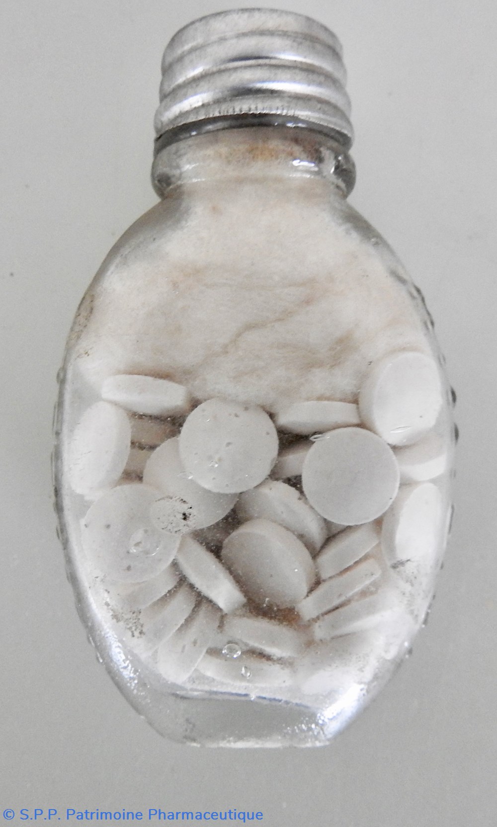 Flacon de verre transparent forme ovalisėe H 7,4 largeur maxi 4,5 Base ovale 2 cm× 1,3 cm contenant des petits comprimés blancs.