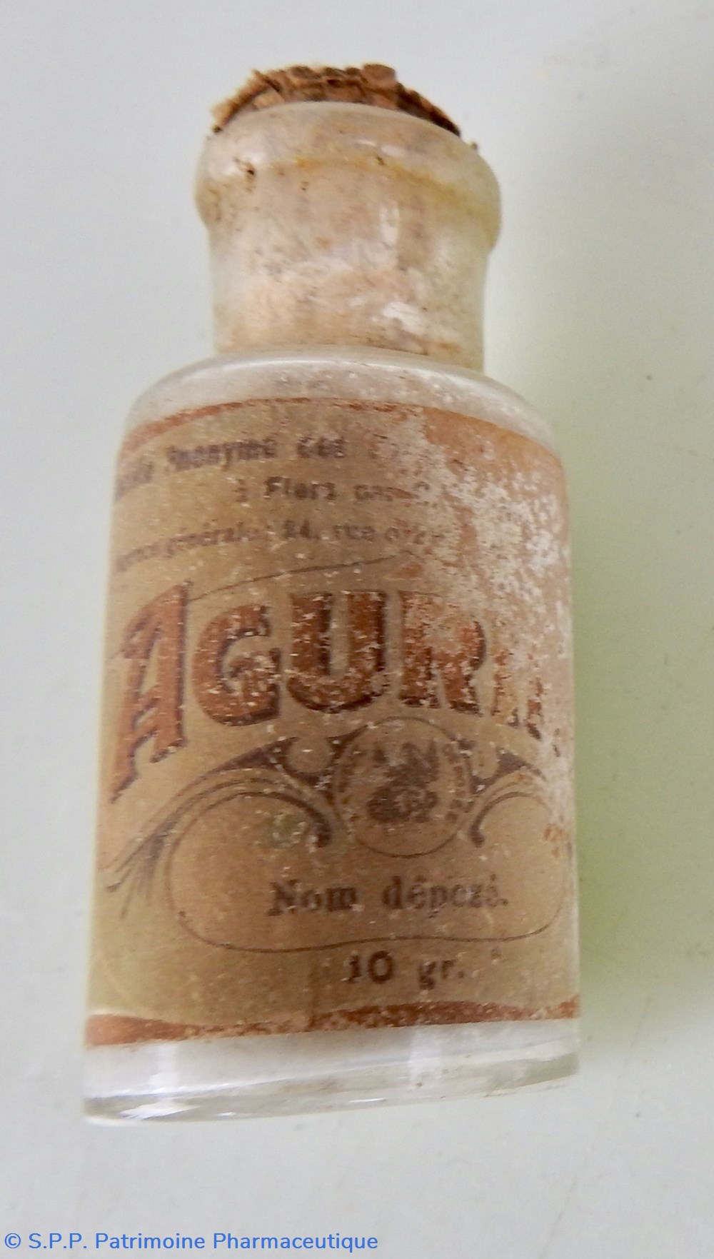 Flacon de verre transparent fermé par un bouchon de liège H 6,3 Diamètre 2,6 cm contenant 10 grammes