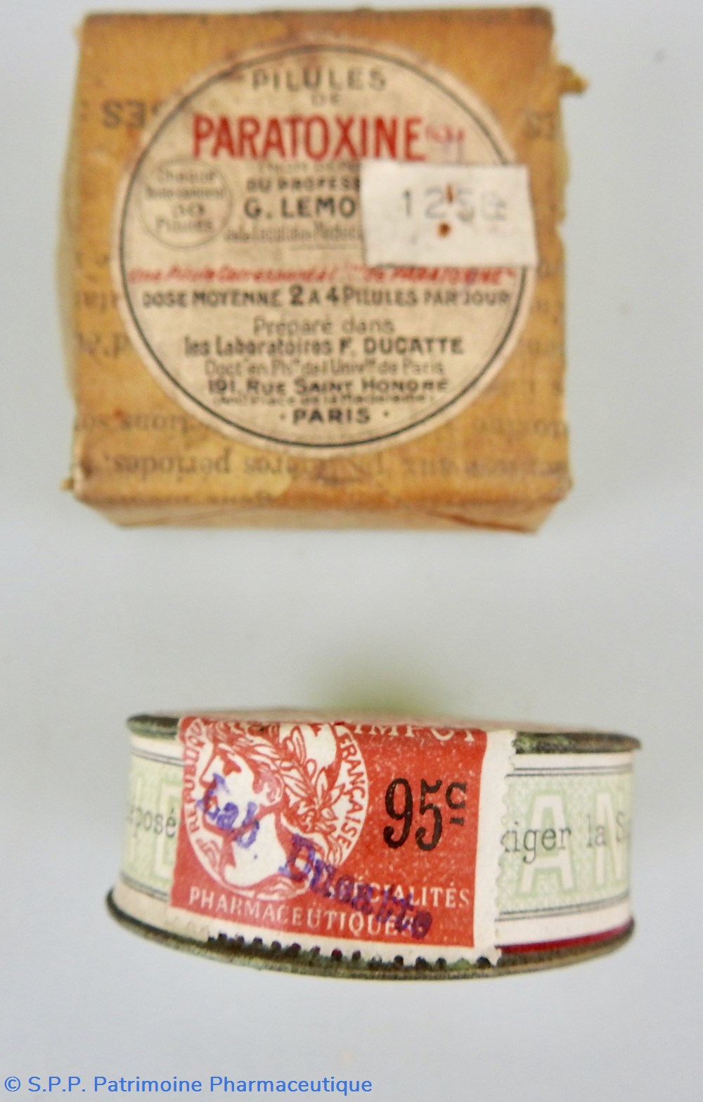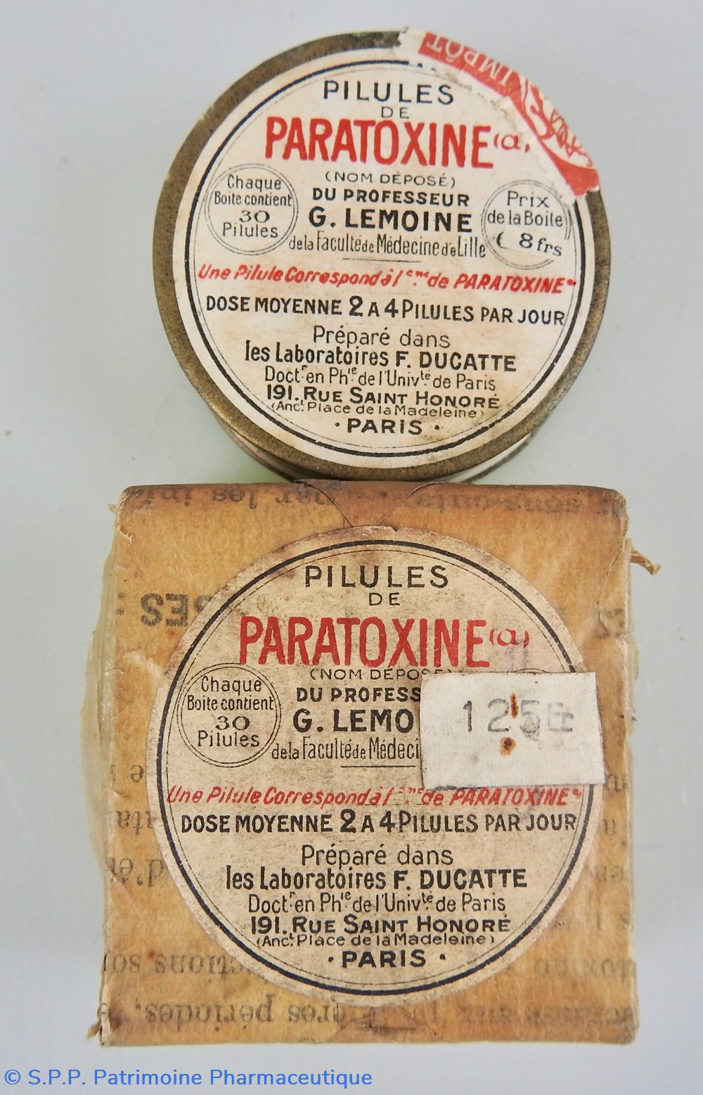 Pillules de Paratoxine du pr G. Lemoine préparées dans les laboratoires F. Ducatte Paris .