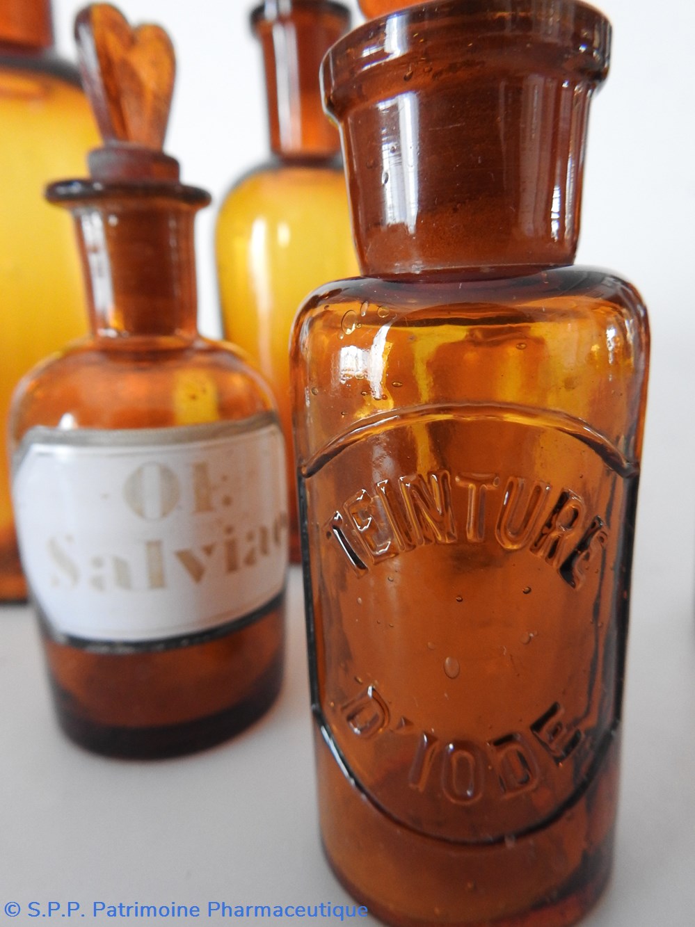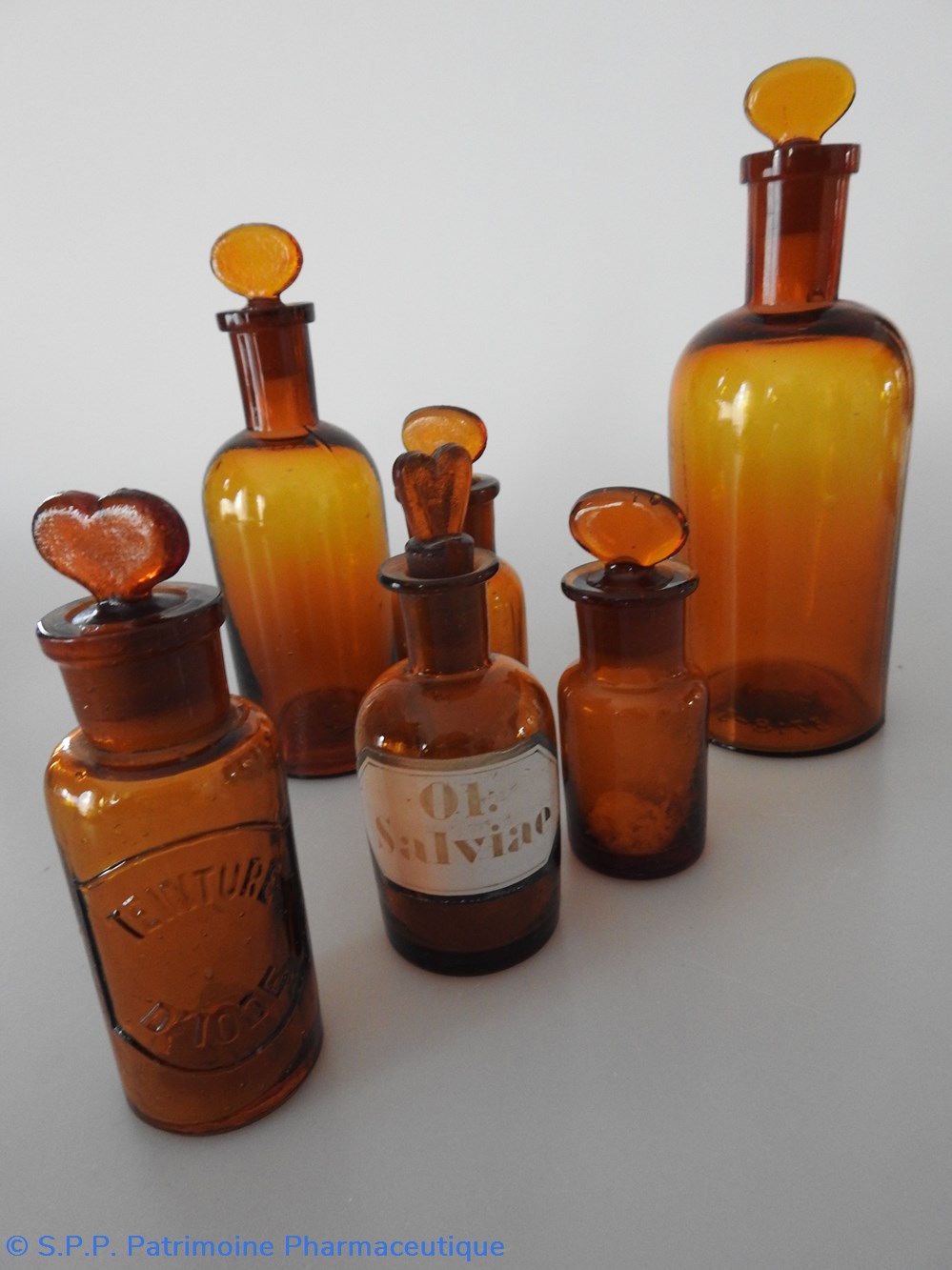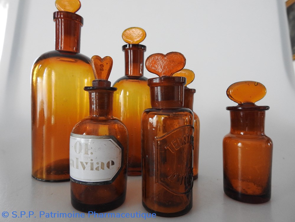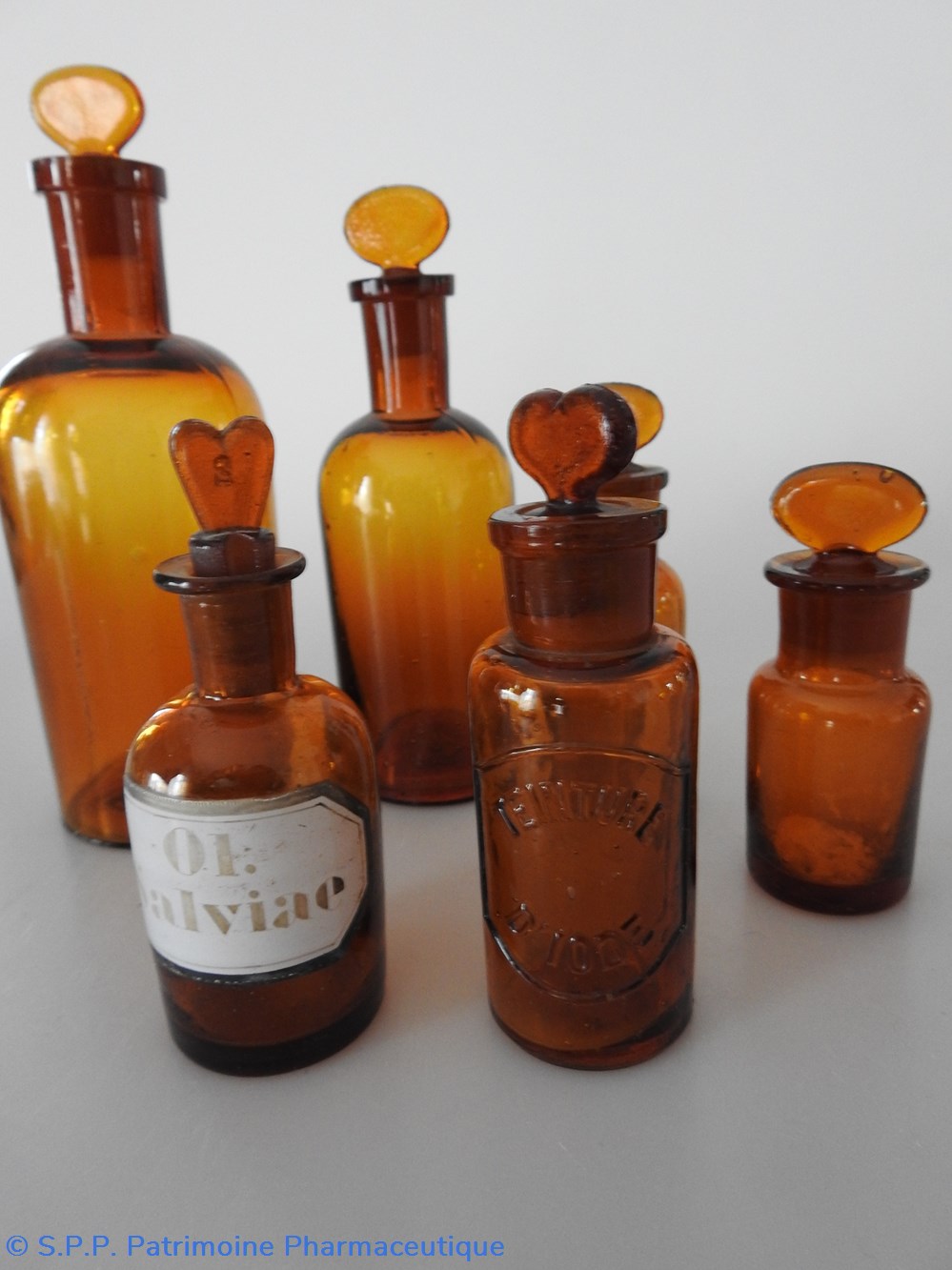 - 2 flacons avec bouchon en verre ambré en forme de coeur. Dont un (contenance 45) gravé teinture d'iode et l'autre etiquette blanche imprimée " OL Salviae.".