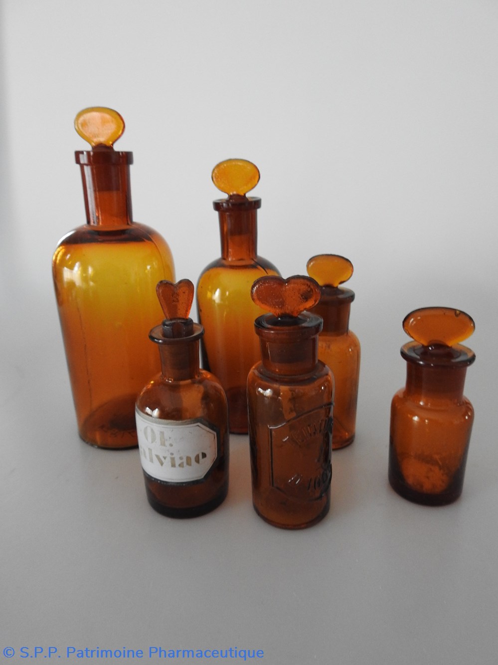 Lot de 6 flacons de verre ambré avec bouchon fermeture à l'ėmeri dont :