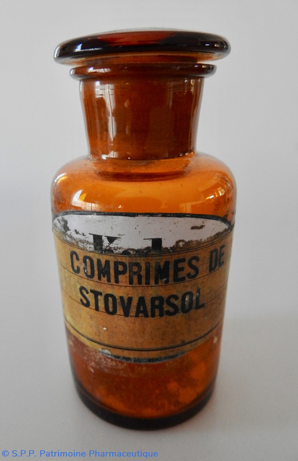 Etiquette ajoutée avec mention "Comprimés de Stovarsol" masquant une une étiquette sur fond blanc pouvant indiquer " Kol BRO...ULV"