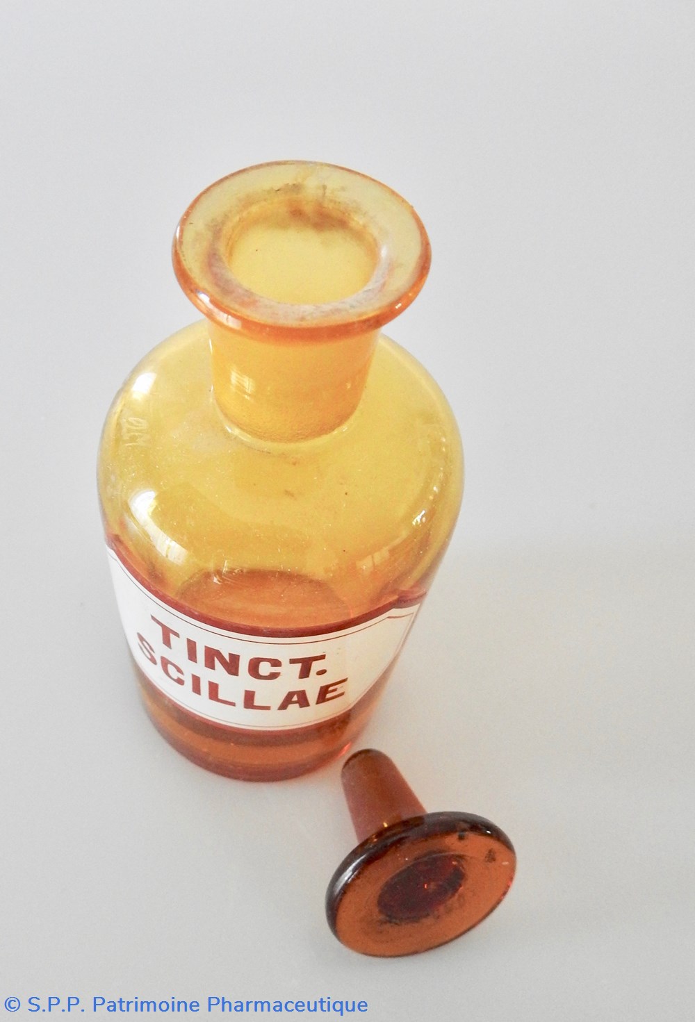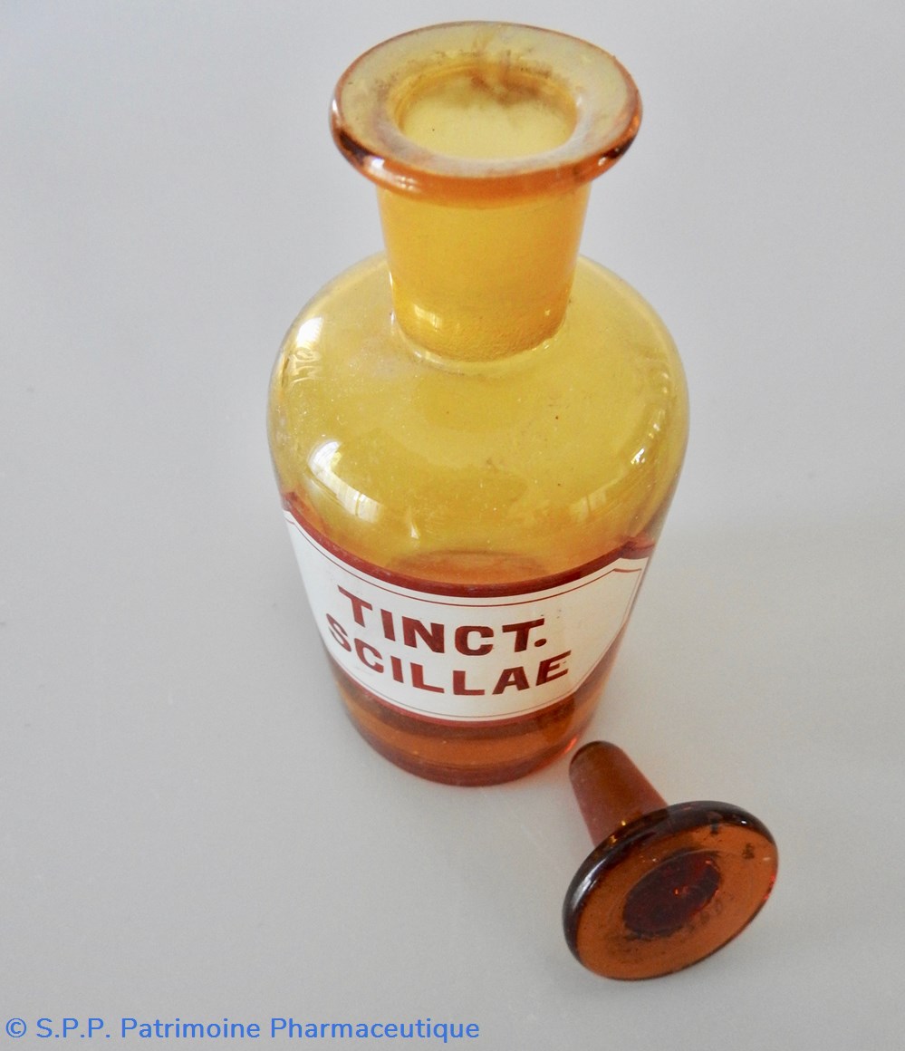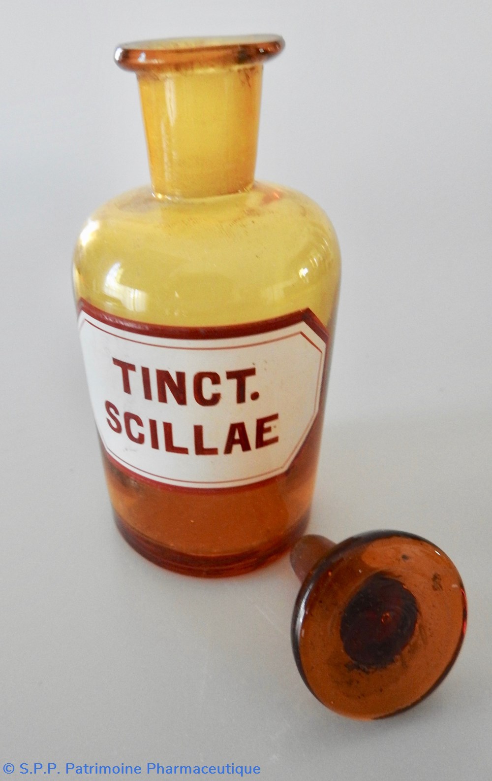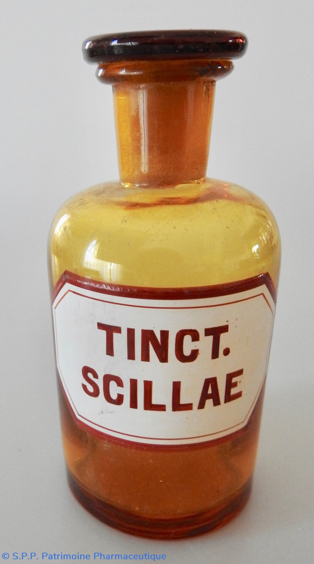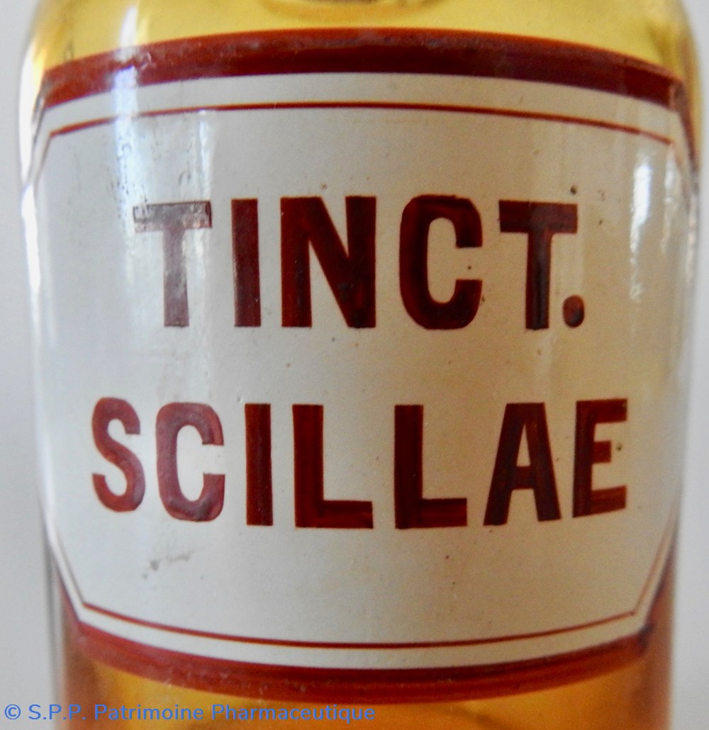 Étiquette imprimée fond blanc écriture bordeaux mentionnant "Tinct. Scillae"
