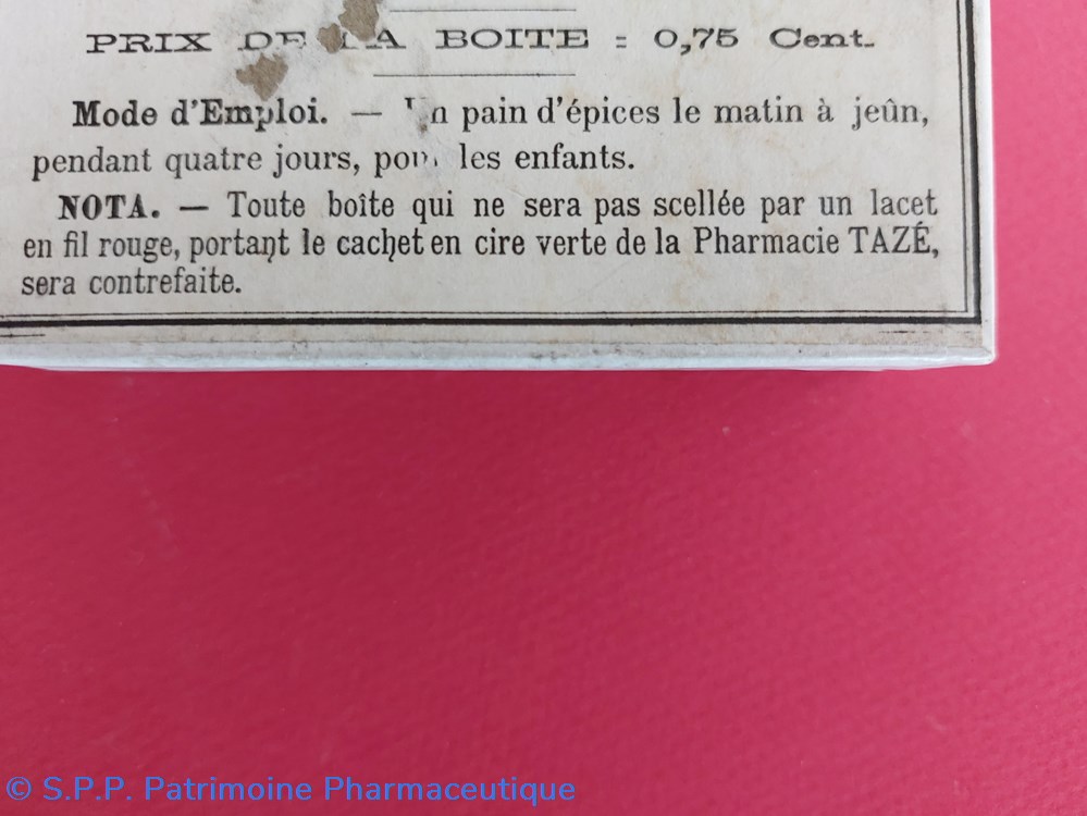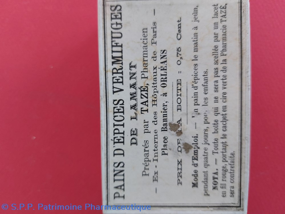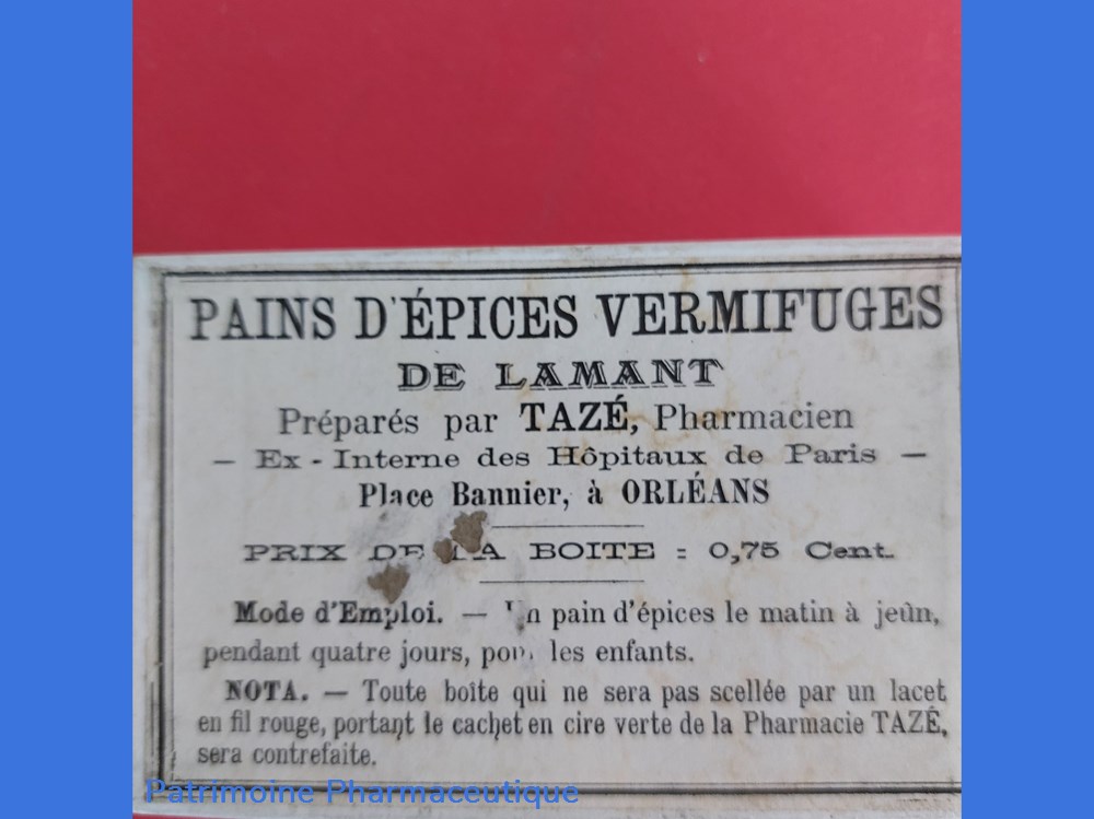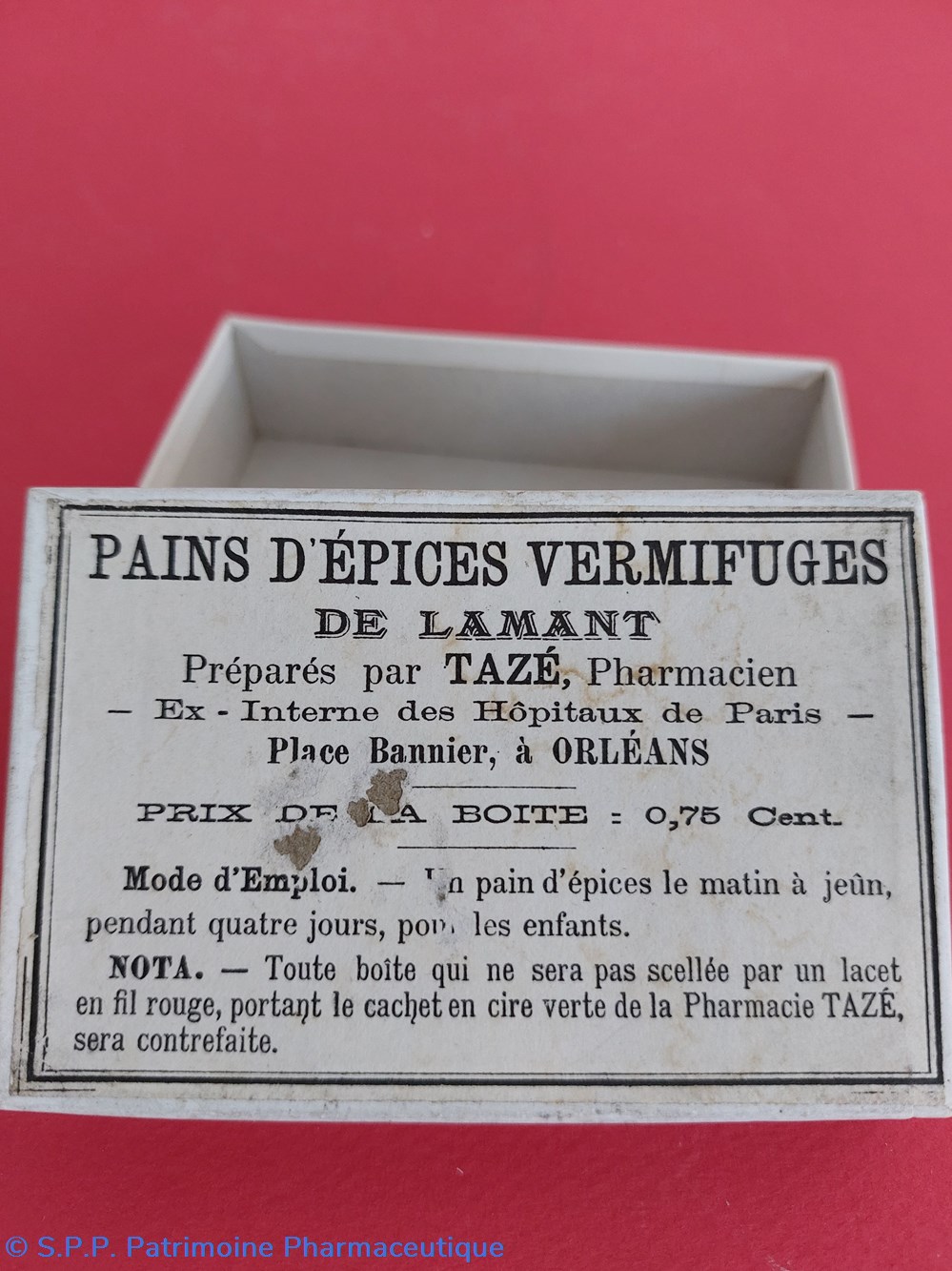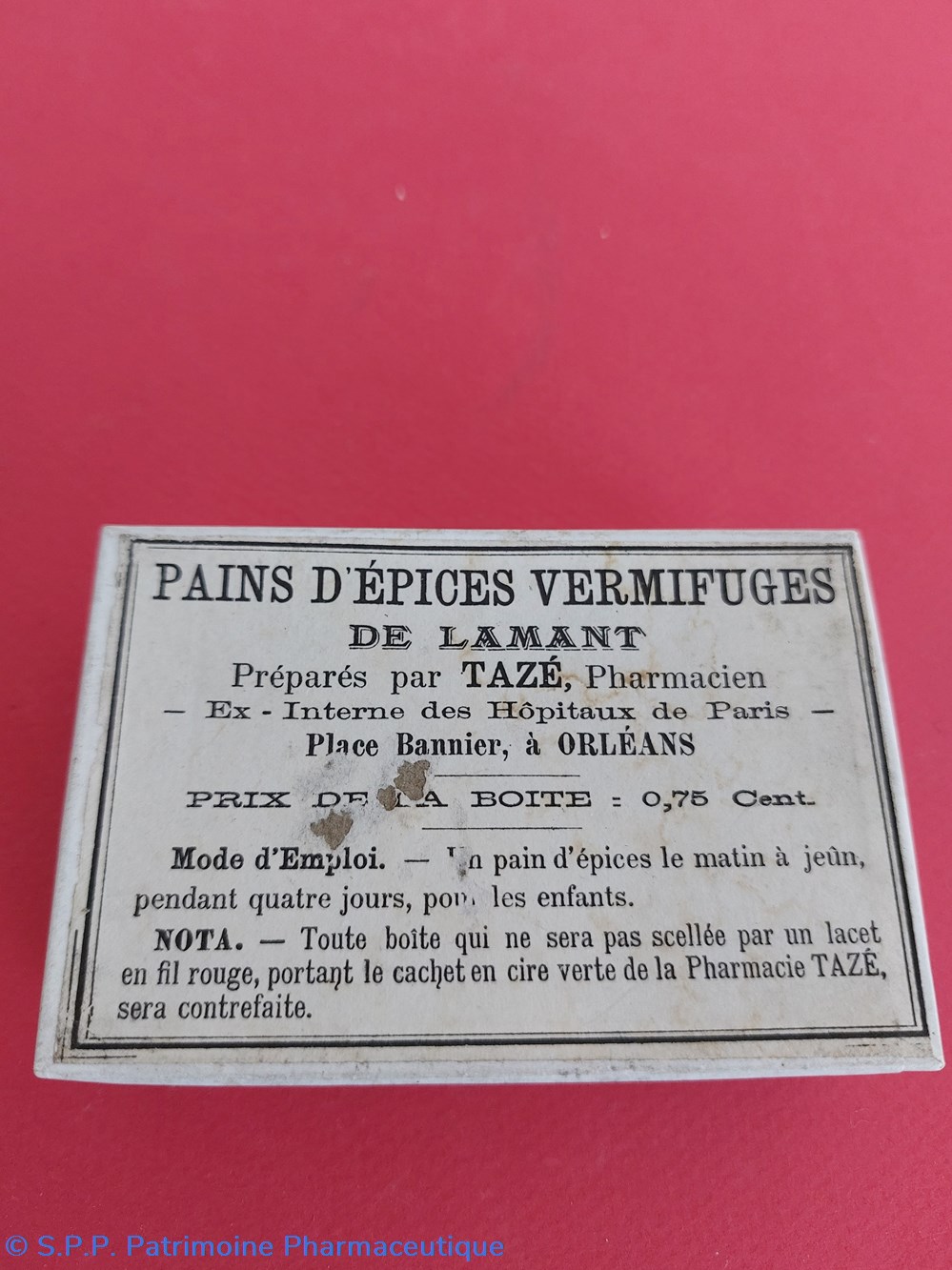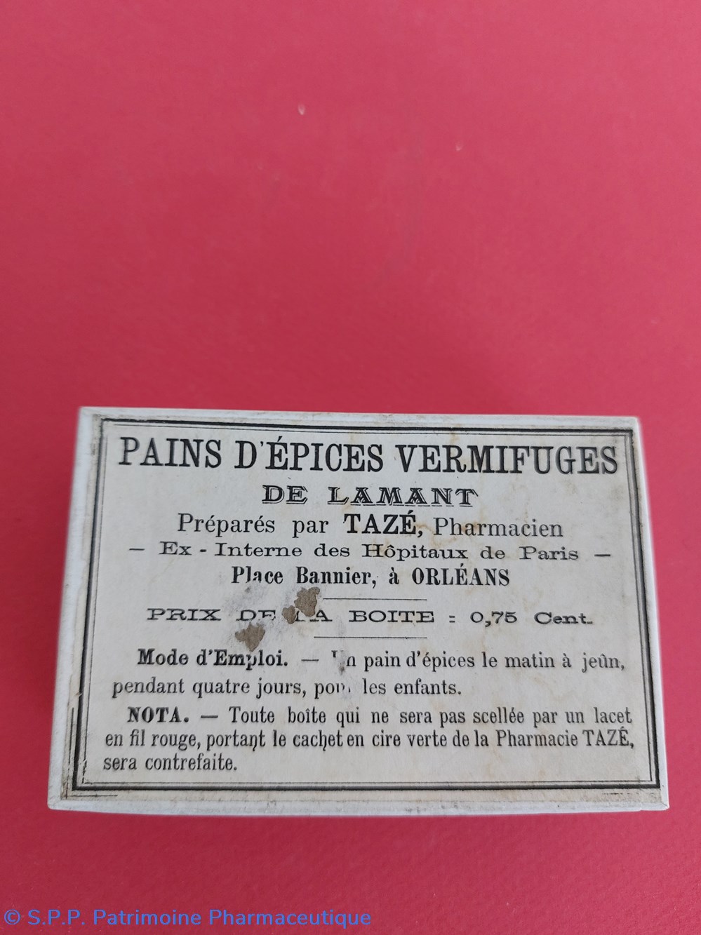 Boite vide en carton de "pains d'épices vermifuges de Lamant" préparés par Tazé pharmacien à Orléans. Dimensions 9.5 cm * 6.5 cm h 2.6 cm
