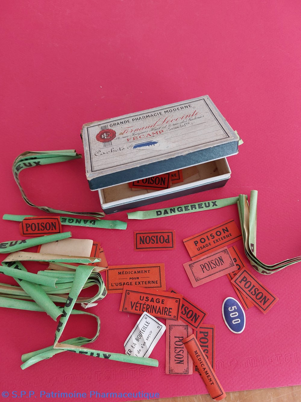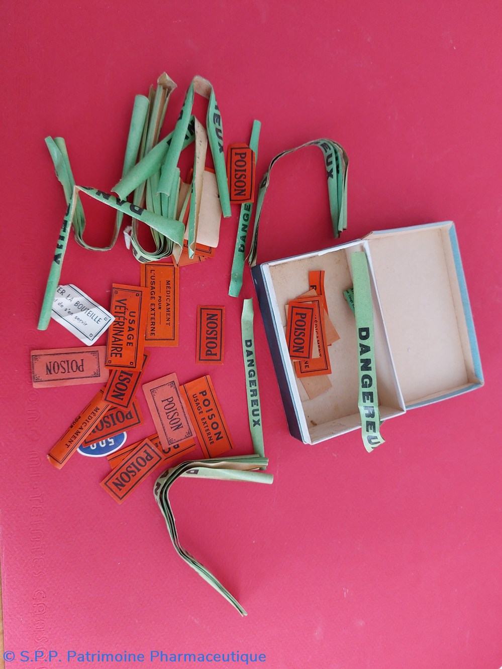contenant diverses étiquettes de précautions sanitaires " dangereux, poison,..."