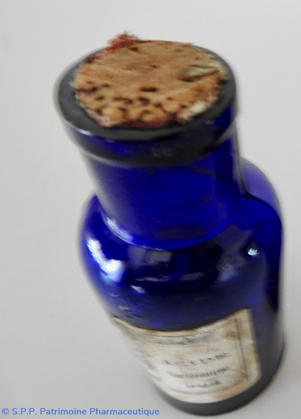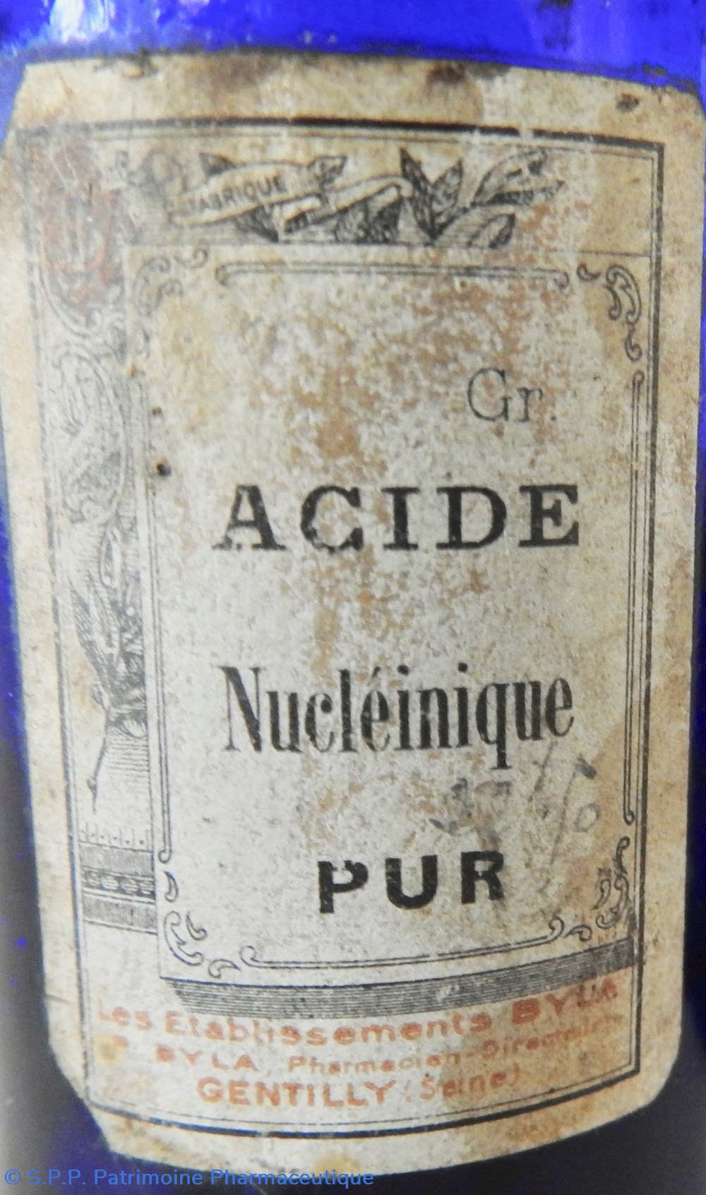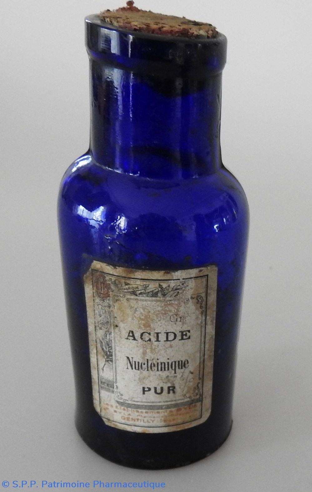 Flacon en verre bleu , fermé par un bouchon de liège. L'étiquette collée indique le contenu : "Acide Nucléinique Pur". Marque sous le récipient : 60. Marque sur la base : L.F.C. Le flacon est encore à moitié plein.