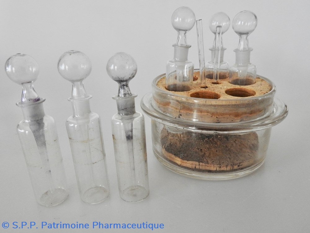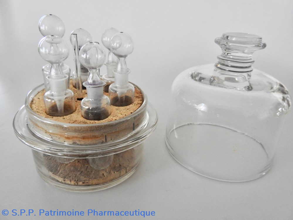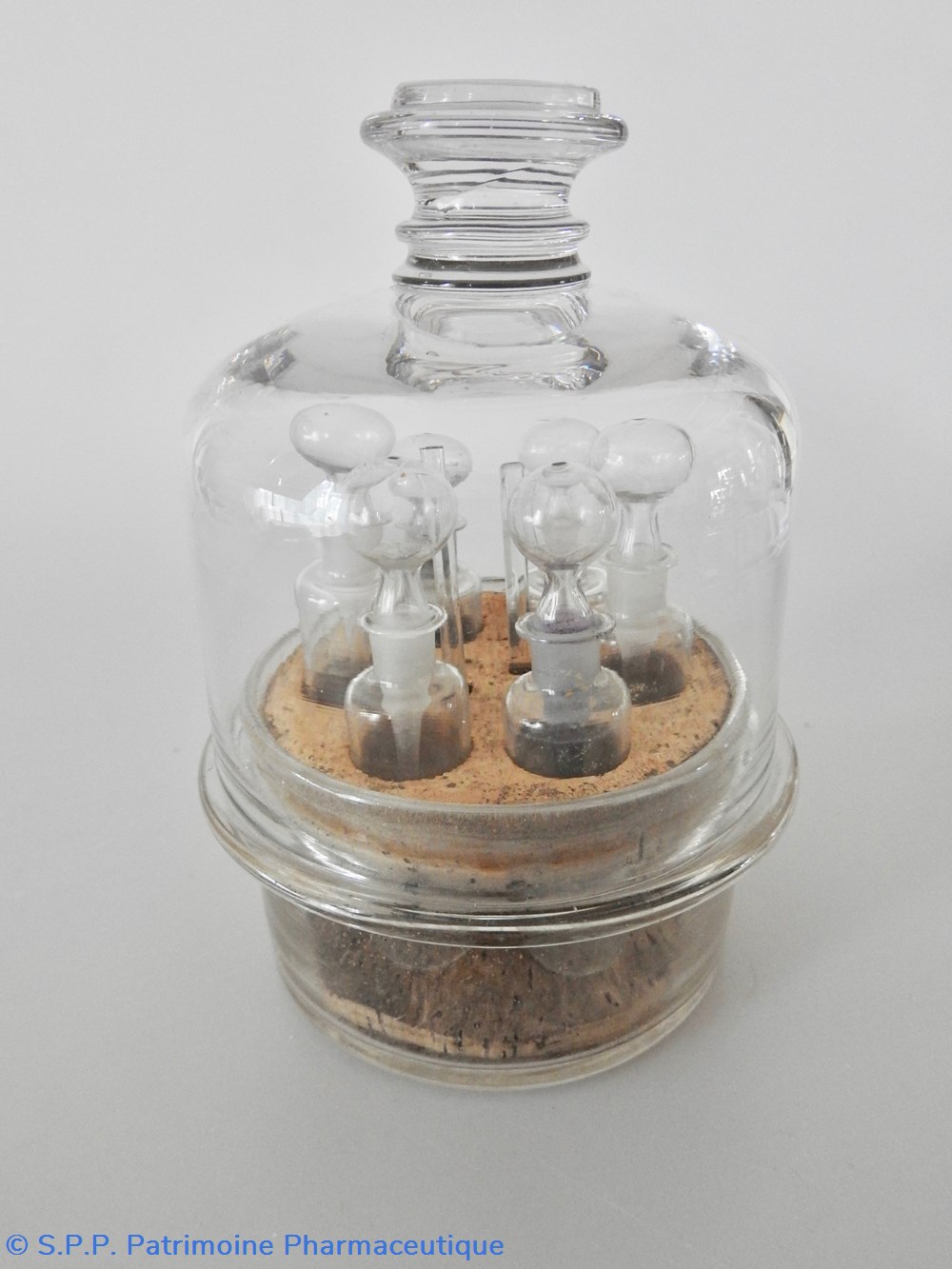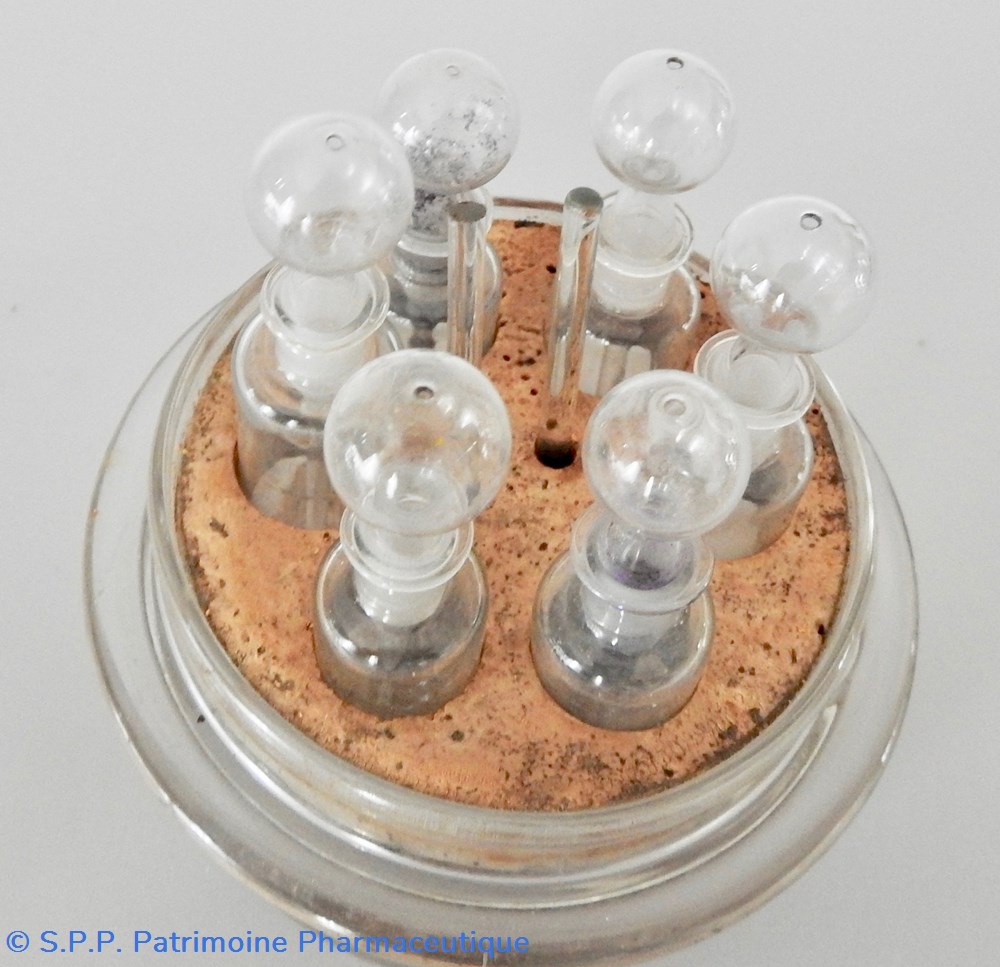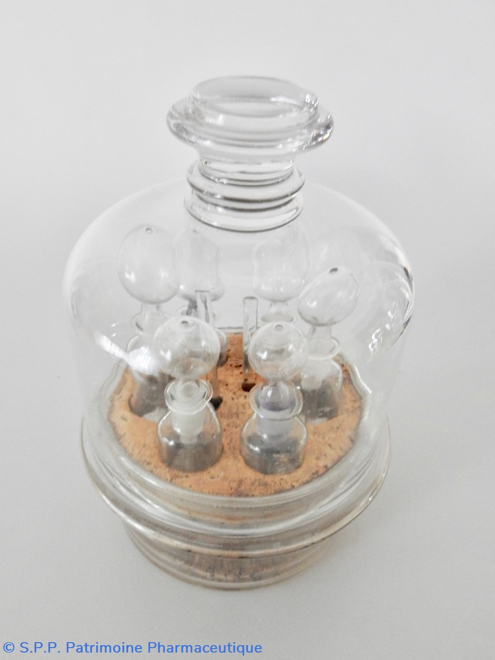 ..Rare cave à 6 flacons en verre soufflé. Les flacons ont des bouchons en verre soufflé se terminant par des stilligouttes. Ils sont enchâssés sur un disque en lège.. Les flacons eux-même reposent sur une assise en liège. Deux agitateurs en verre sont également enchâssés sur la plaque de lège. Un couvercle en forme de cloche recouvre les récipients.