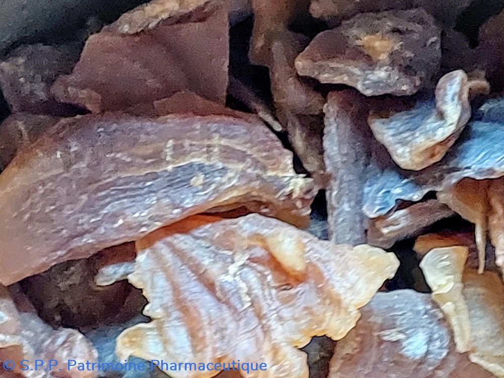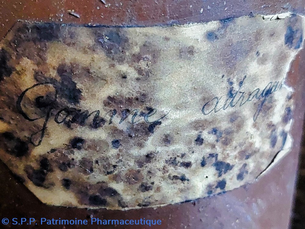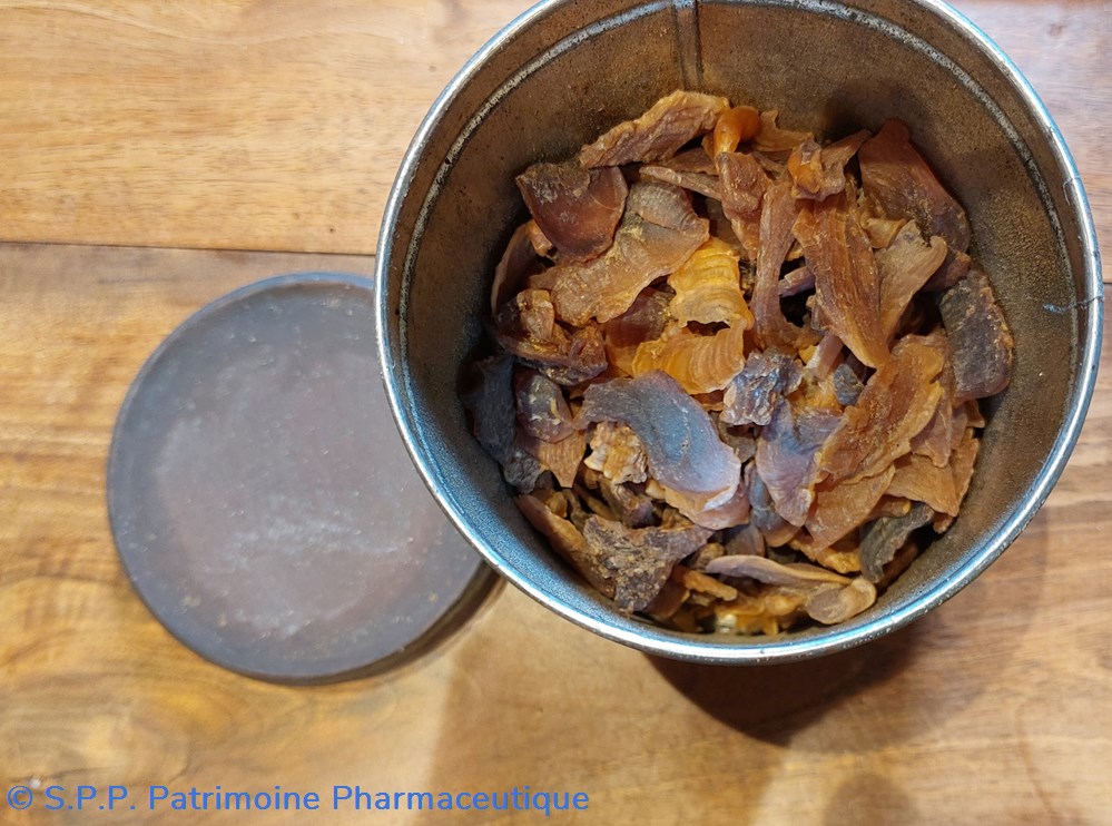 Gomme ADRAGANTE dans une boîte métallique rouillée avec une étiquette manuscrite.
