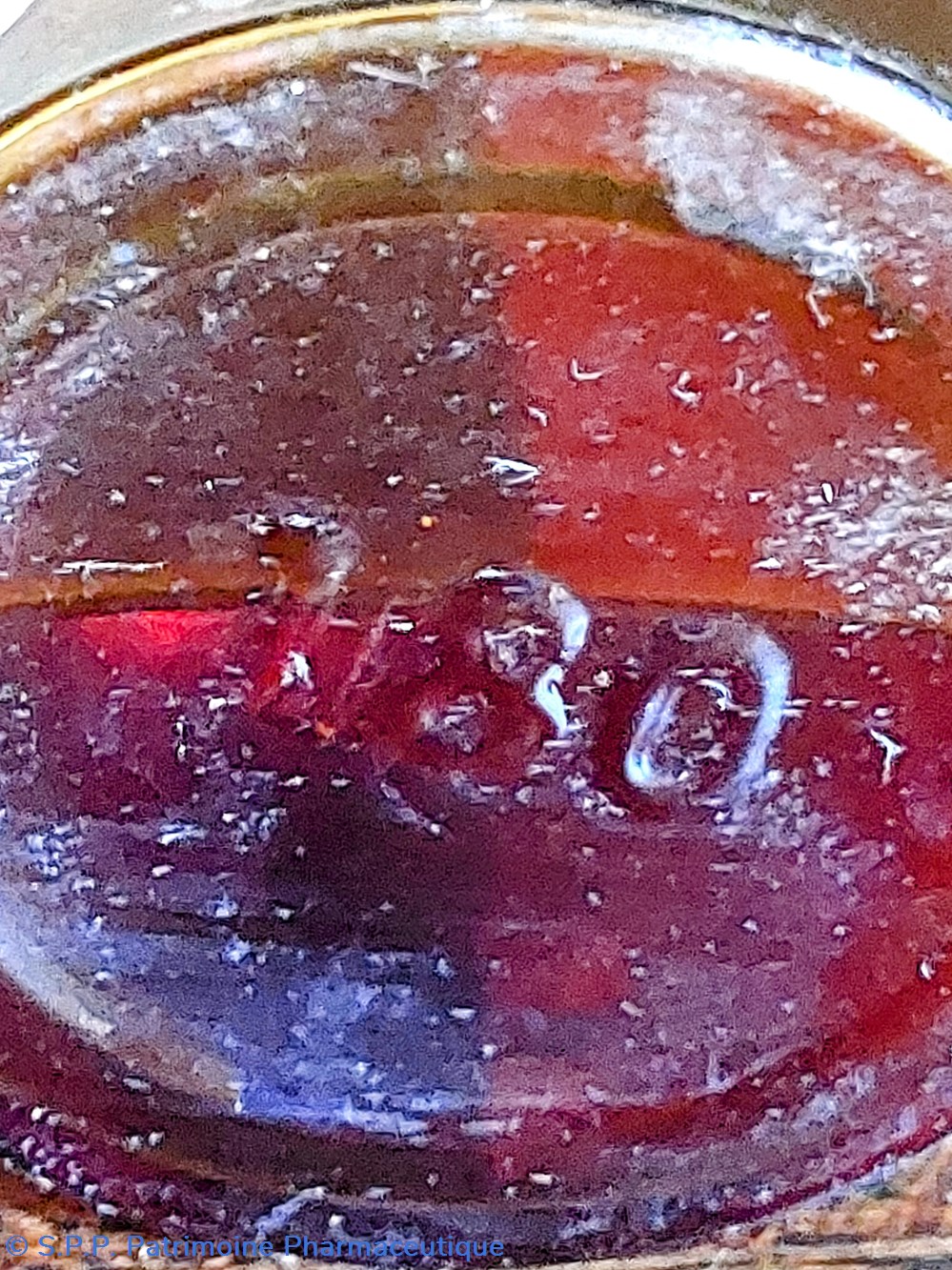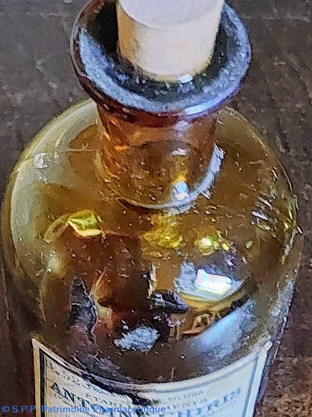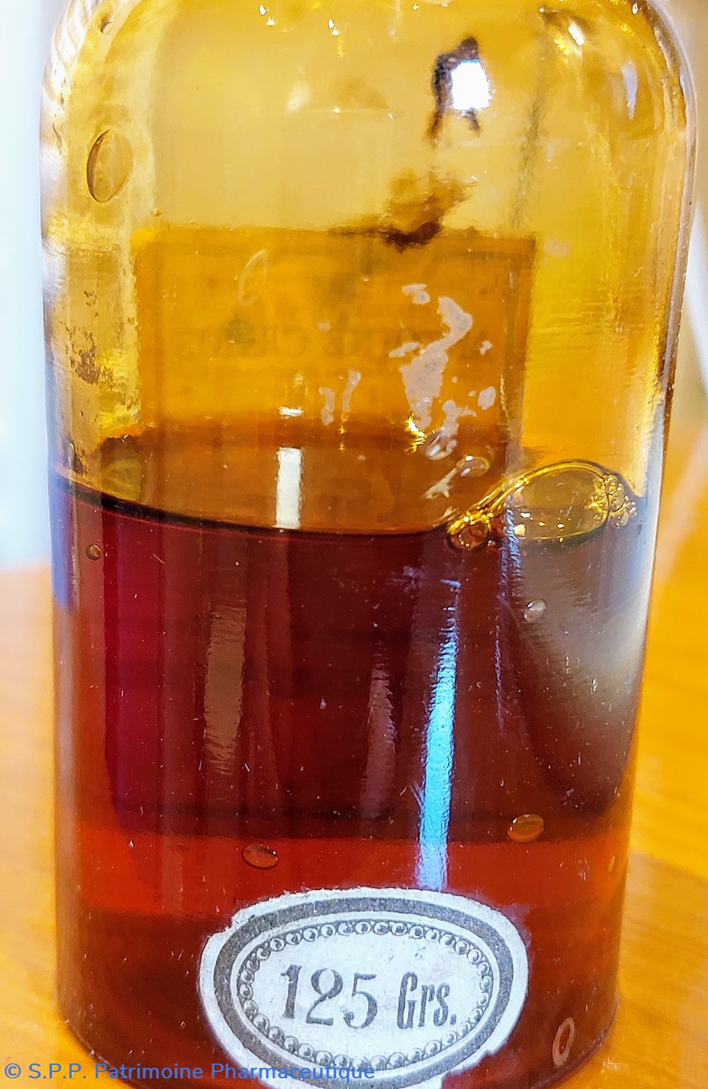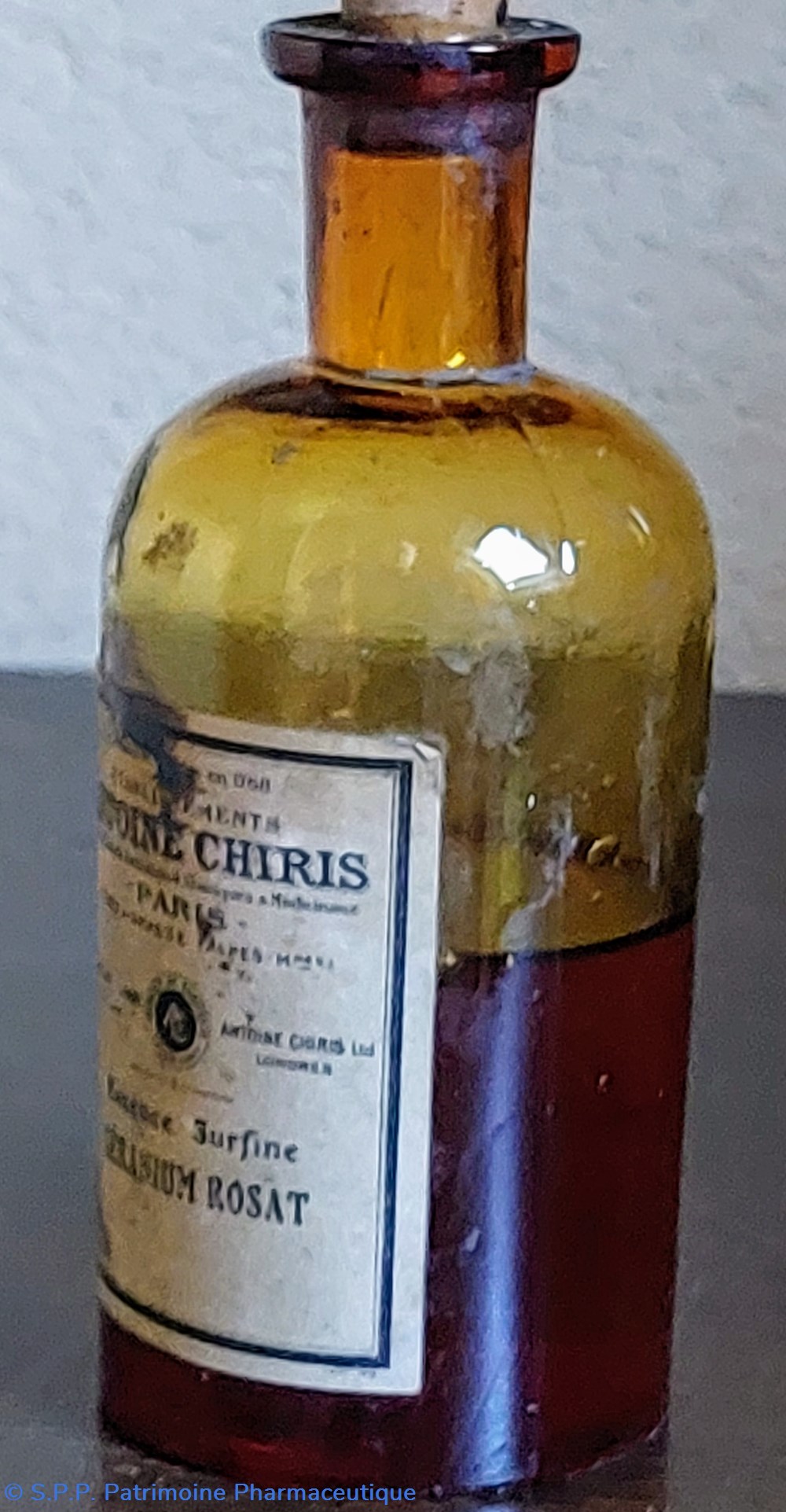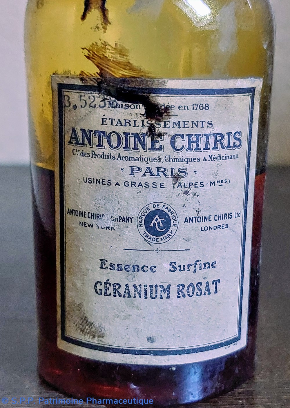 Petit flacon en verre ambré fermé par un bouchon en liège et à demi rempli de Essence Surfine de GÉRANIUM ROSAT Hauteur 12,5 cm Diamètre de la base 5,5 cm. Marque sous le flacon "180".