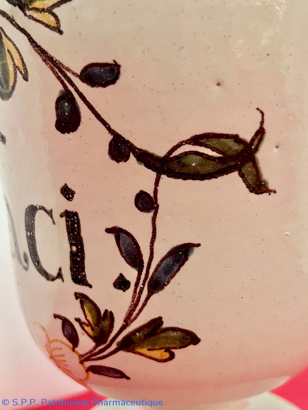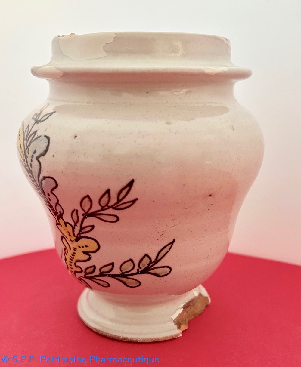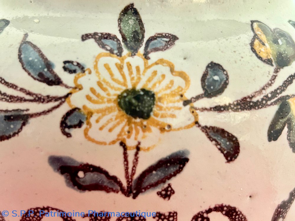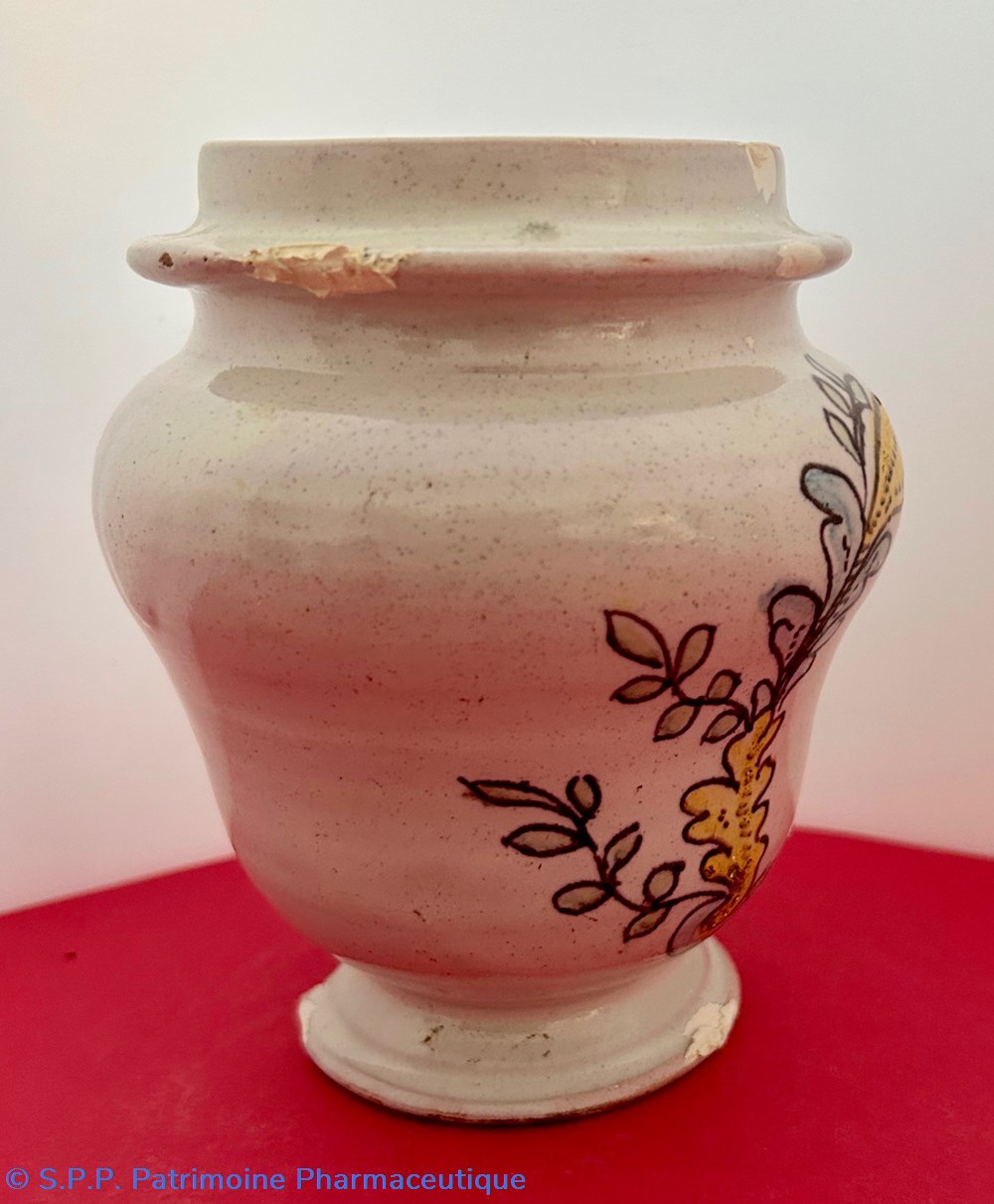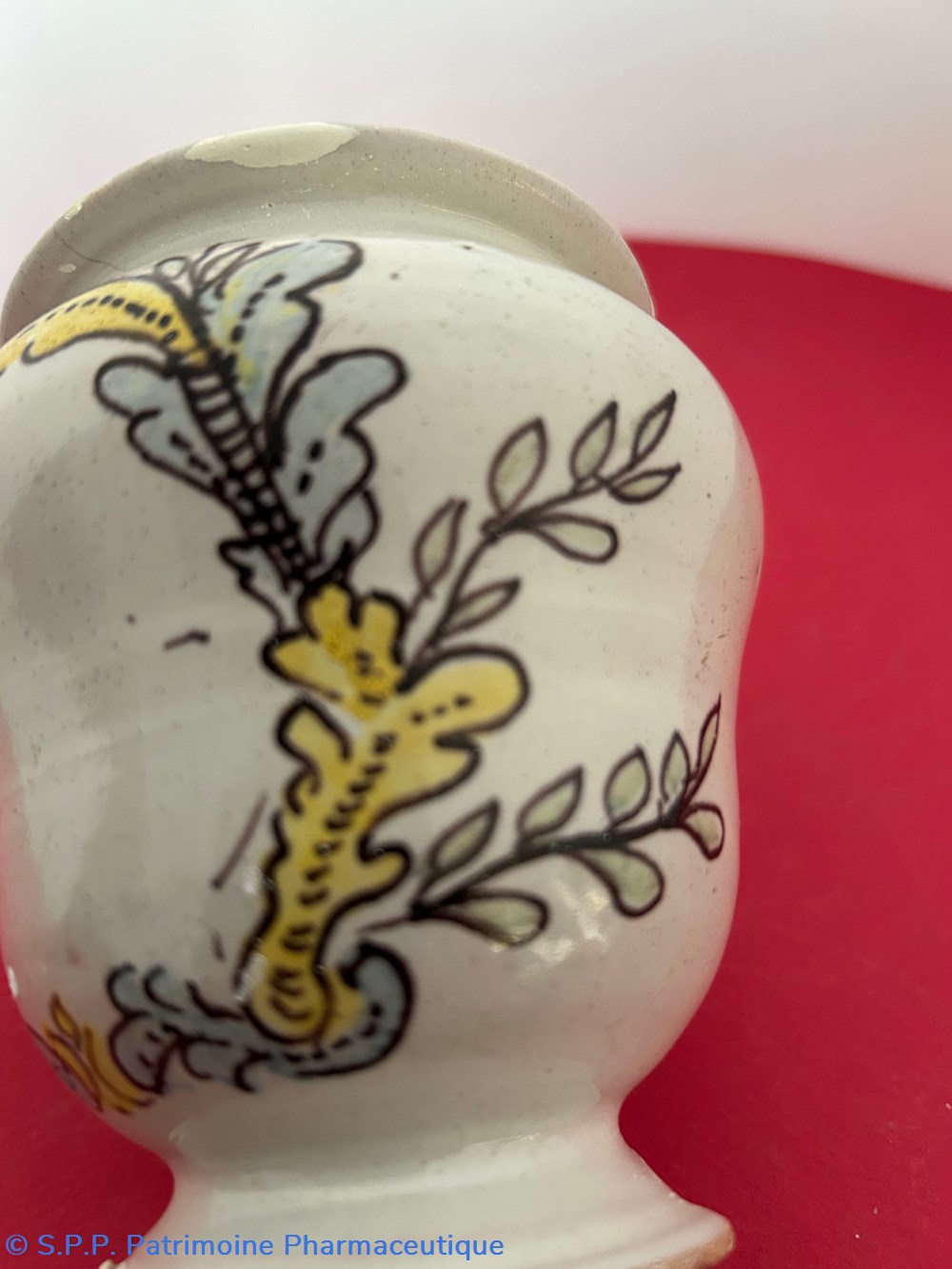 ROUEN ou BORDEAUX ? - Pot canongalbé à décor de grand feu polychrome d'une frise ondoyante de fleurs et de feuillage formant un cartouche. Dans ce cartouche une inscription : " Theriaca Andromaci "