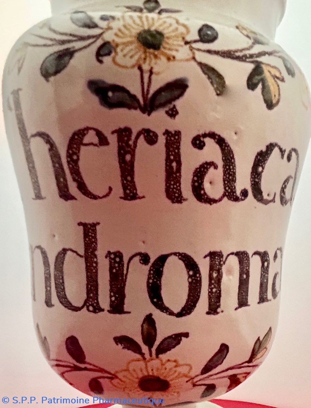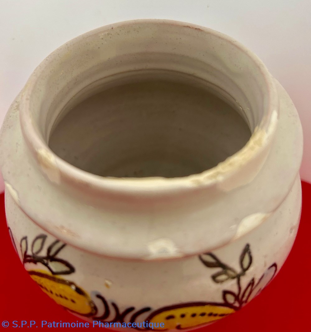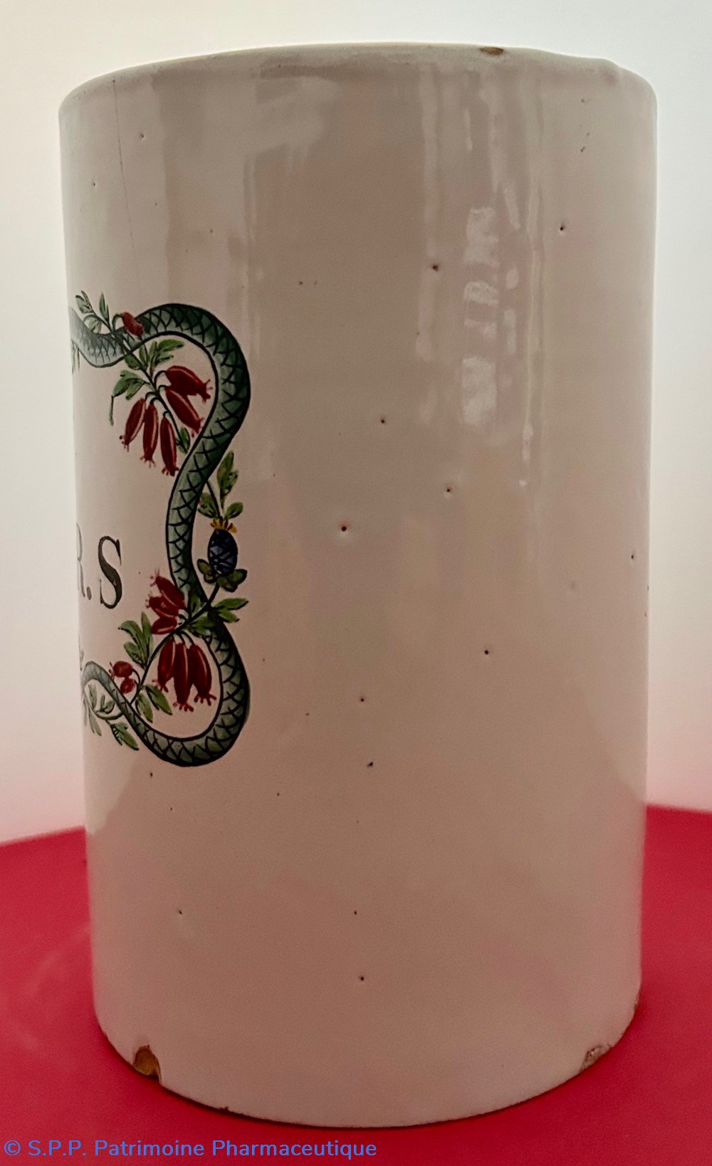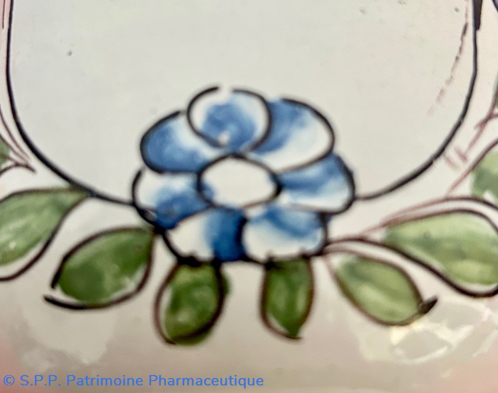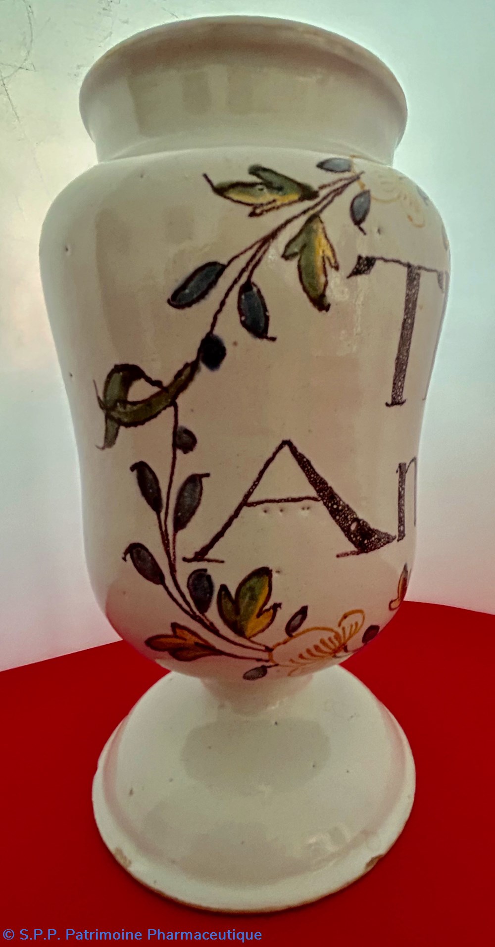 ROUEN ou BORDEAUX ? - Pot canongalbé à décor de grand feu polychrome d'une frise ondoyante de fleurs et de feuillage formant un cartouche. Dans ce cartouche une inscription : " Theriaca Andromaci "