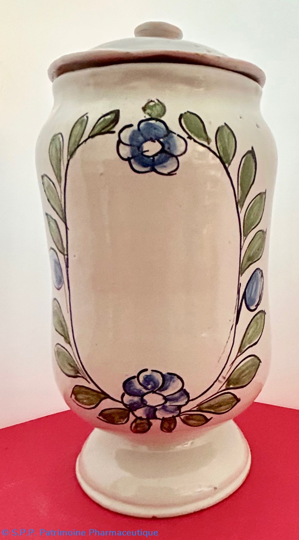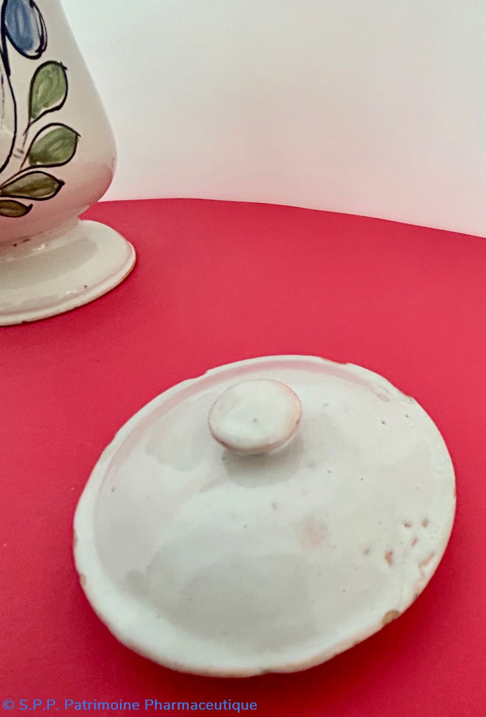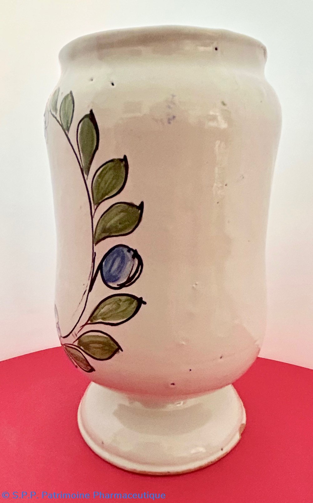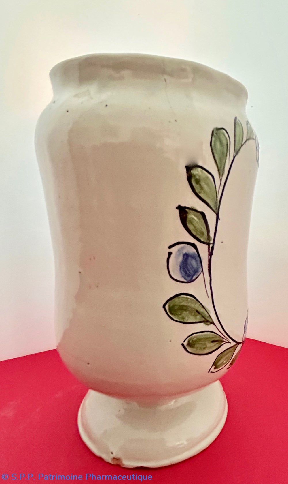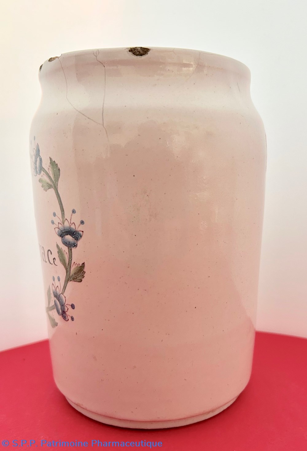 ROUEN ou BORDEAUX ? - Pot canongalbé à décor de grand feu polychrome d'une frise ondoyante de fleurs et de feuillage formant un cartouche. Dans ce cartouche une inscription : " Theriaca Andromaci "