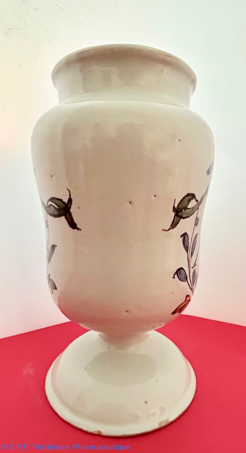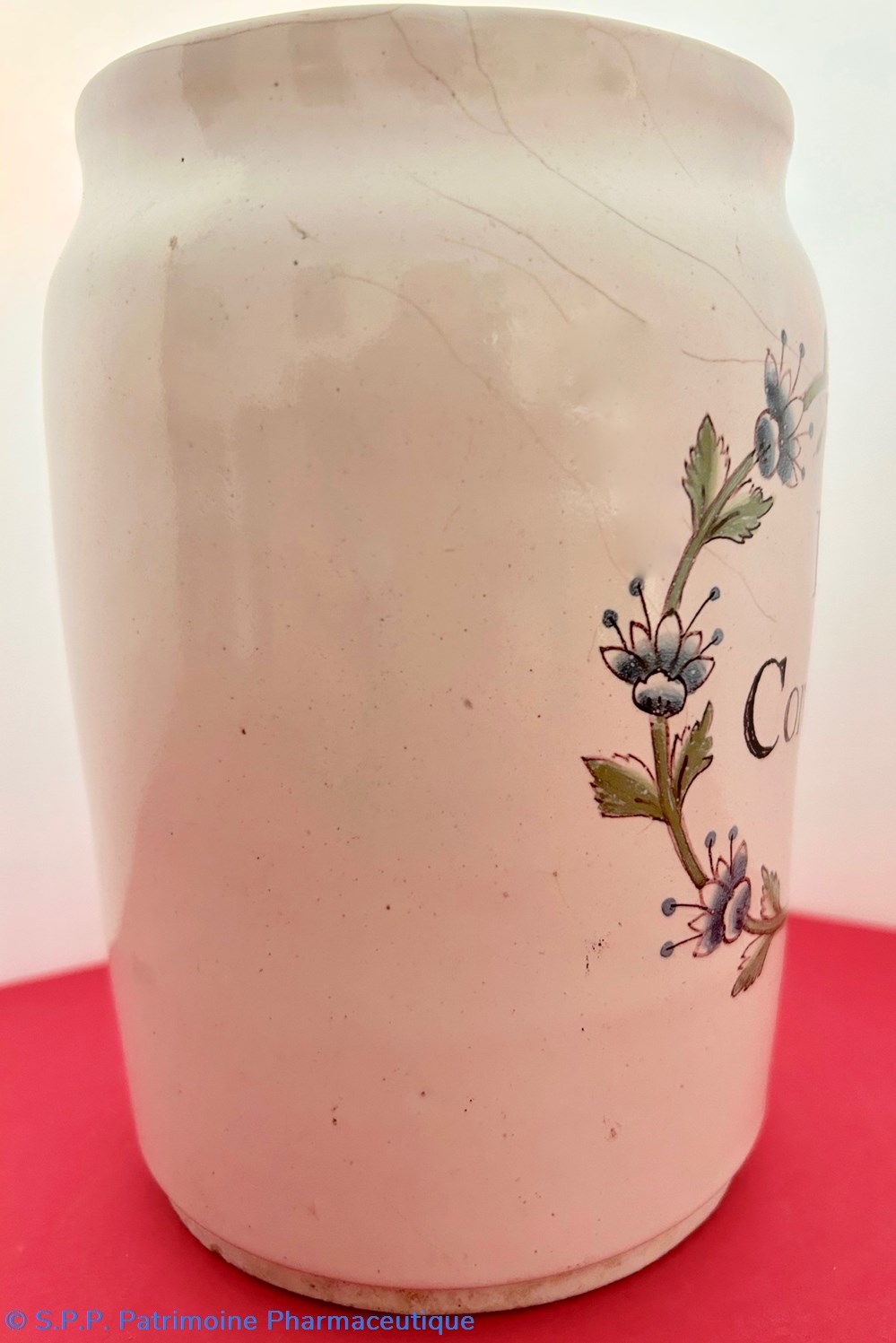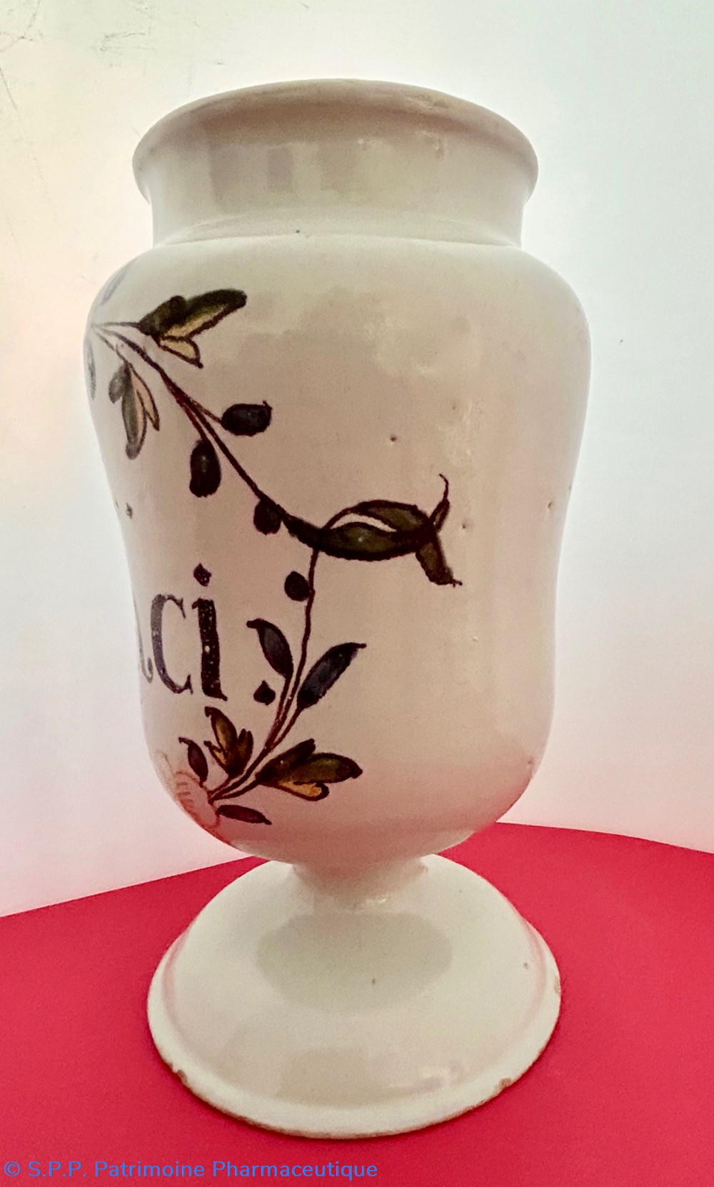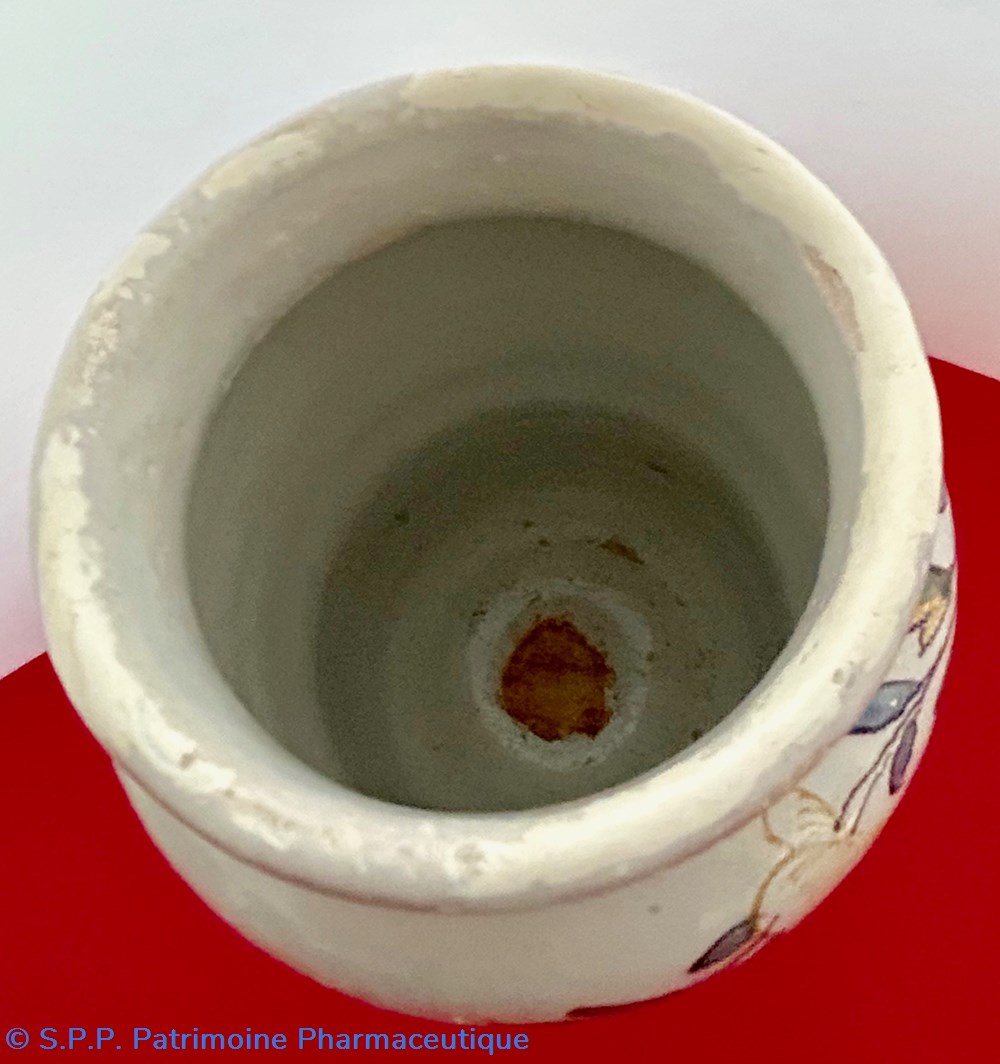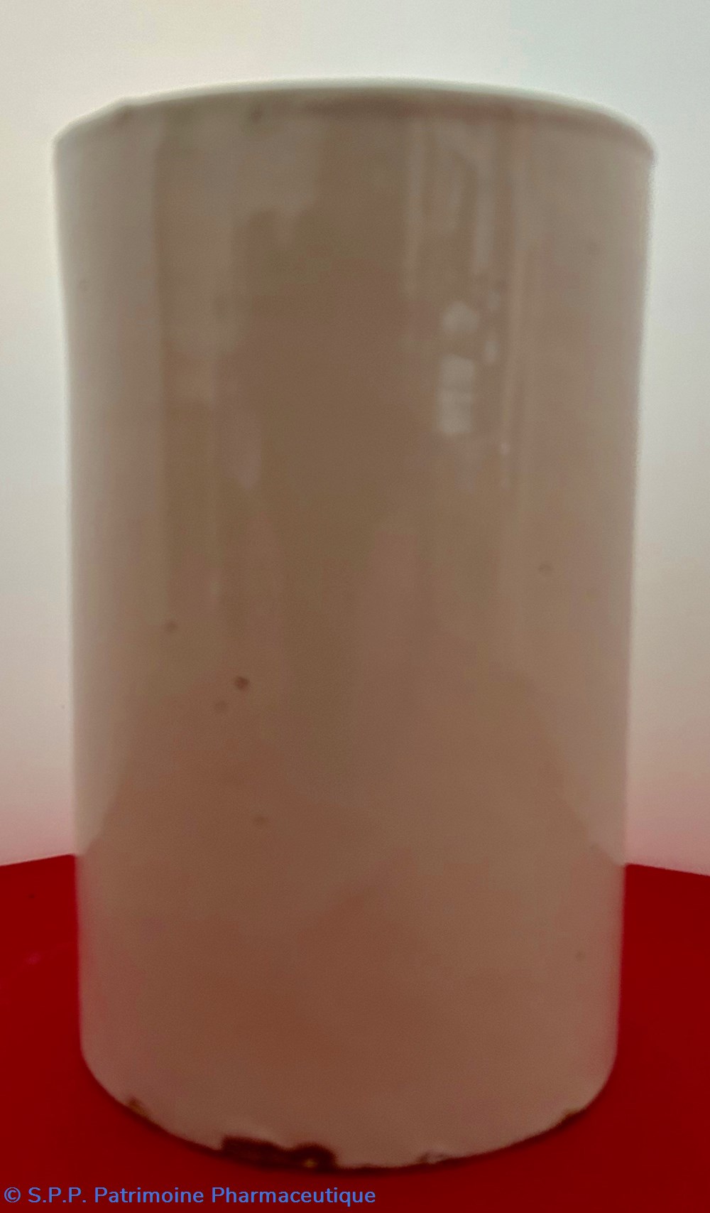 ROUEN ou BORDEAUX ? - Pot canongalbé à décor de grand feu polychrome d'une frise ondoyante de fleurs et de feuillage formant un cartouche. Dans ce cartouche une inscription : " Theriaca Andromaci "