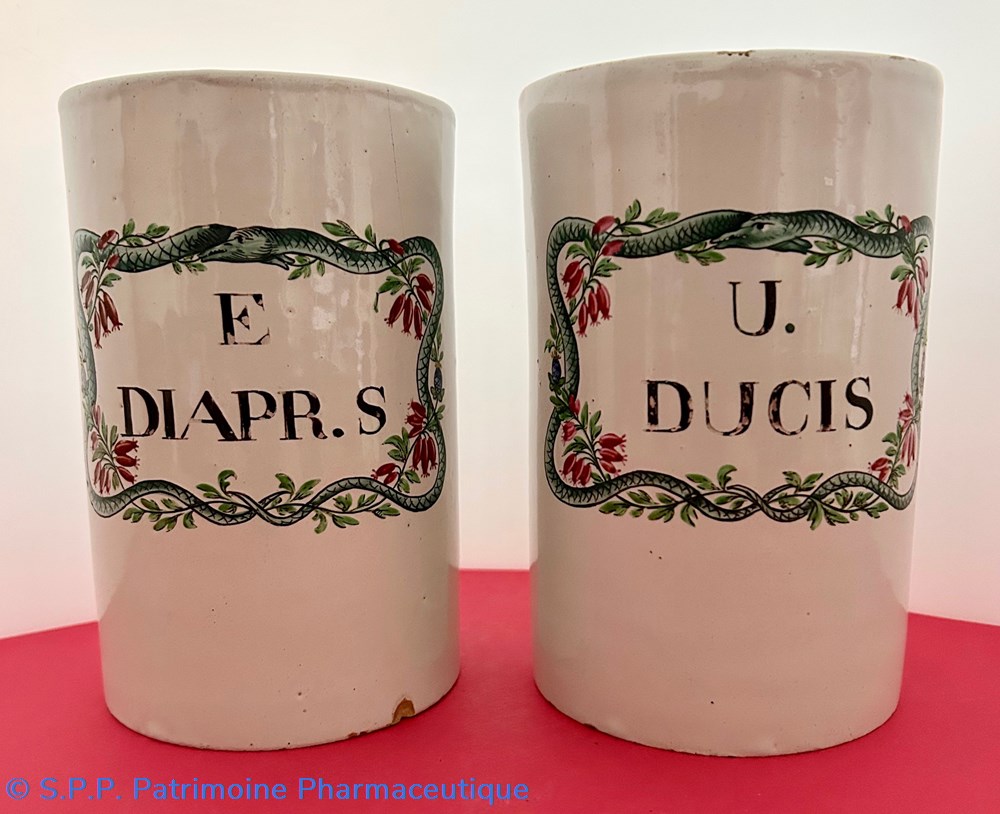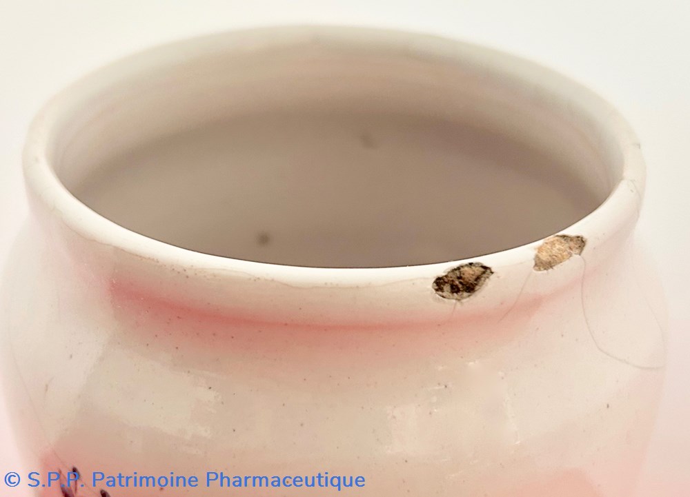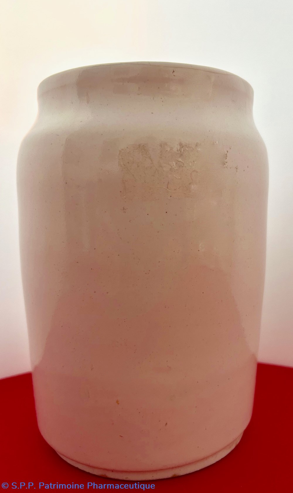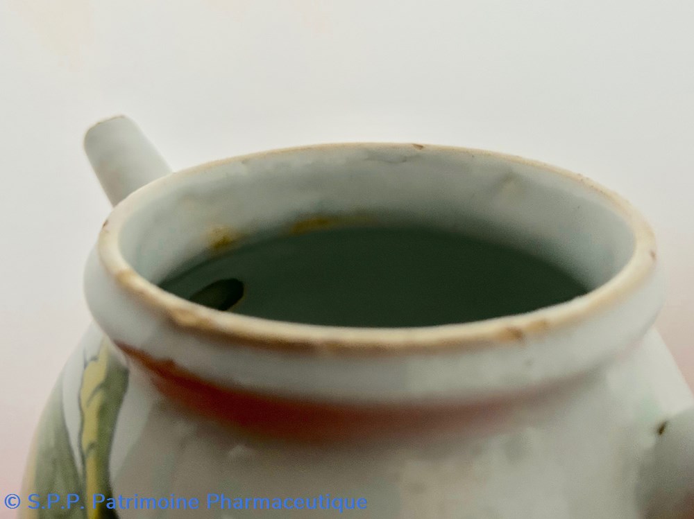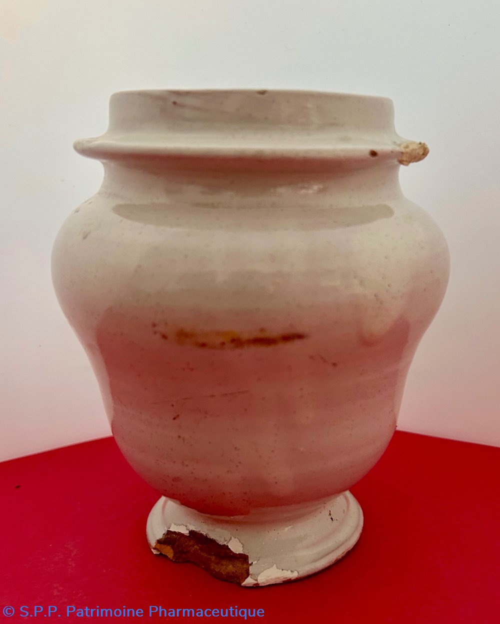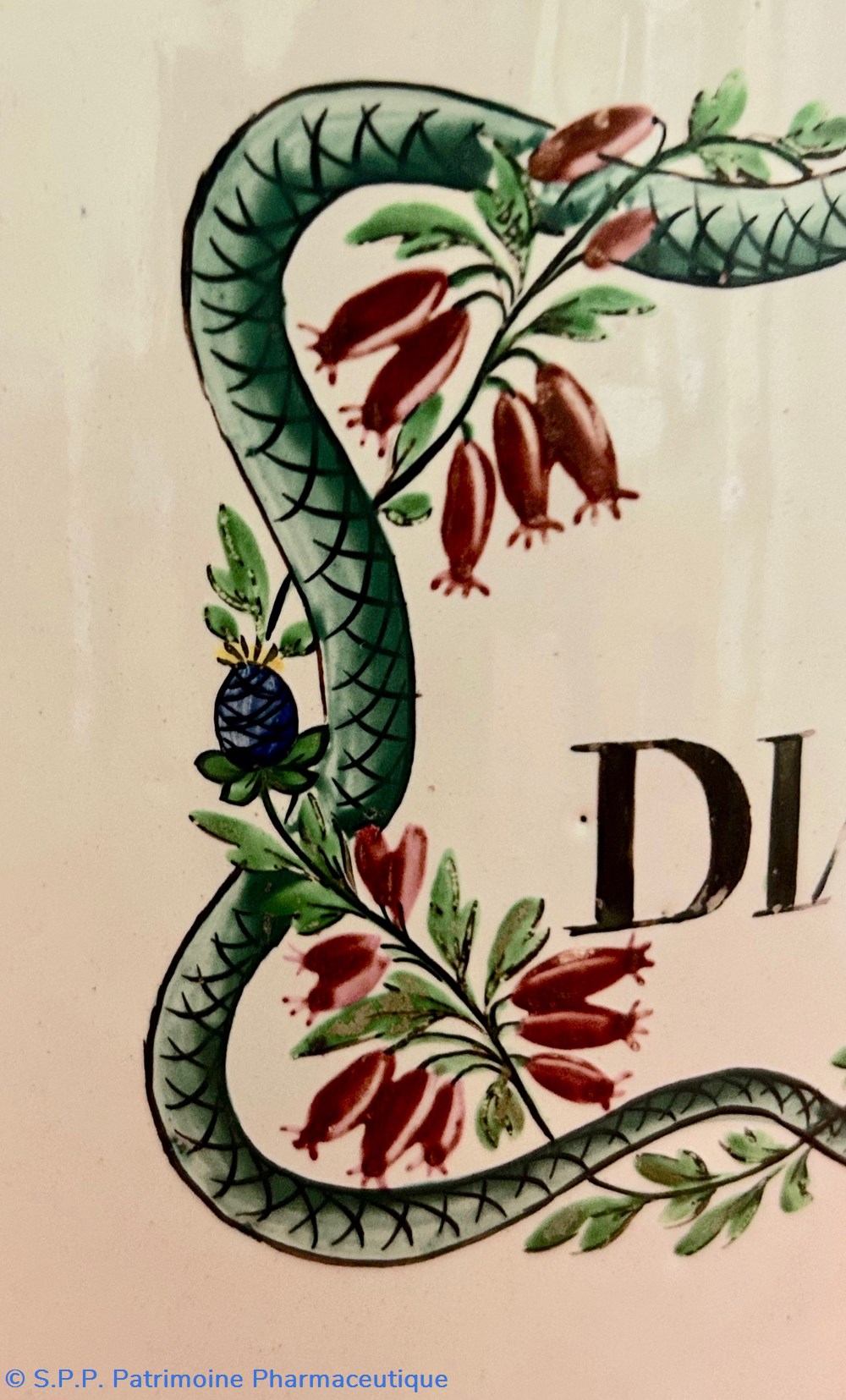 ROUEN ou BORDEAUX ? - Pot canongalbé à décor de grand feu polychrome d'une frise ondoyante de fleurs et de feuillage formant un cartouche. Dans ce cartouche une inscription : " Theriaca Andromaci "