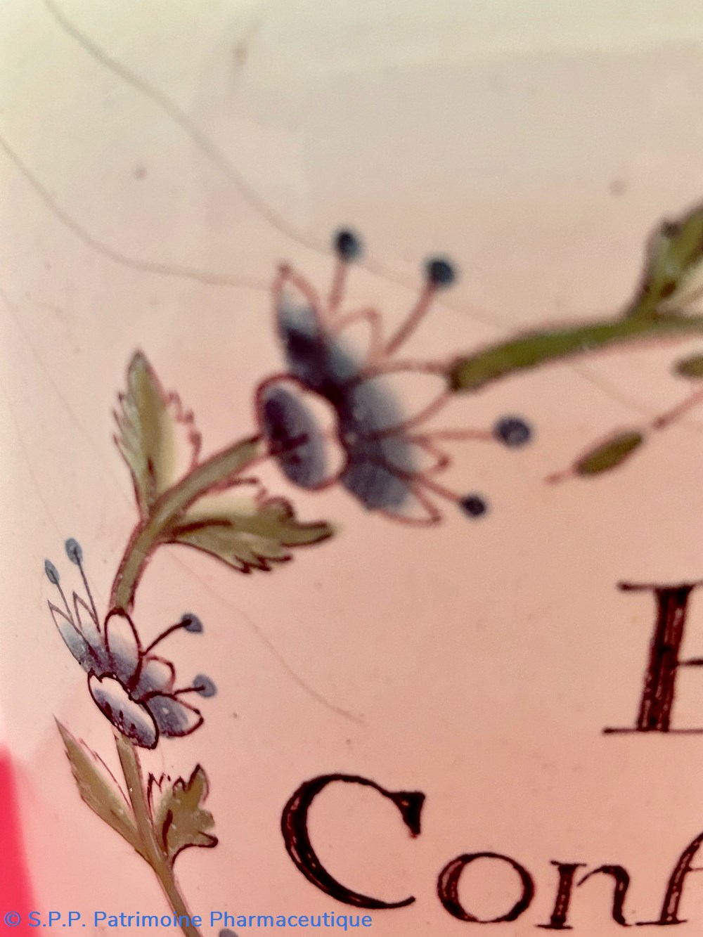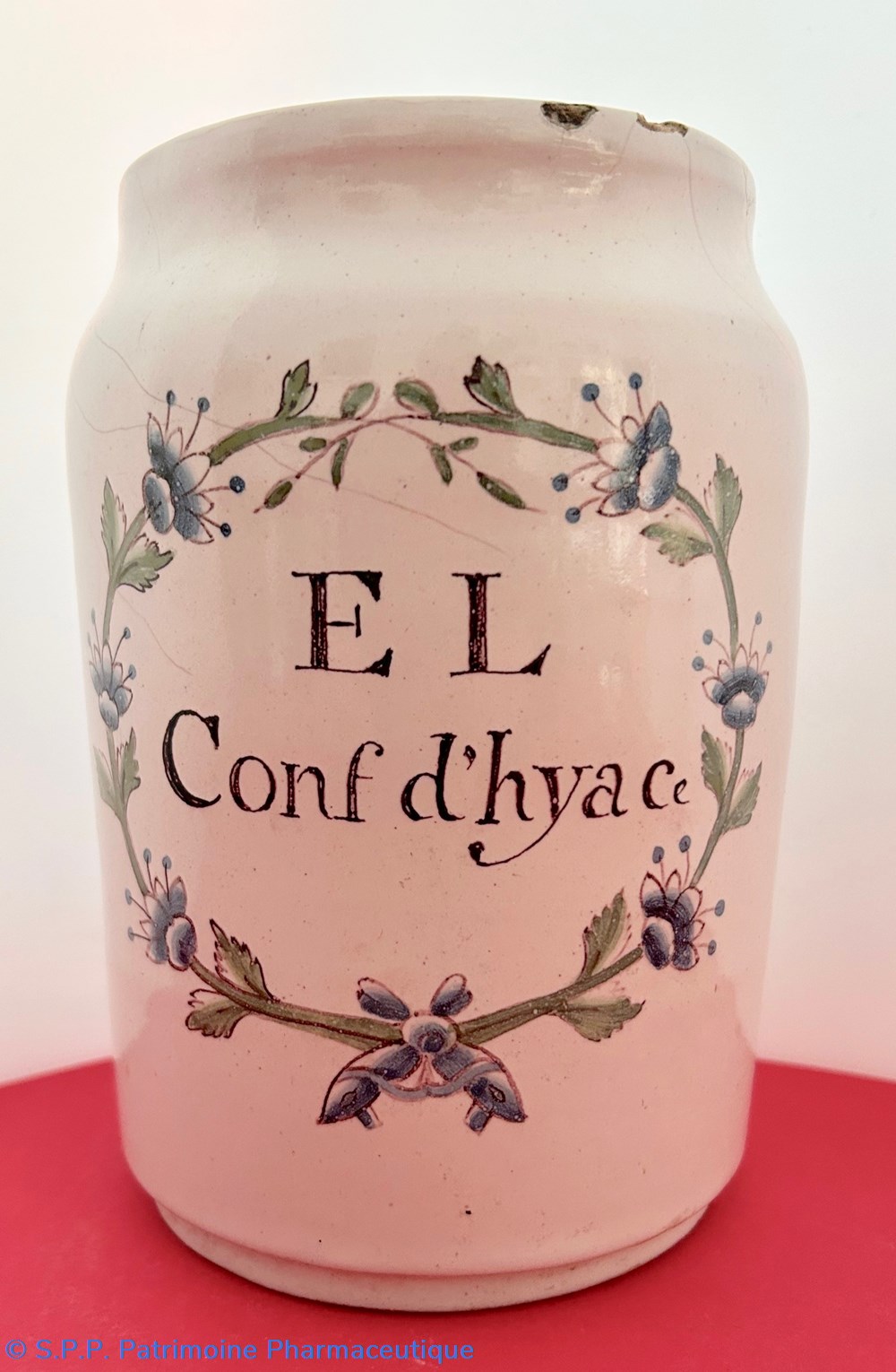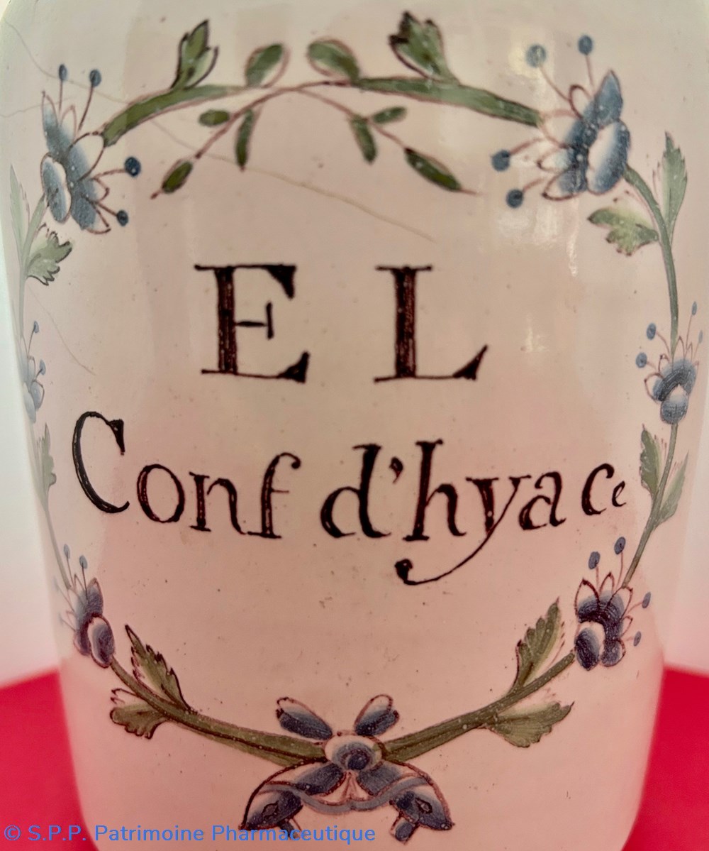 ? - Pot droit à décor de grand feu polychrome d'une guirlande de bleuets nouée d'un noeud de ruban. Inscription dans le cartouche : " E L Conf d'hyace "