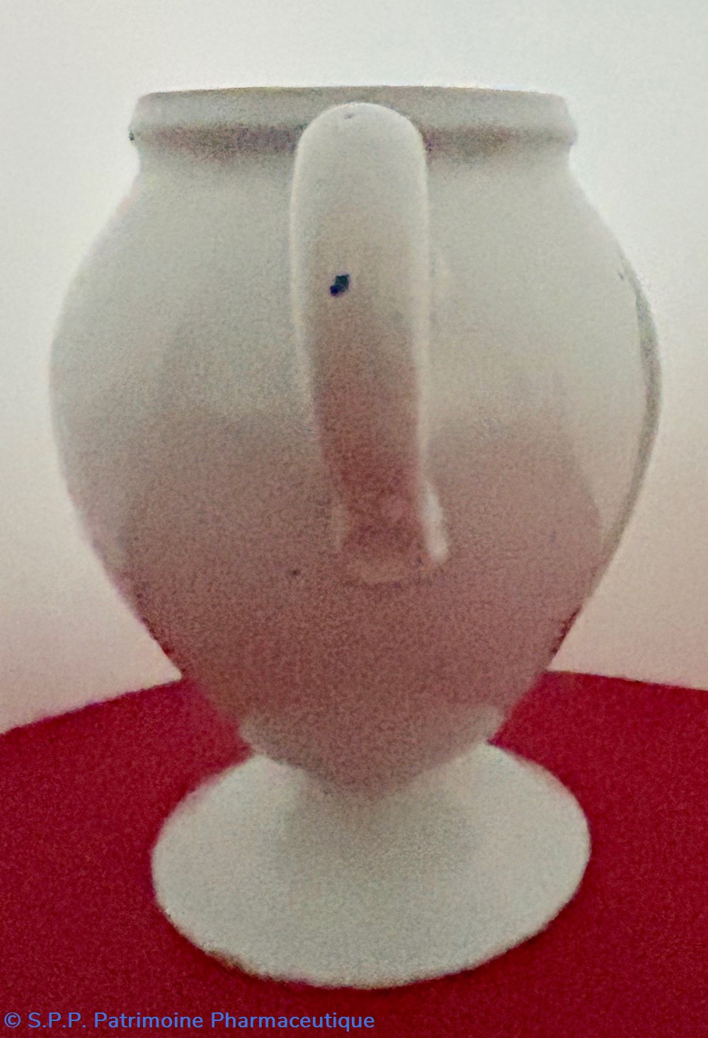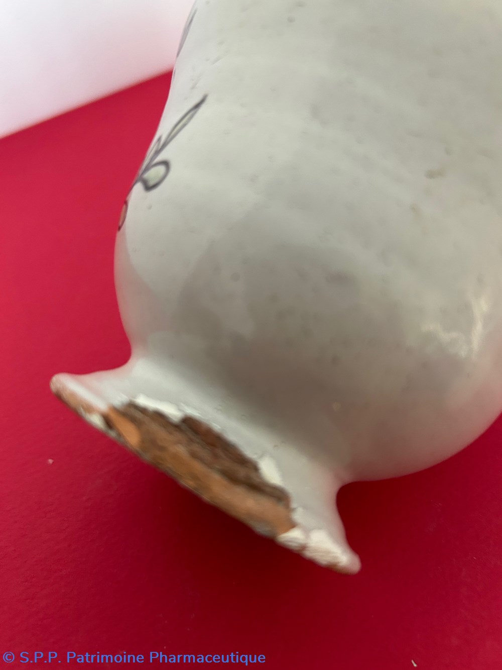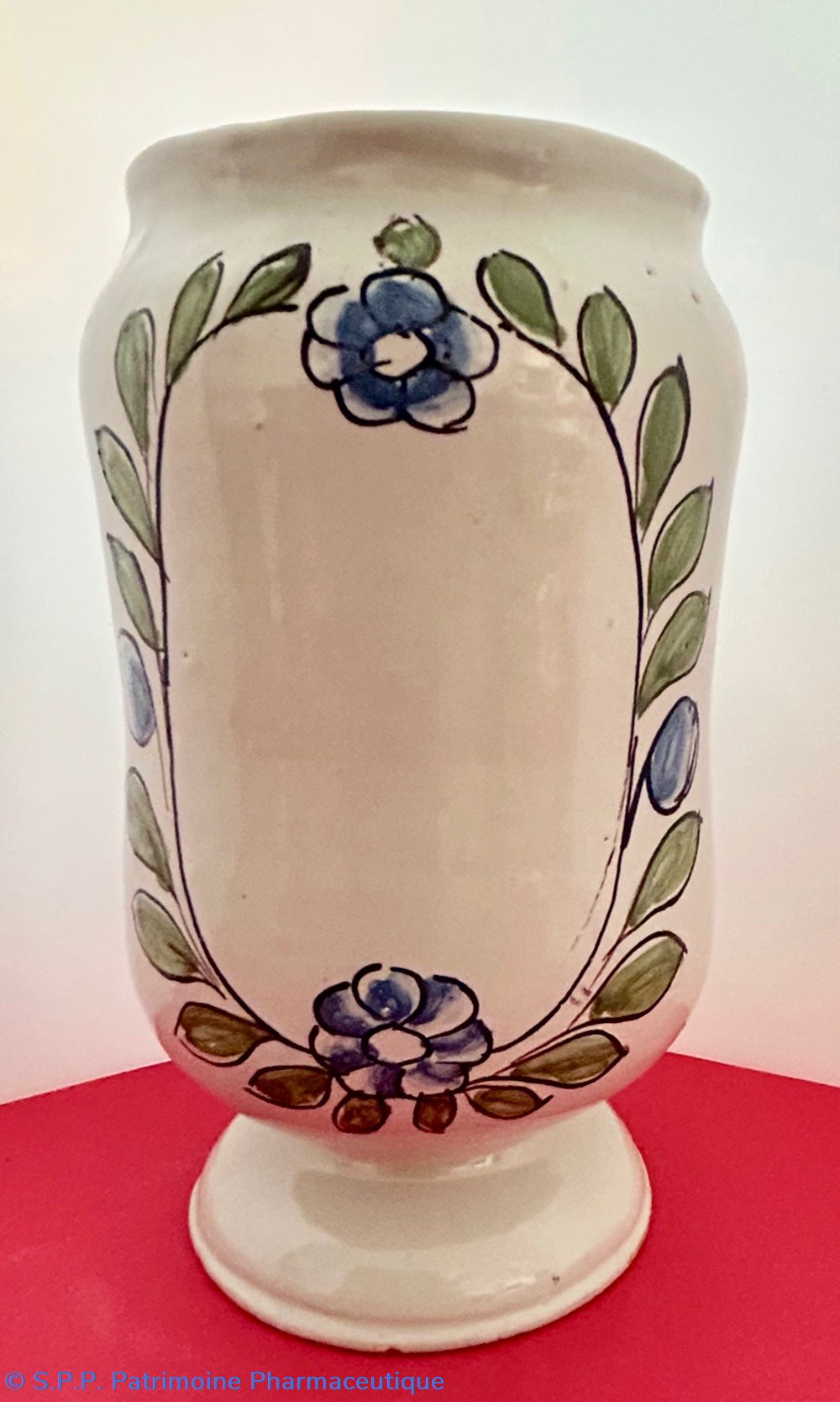 ? - Pot droit à décor de grand feu polychrome d'une guirlande de bleuets nouée d'un noeud de ruban. Inscription dans le cartouche : " E L Conf d'hyace "