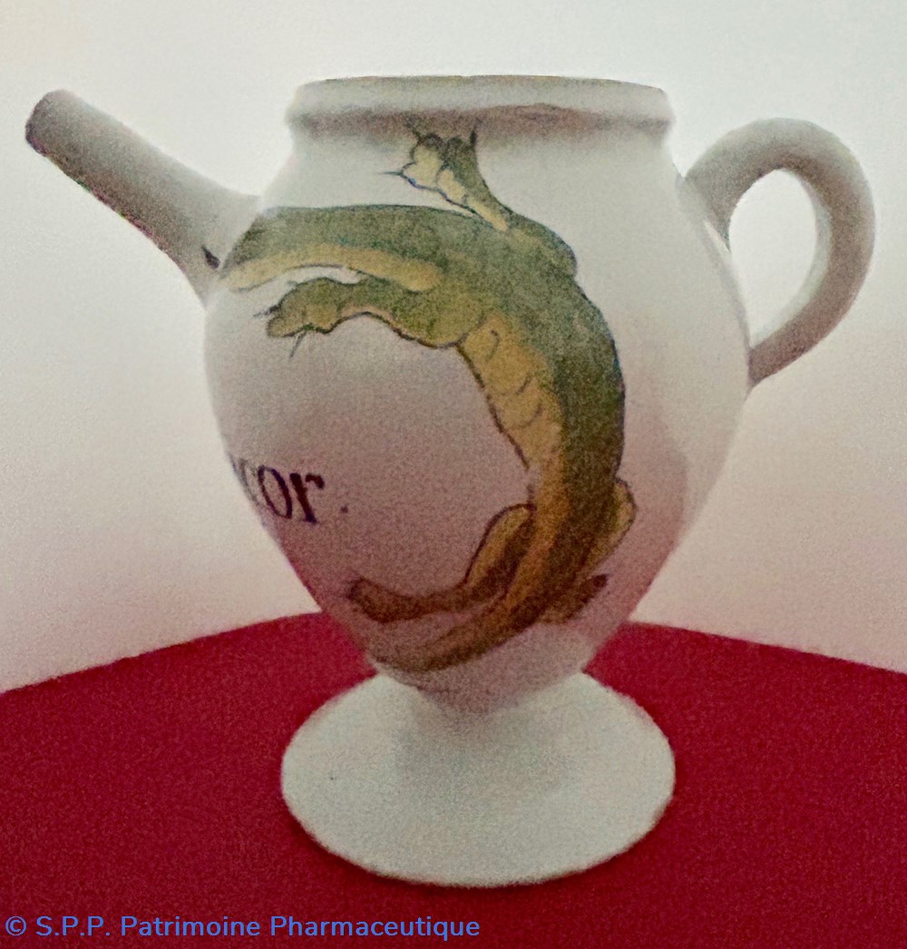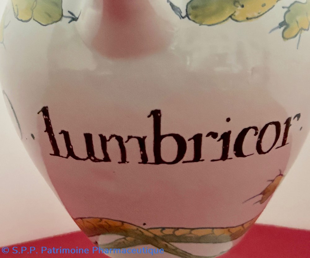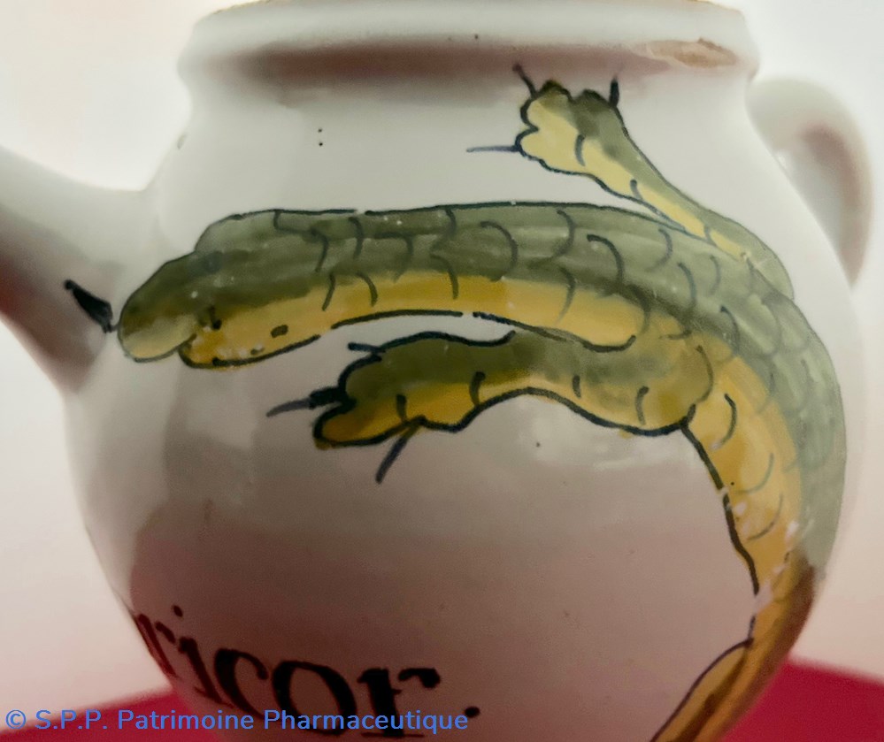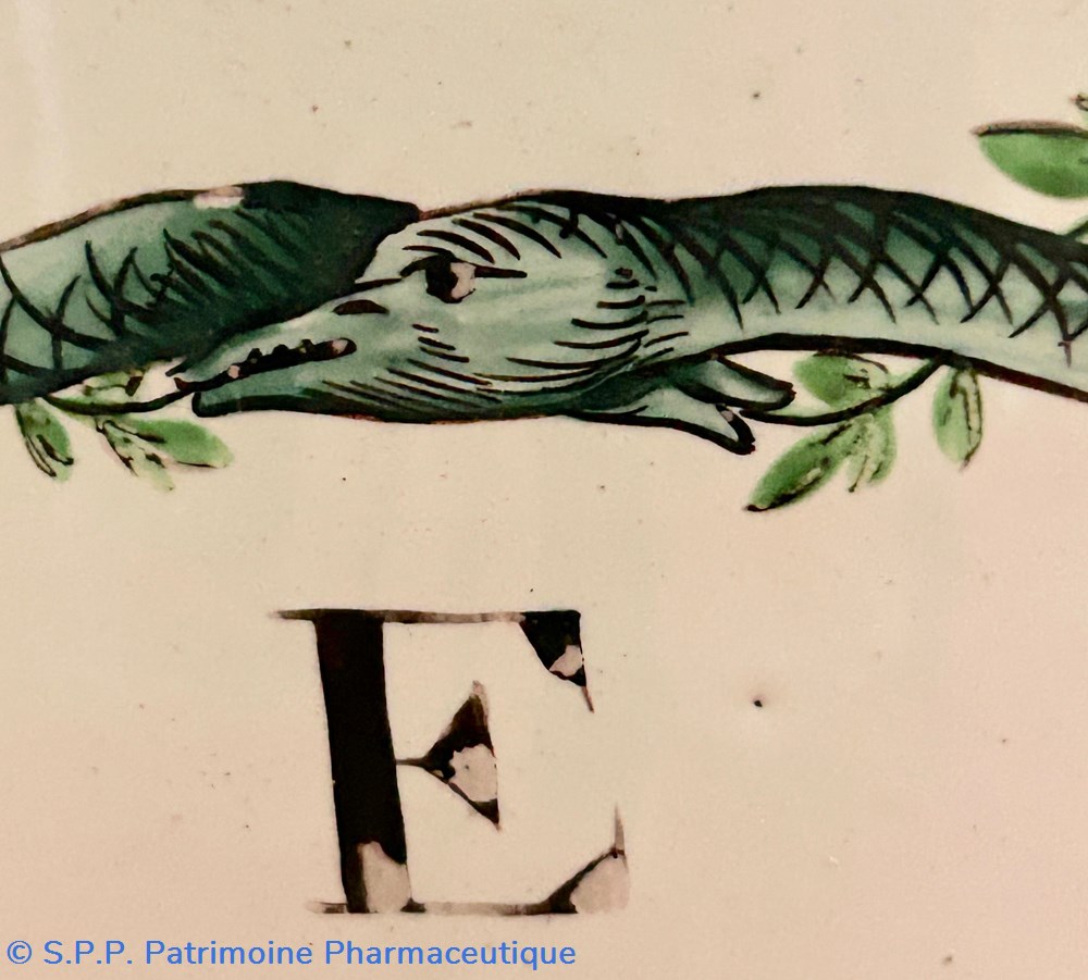 ? - Chevrette à décor de grand feu polychrome de deux lézards affrontés dessinant un cartouche. L'inscription dans ce cartouche est : " O . lumbricor ."