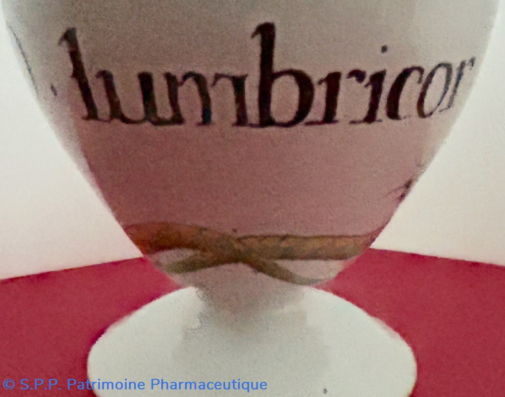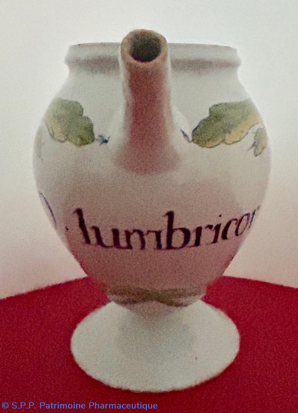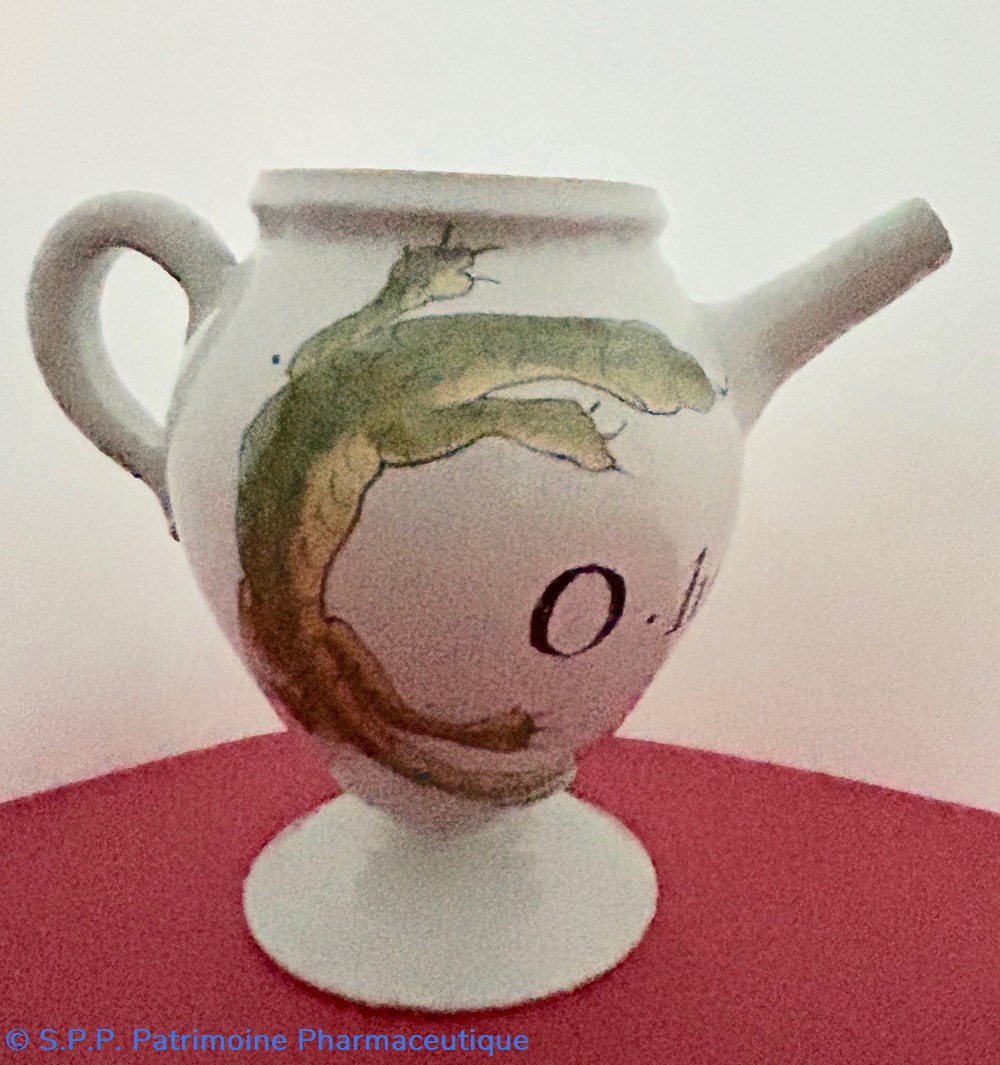 ? - Chevrette à décor de grand feu polychrome de deux lézards affrontés dessinant un cartouche. L'inscription dans ce cartouche est : " O . lumbricor ."