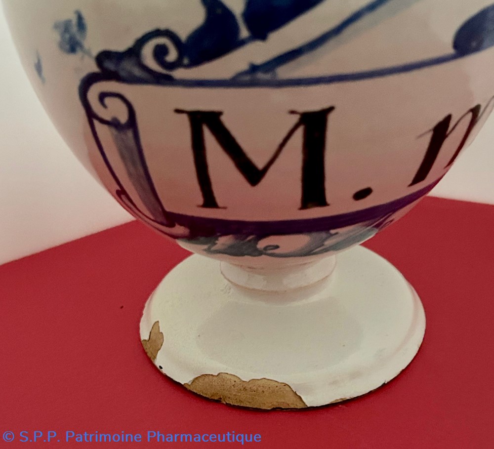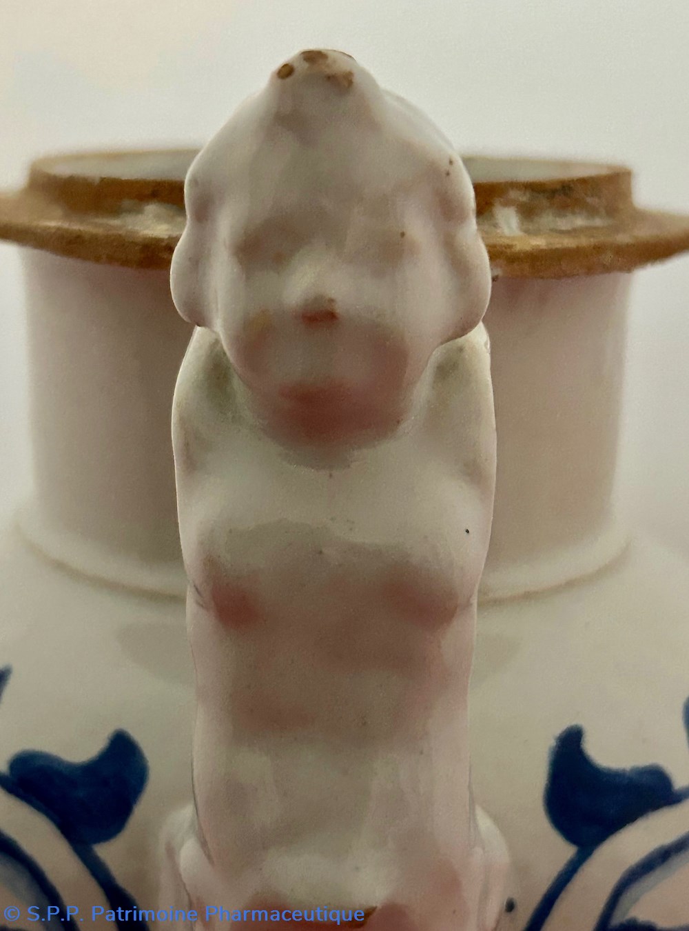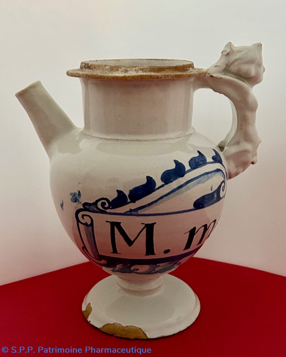 MONTPELLIER - Chevrette à décor de grand feu en camaïeu de bleu et rehauts manganèse. Anse moulée d'un buste féminin en ronde-bosse, à décor organisé autour d'un large phylactère s'enroulant sur lui-même, surmonté de deux larges volutes garnies de petites feuilles, et soutenu d'une frise de fruits et de feuillage. Inscription : " M . mercurialis "