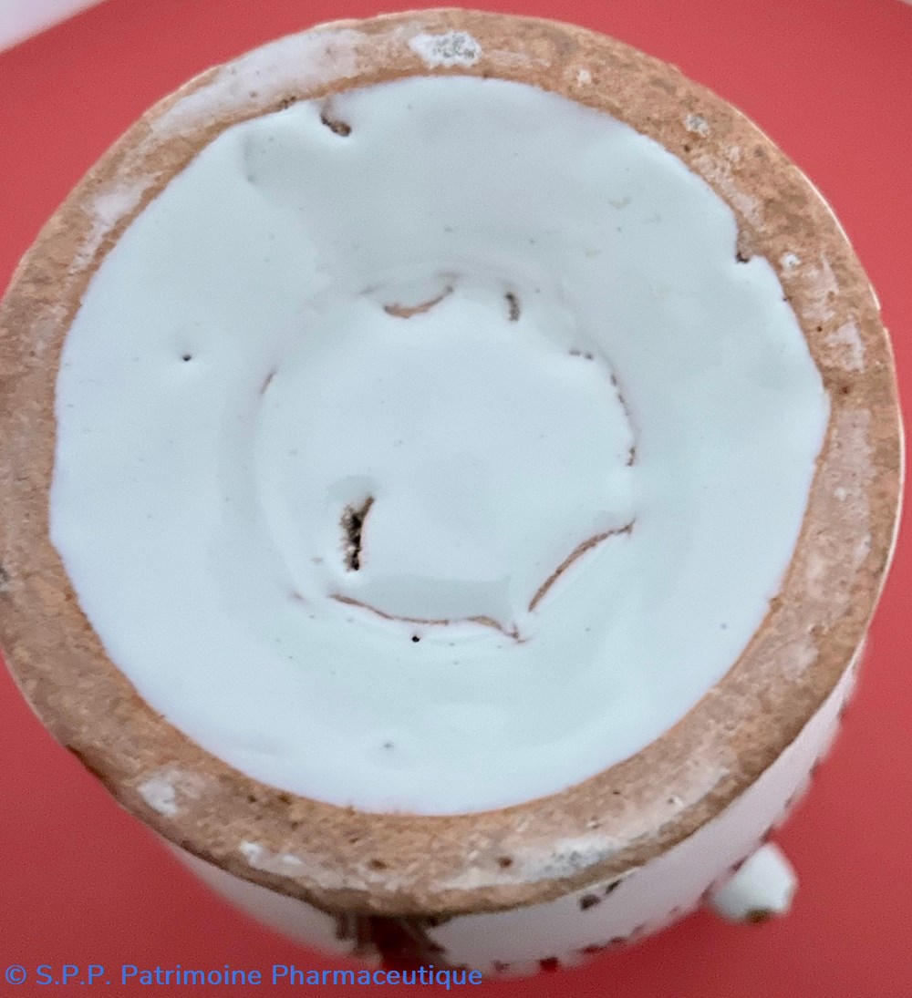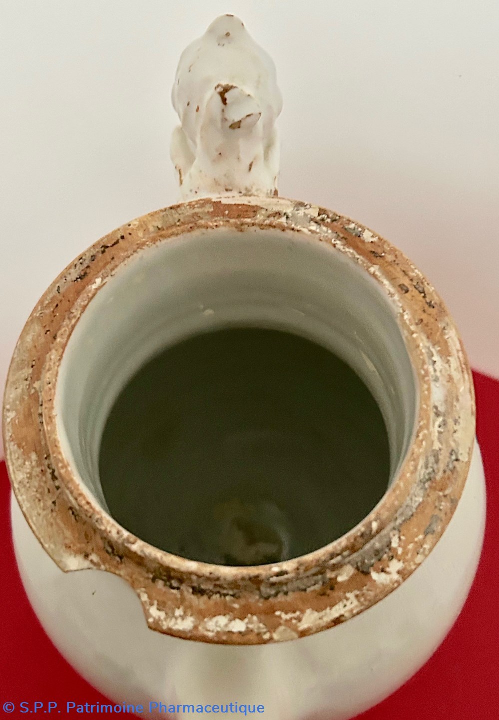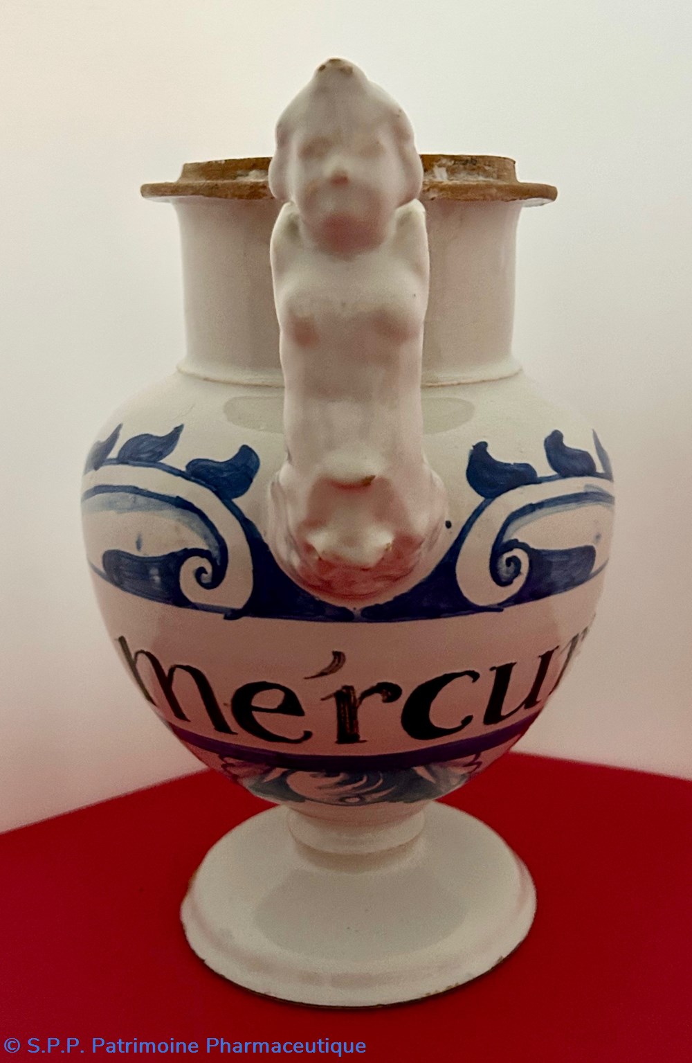 MONTPELLIER - Chevrette à décor de grand feu en camaïeu de bleu et rehauts manganèse. Anse moulée d'un buste féminin en ronde-bosse, à décor organisé autour d'un large phylactère s'enroulant sur lui-même, surmonté de deux larges volutes garnies de petites feuilles, et soutenu d'une frise de fruits et de feuillage. Inscription : " M . mercurialis "