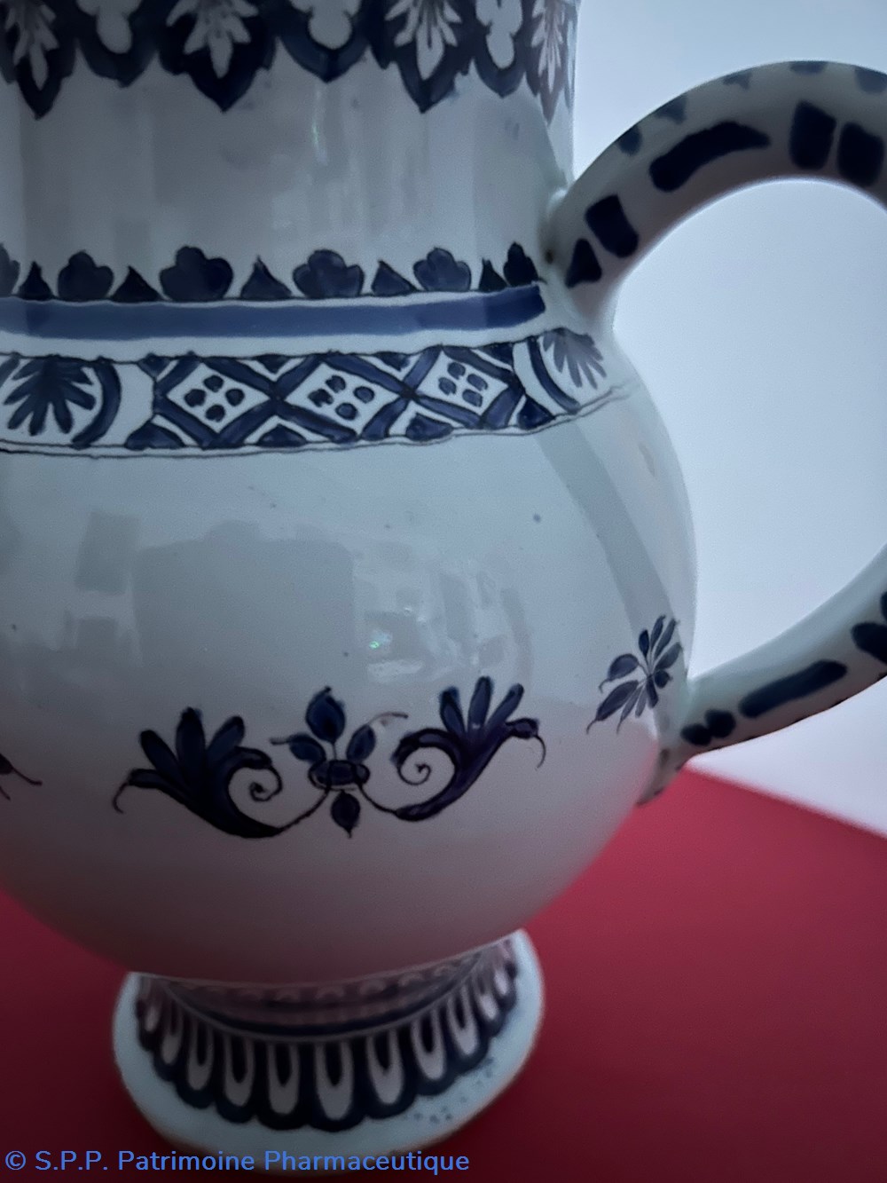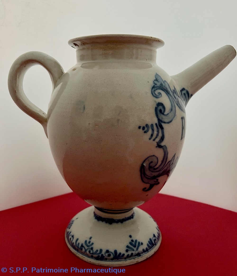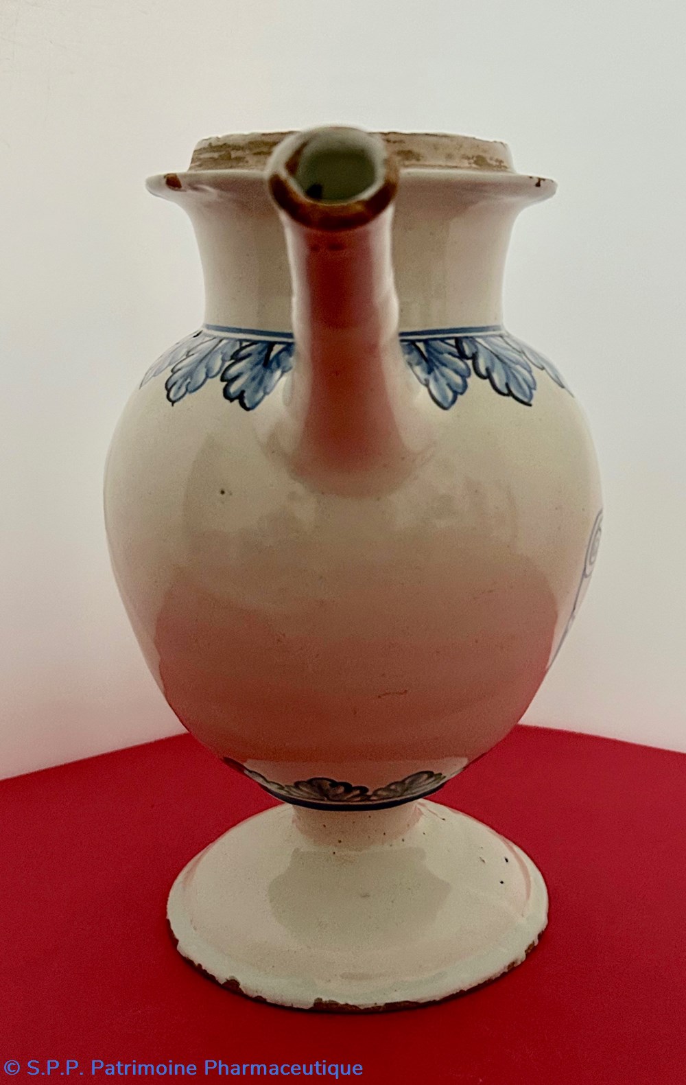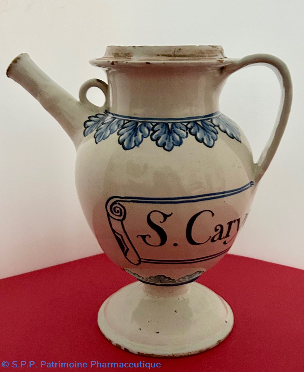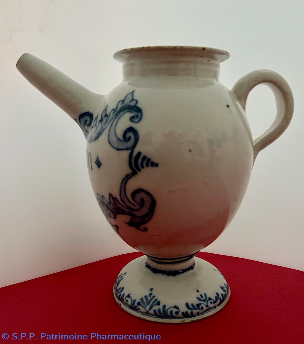 MONTPELLIER - Chevrette en faïence à décor de grand feu en camaïeu de bleu et rehauts manganèse. Décor figurant un phylactère enroulé sur lui-même en volutes, le col et la base soulignés d'une frise de feuilles d'acte. Inscritin dans le phylactère : " S . Caryophillor. "