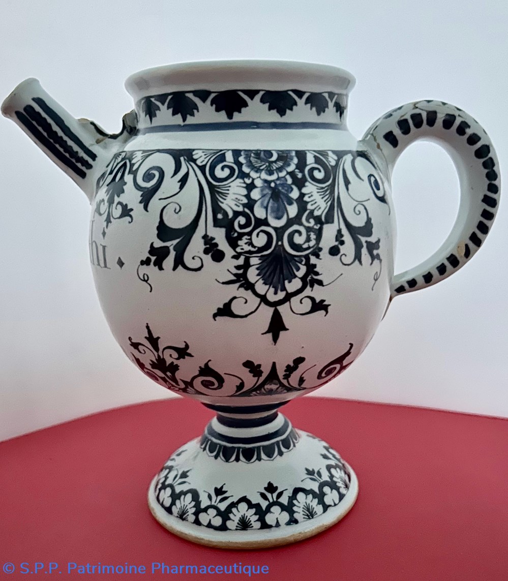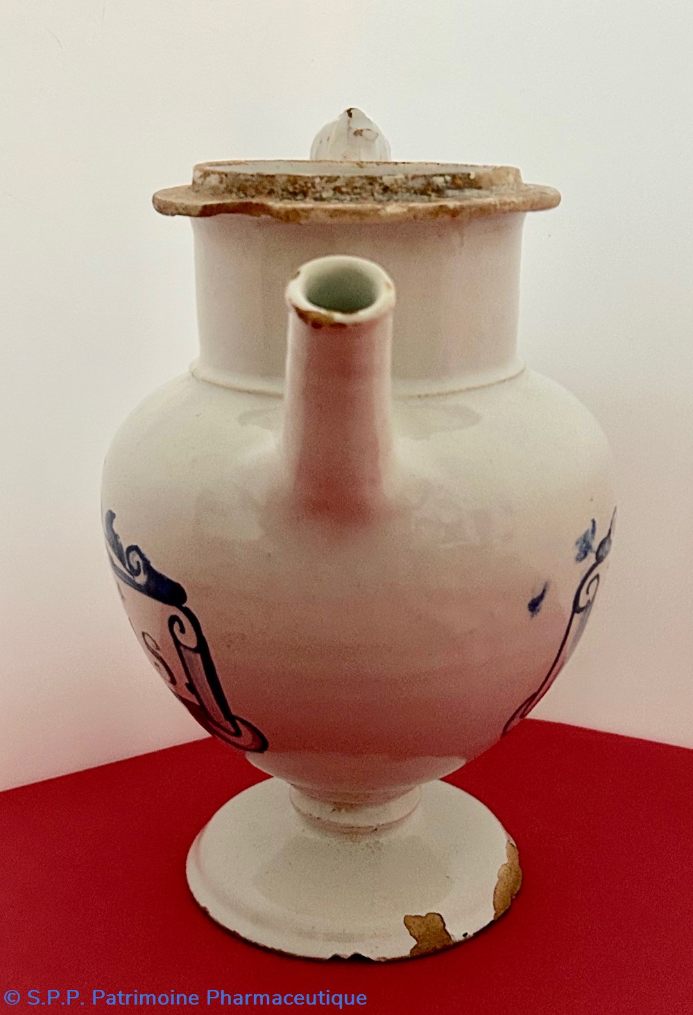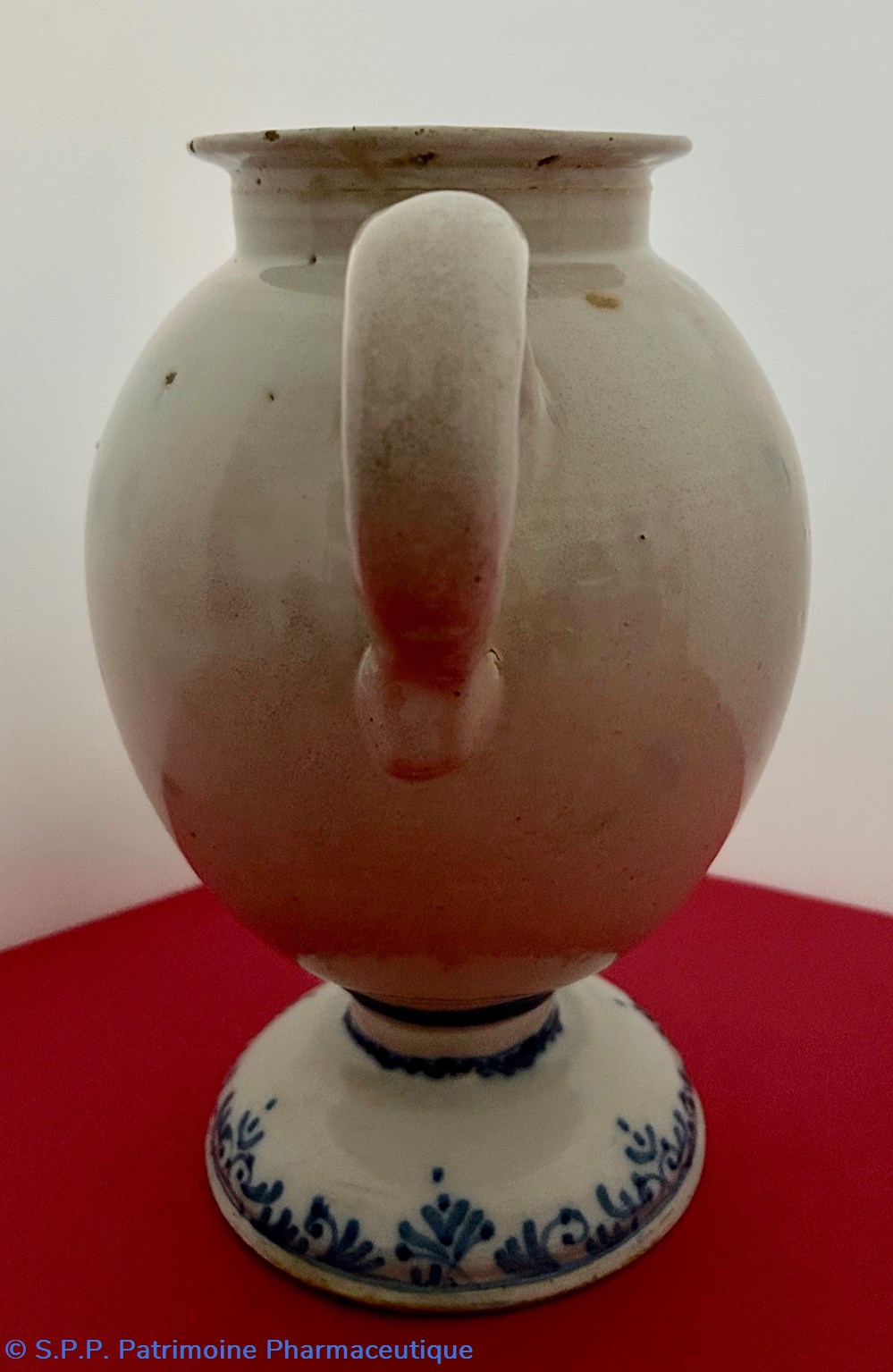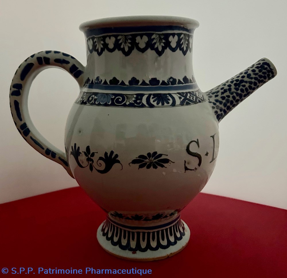MONTPELLIER - Chevrette en faïence à décor de grand feu en camaïeu de bleu et rehauts manganèse. Décor figurant un phylactère enroulé sur lui-même en volutes, le col et la base soulignés d'une frise de feuilles d'acte. Inscritin dans le phylactère : " S . Caryophillor. "