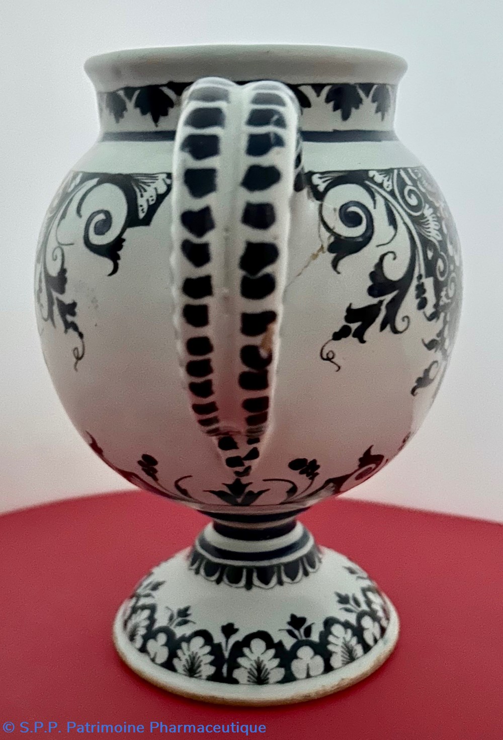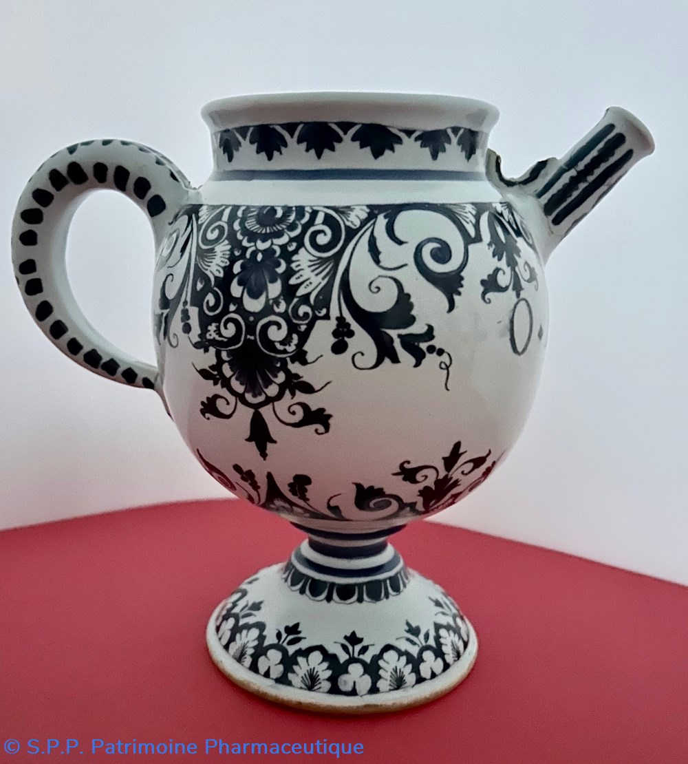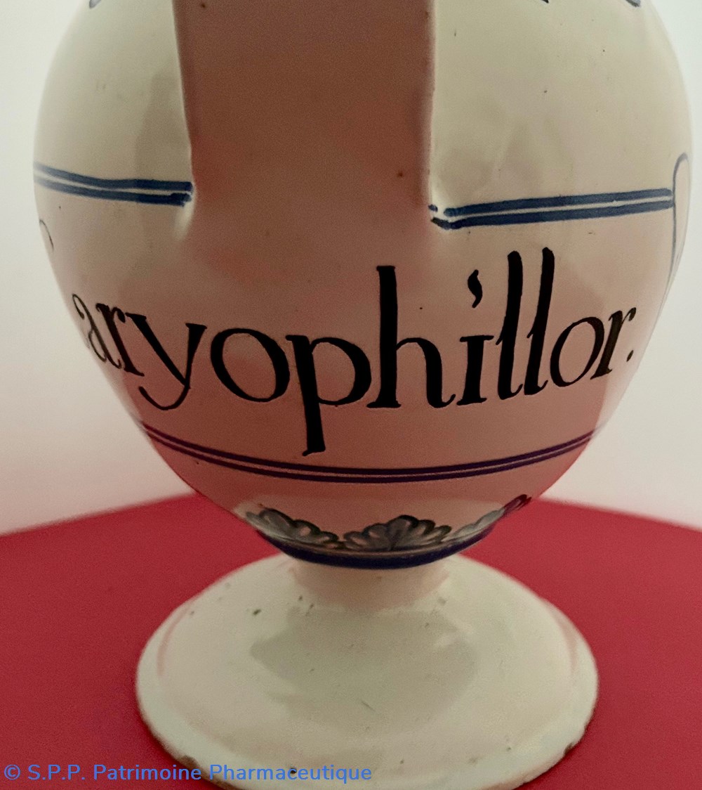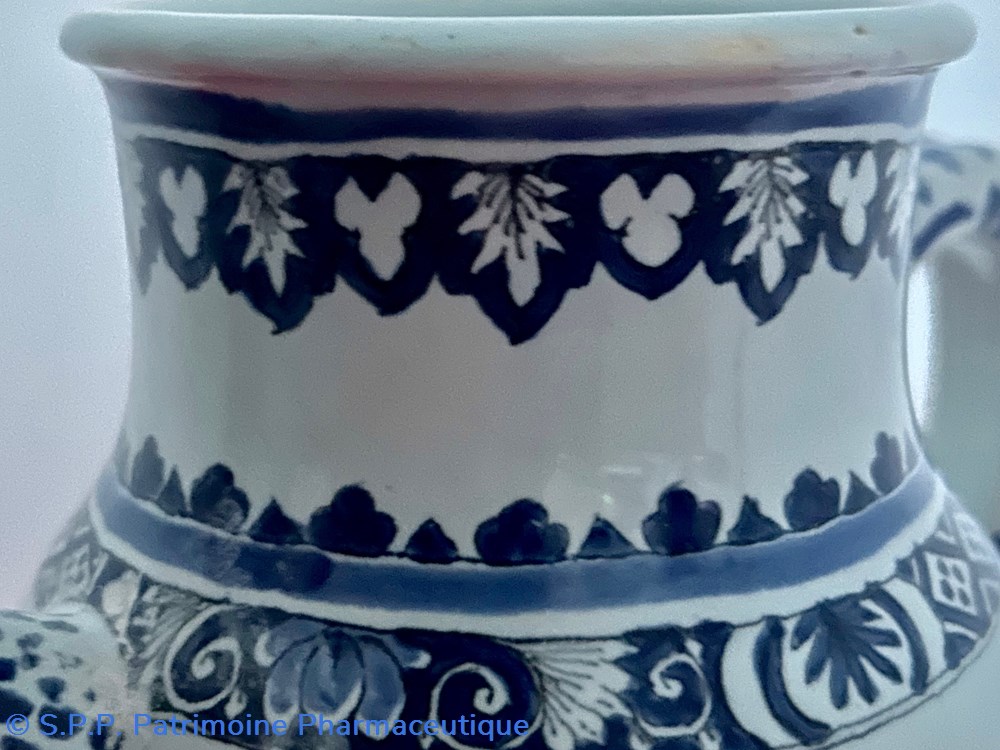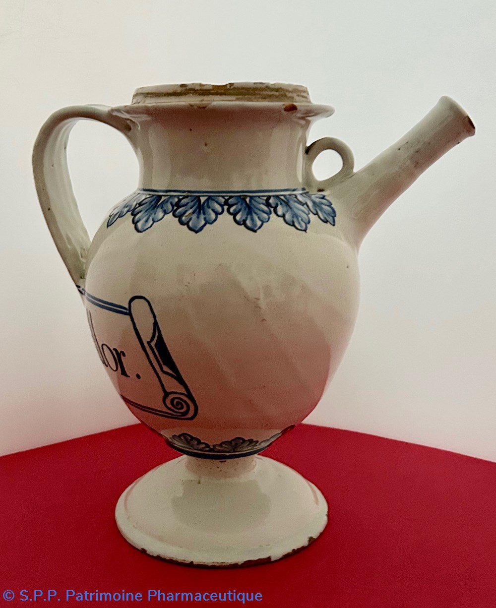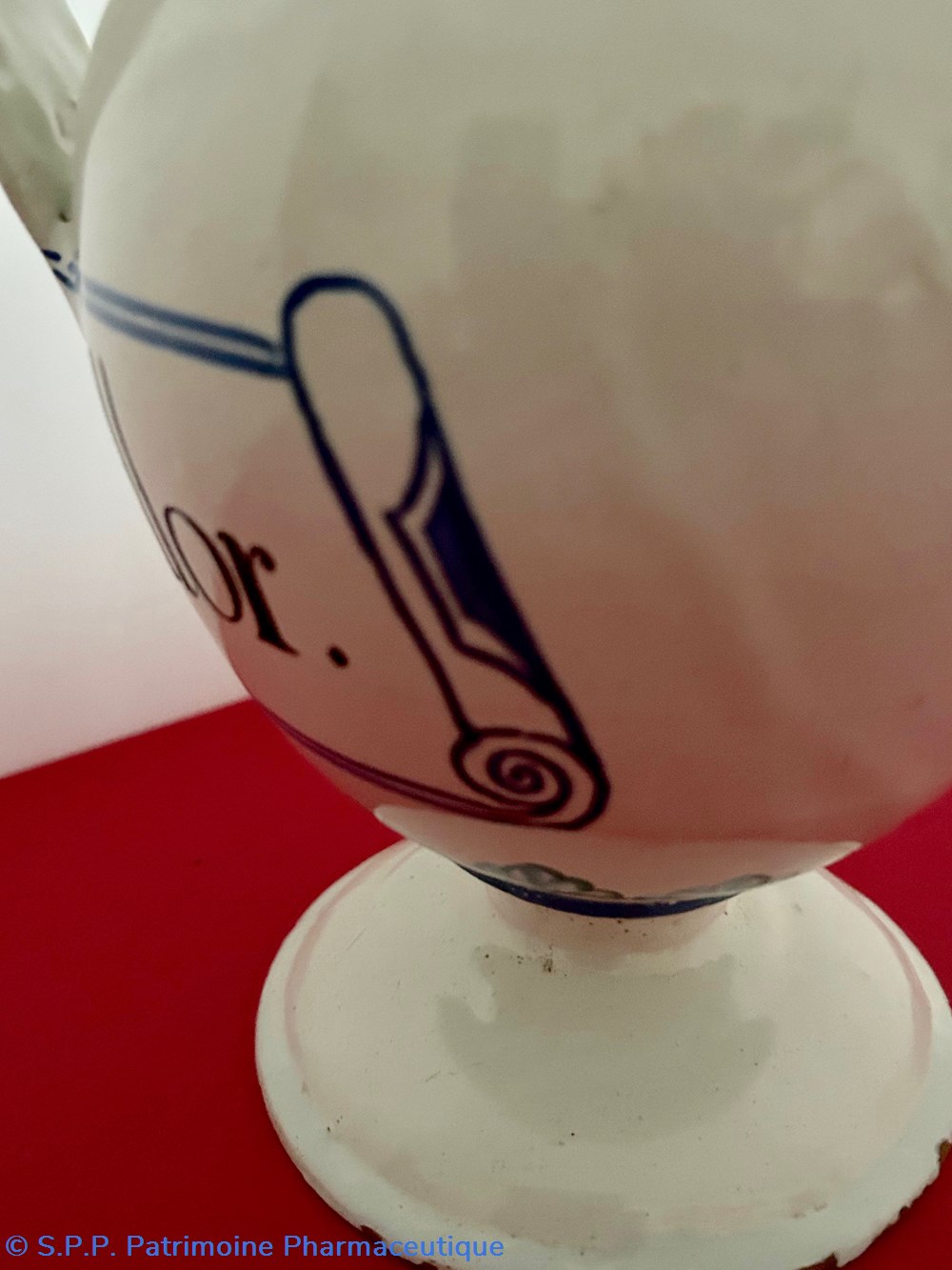 MONTPELLIER - Chevrette en faïence à décor de grand feu en camaïeu de bleu et rehauts manganèse. Décor figurant un phylactère enroulé sur lui-même en volutes, le col et la base soulignés d'une frise de feuilles d'acte. Inscritin dans le phylactère : " S . Caryophillor. "