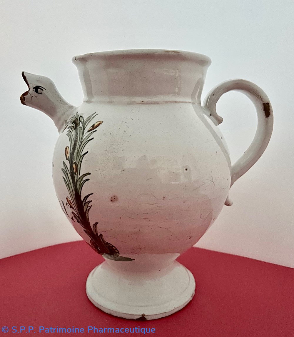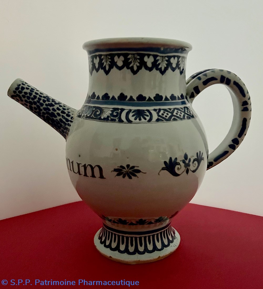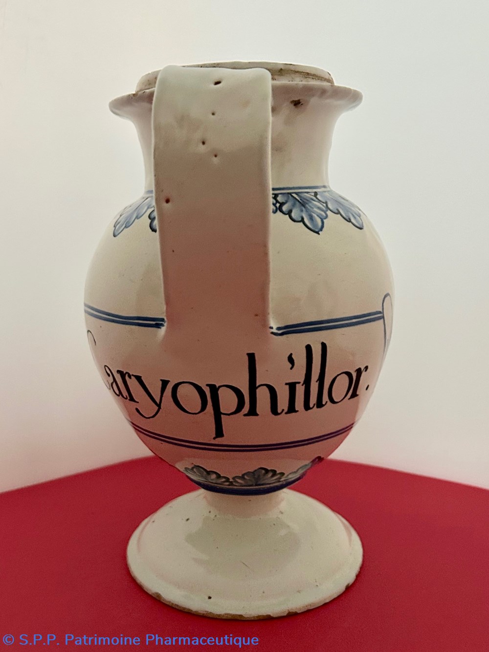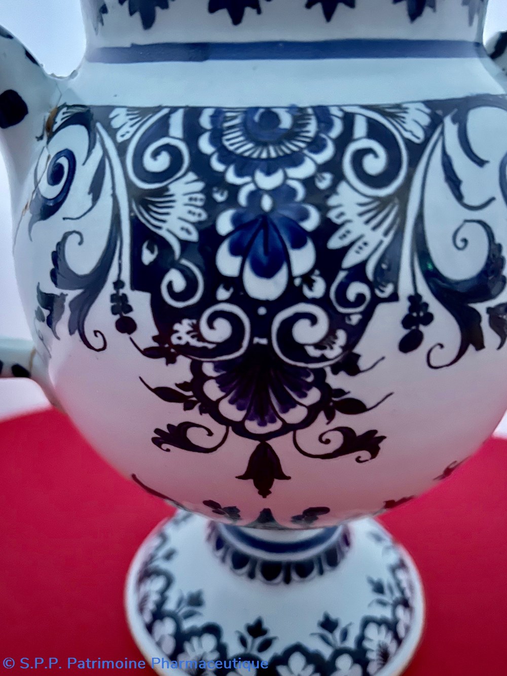 MONTPELLIER - Chevrette en faïence à décor de grand feu en camaïeu de bleu et rehauts manganèse. Décor figurant un phylactère enroulé sur lui-même en volutes, le col et la base soulignés d'une frise de feuilles d'acte. Inscritin dans le phylactère : " S . Caryophillor. "