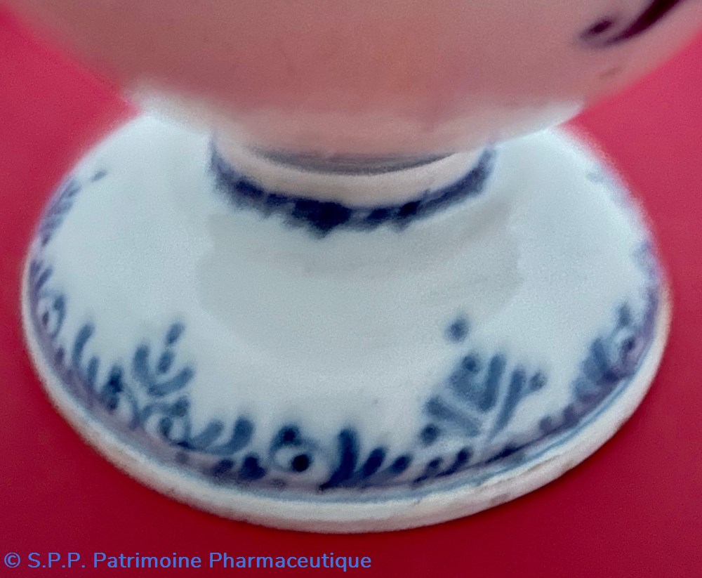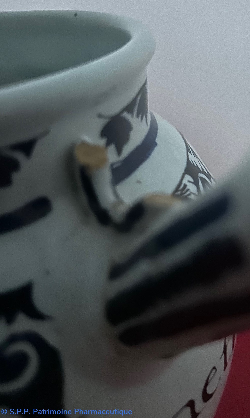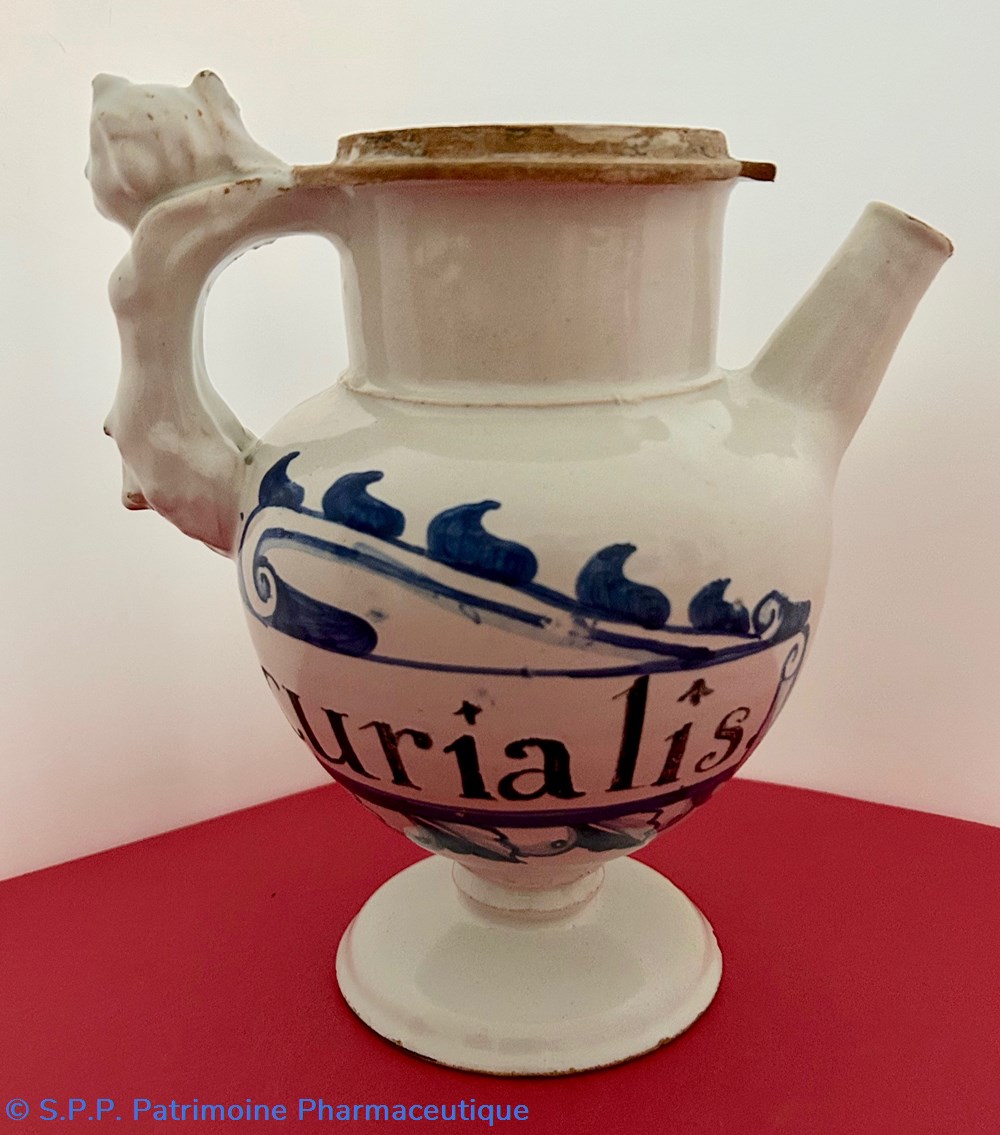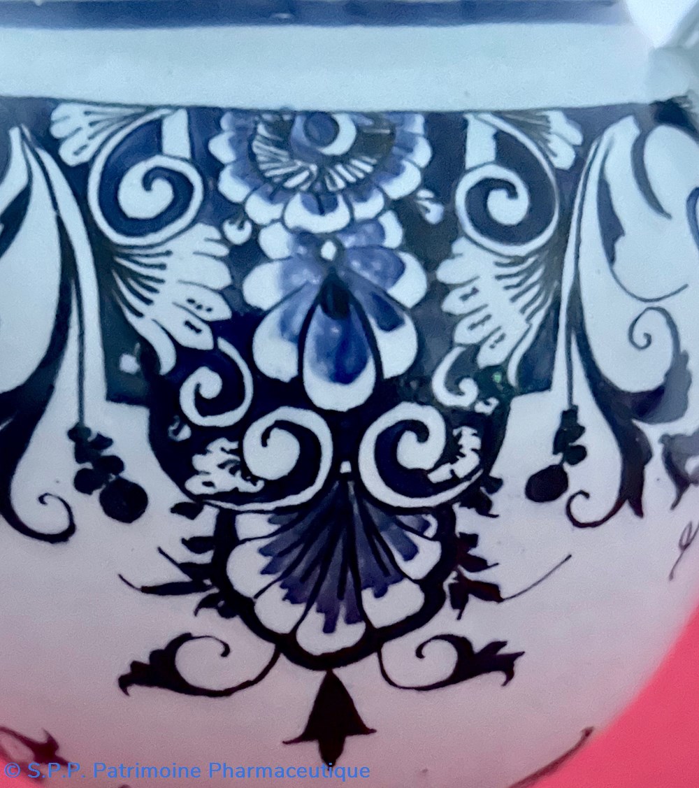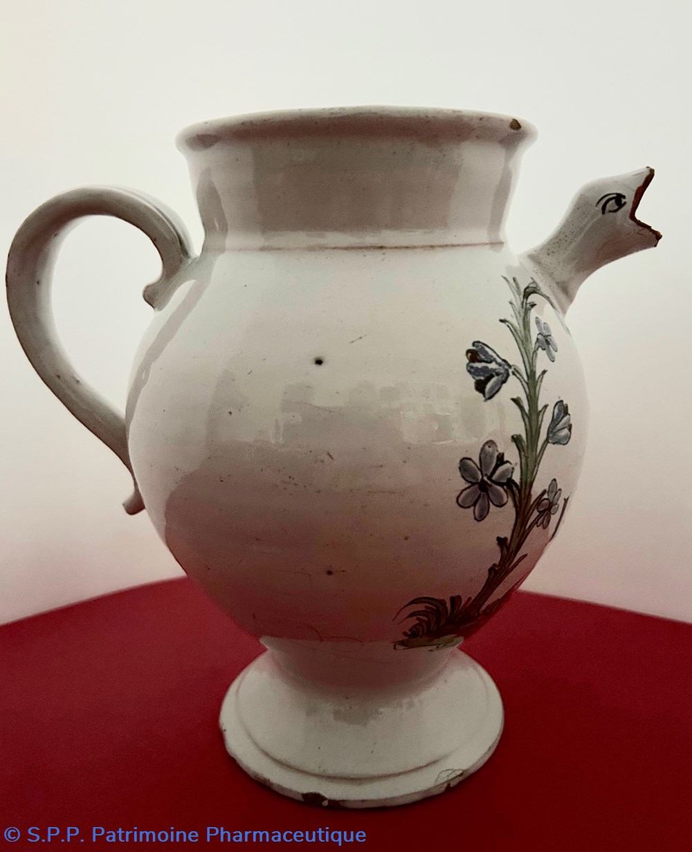 MONTPELLIER - Chevrette en faïence à décor de grand feu en camaïeu de bleu et rehauts manganèse. Décor figurant un phylactère enroulé sur lui-même en volutes, le col et la base soulignés d'une frise de feuilles d'acte. Inscritin dans le phylactère : " S . Caryophillor. "