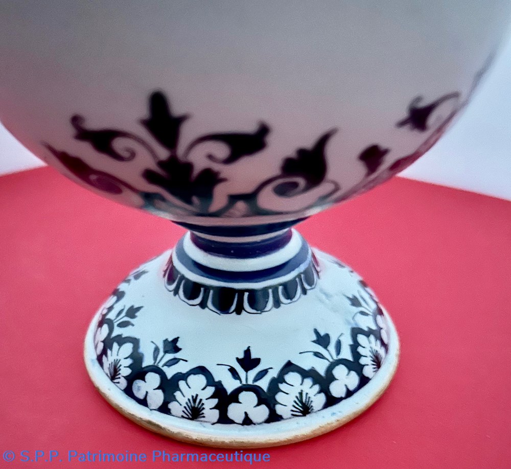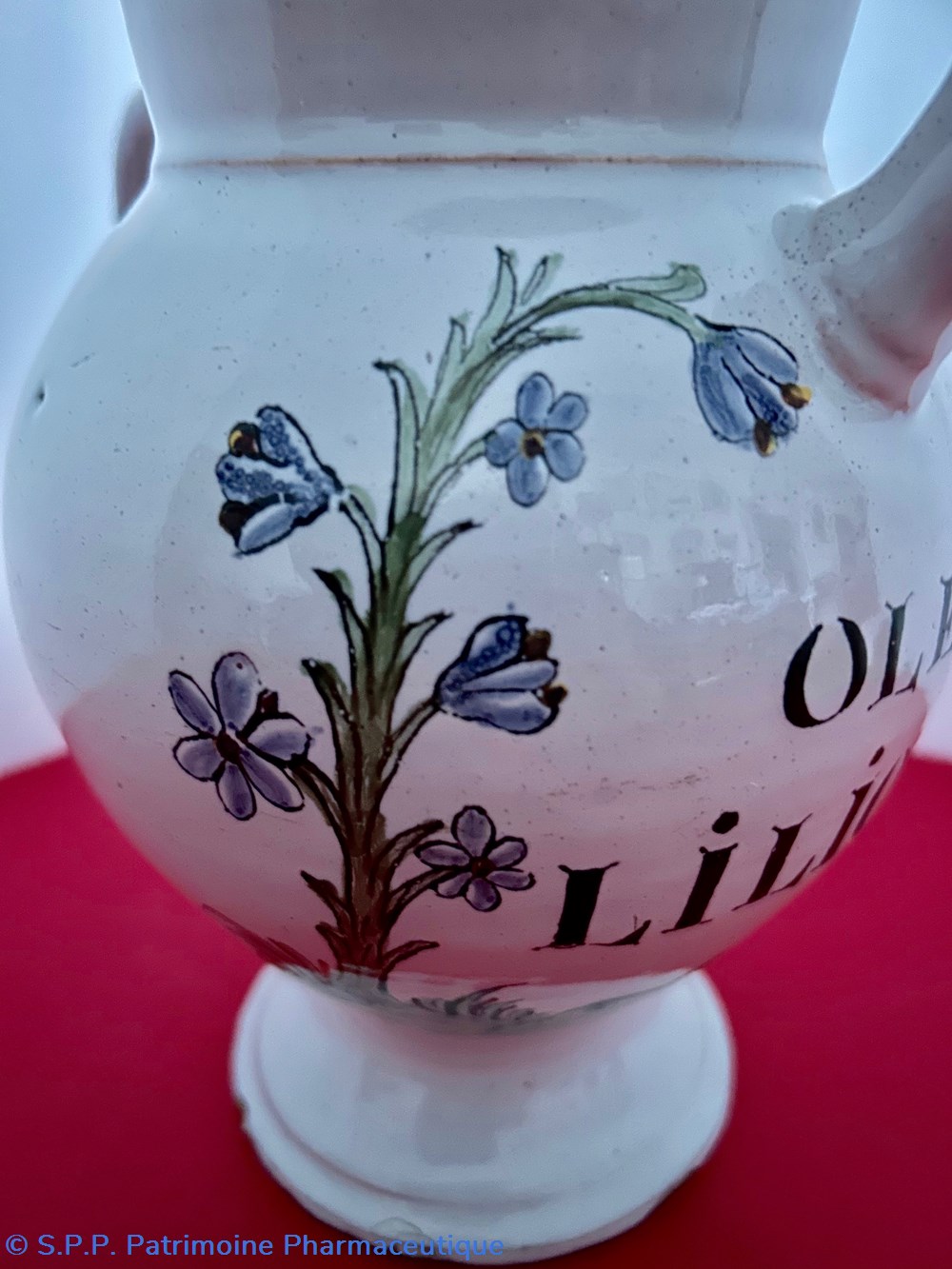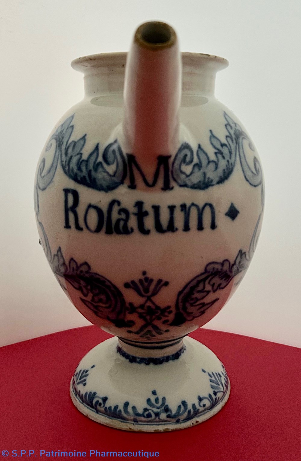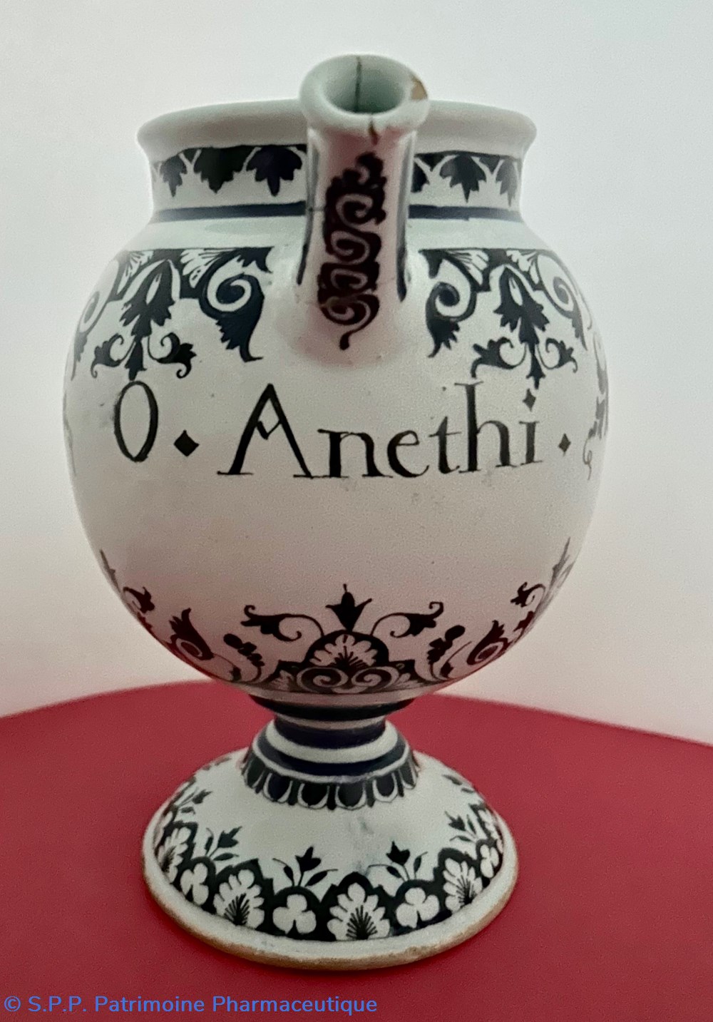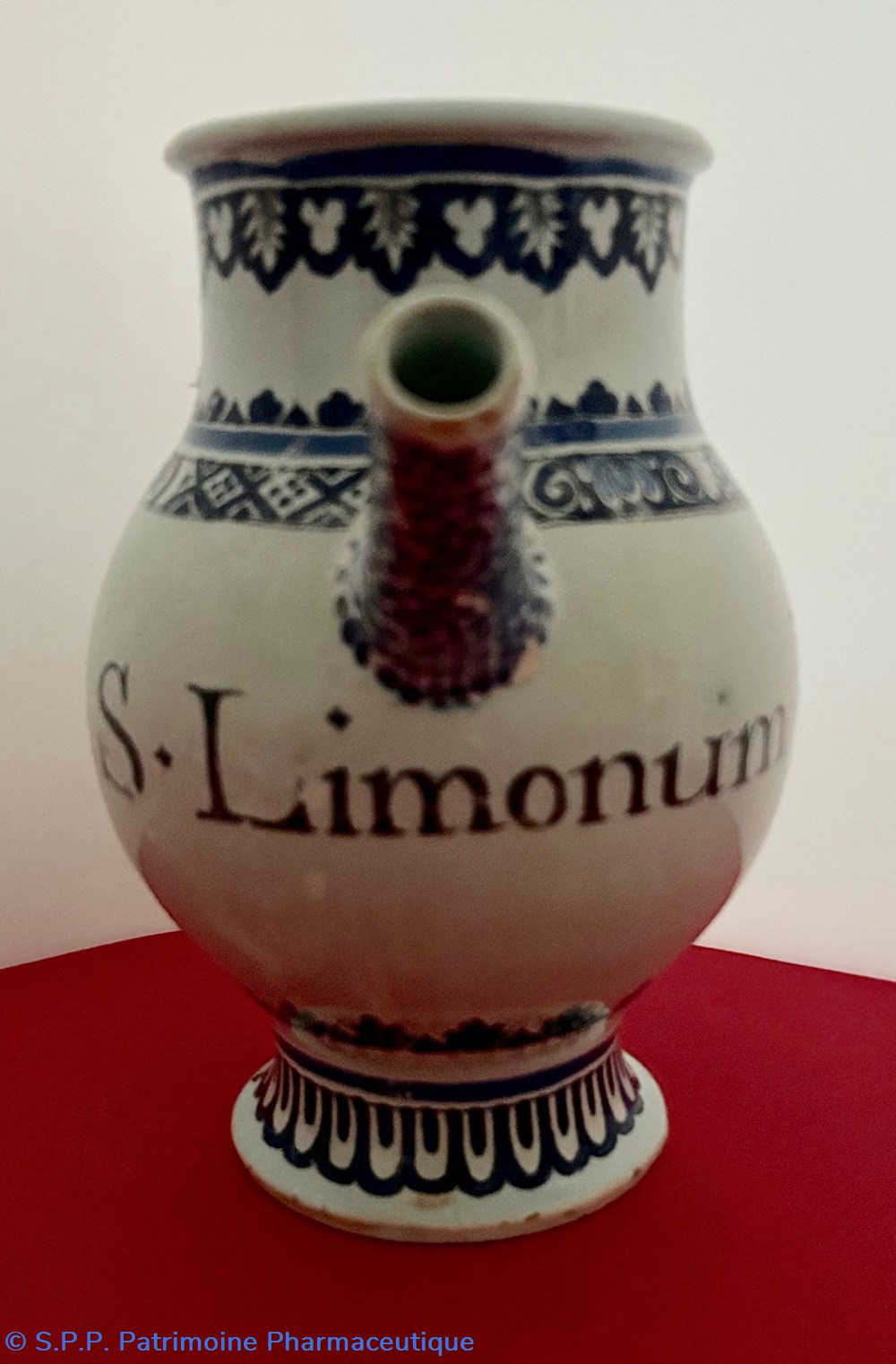 MONTPELLIER - Chevrette en faïence à décor de grand feu en camaïeu de bleu et rehauts manganèse. Décor figurant un phylactère enroulé sur lui-même en volutes, le col et la base soulignés d'une frise de feuilles d'acte. Inscritin dans le phylactère : " S . Caryophillor. "