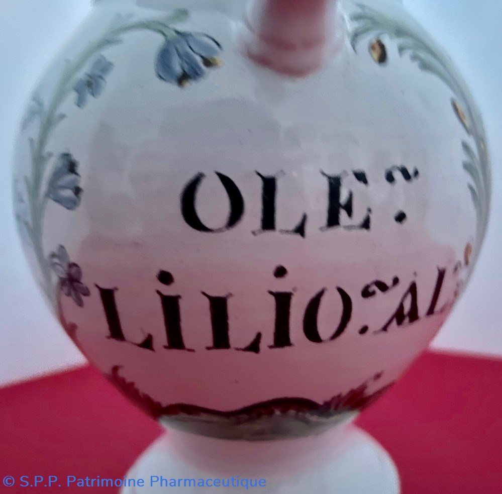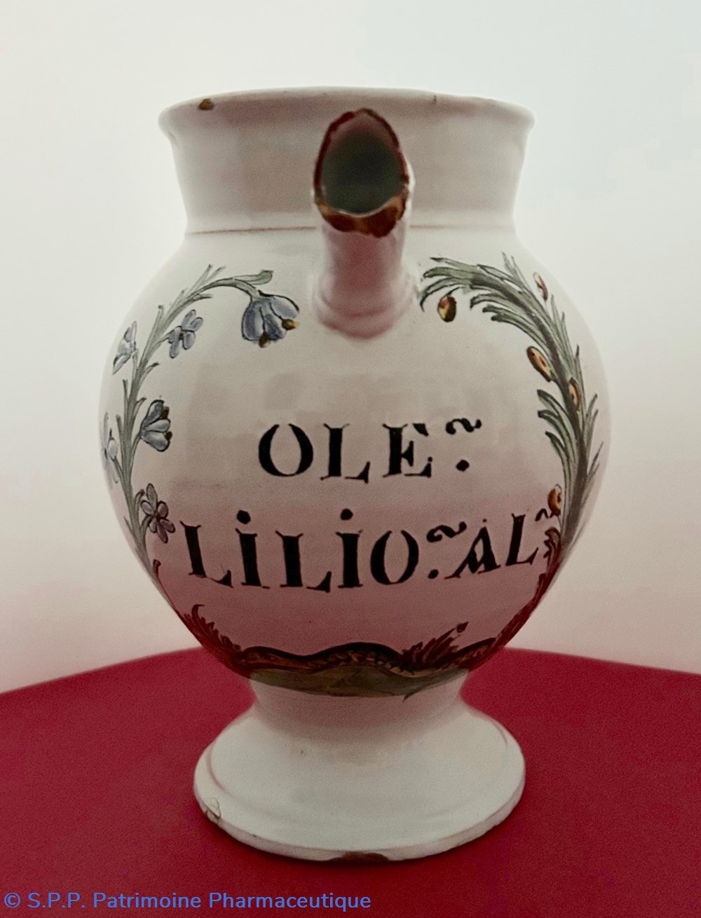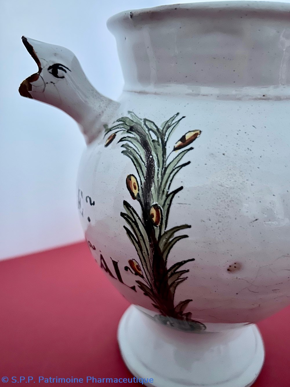 ? - Chevrette au bec en forme d'oiseau à décor de grand feu polychrome d'une branche de fleurs et d'une branche de feuillage, de fruits formant un cartouche sur un tertre où s'élance un serpent. Inscription : " OLE. LILIO. AL "