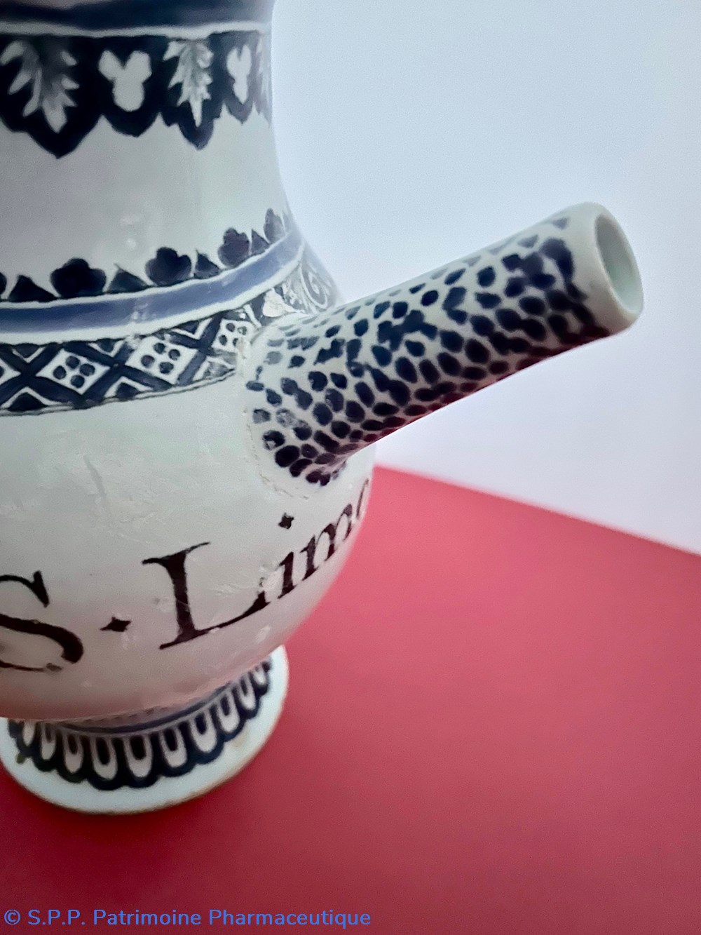 ROUEN - Chevrette en faïence à décor de grand feu en camaïeu de bleu et rehauts de manganèse. Ornemantation de frises de feuillage et de croisillons, godrons et de fleurons sur la panse. Inscription : " S . Limonum ".