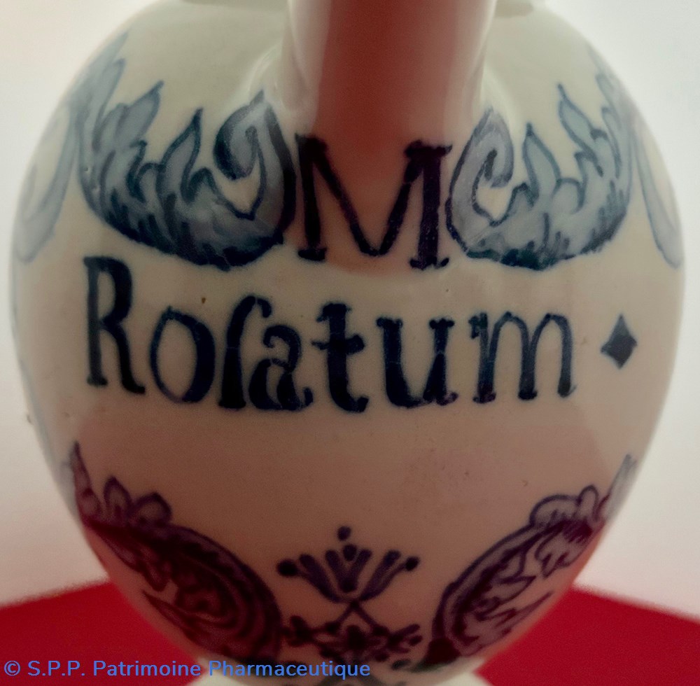 MONTPELLIER - Chevrette en faïence à décor de grand feu en camaïeu de bleu d'un large cartouche rocaille formé de volutes d'acanthe, d'enroulements et de fleurons, la base ornée d'une frise en ferronnerie. Inscription " M Rosatum "