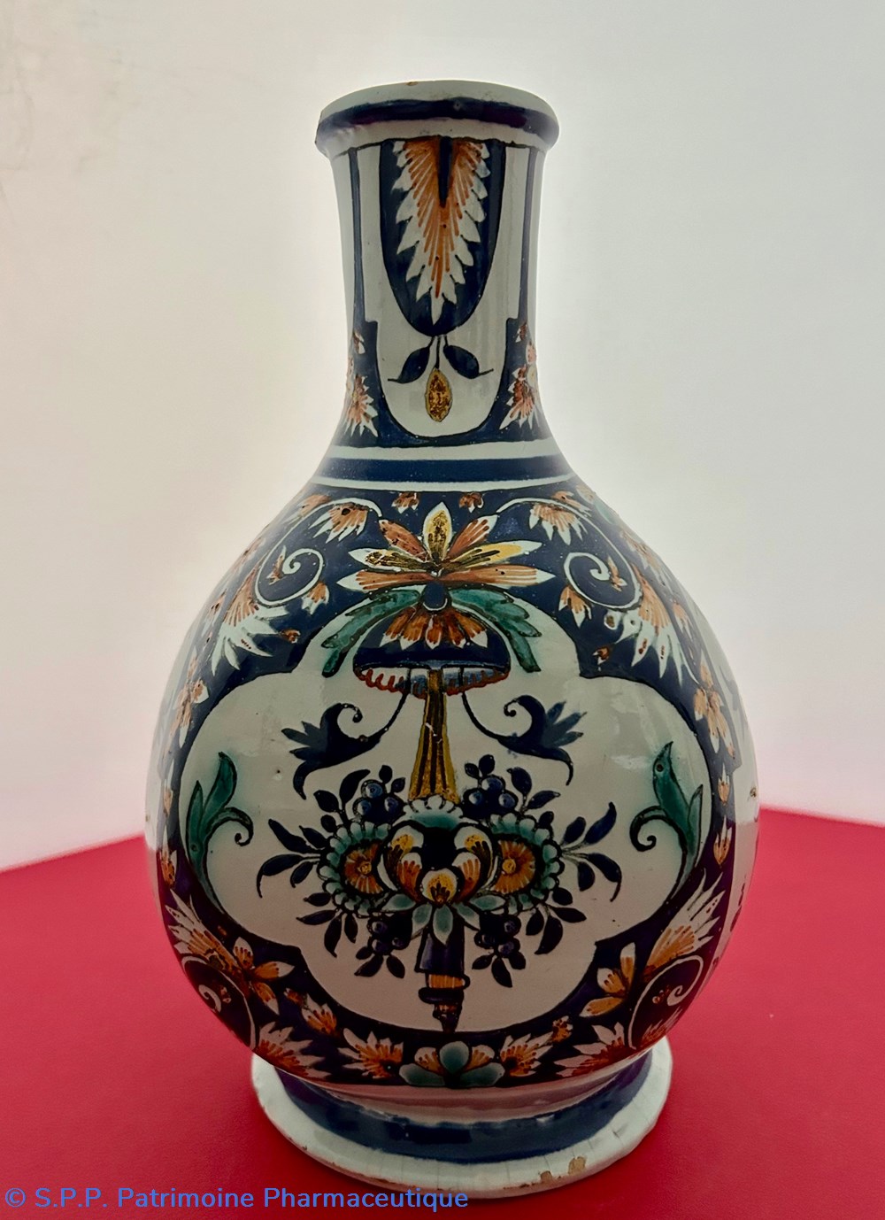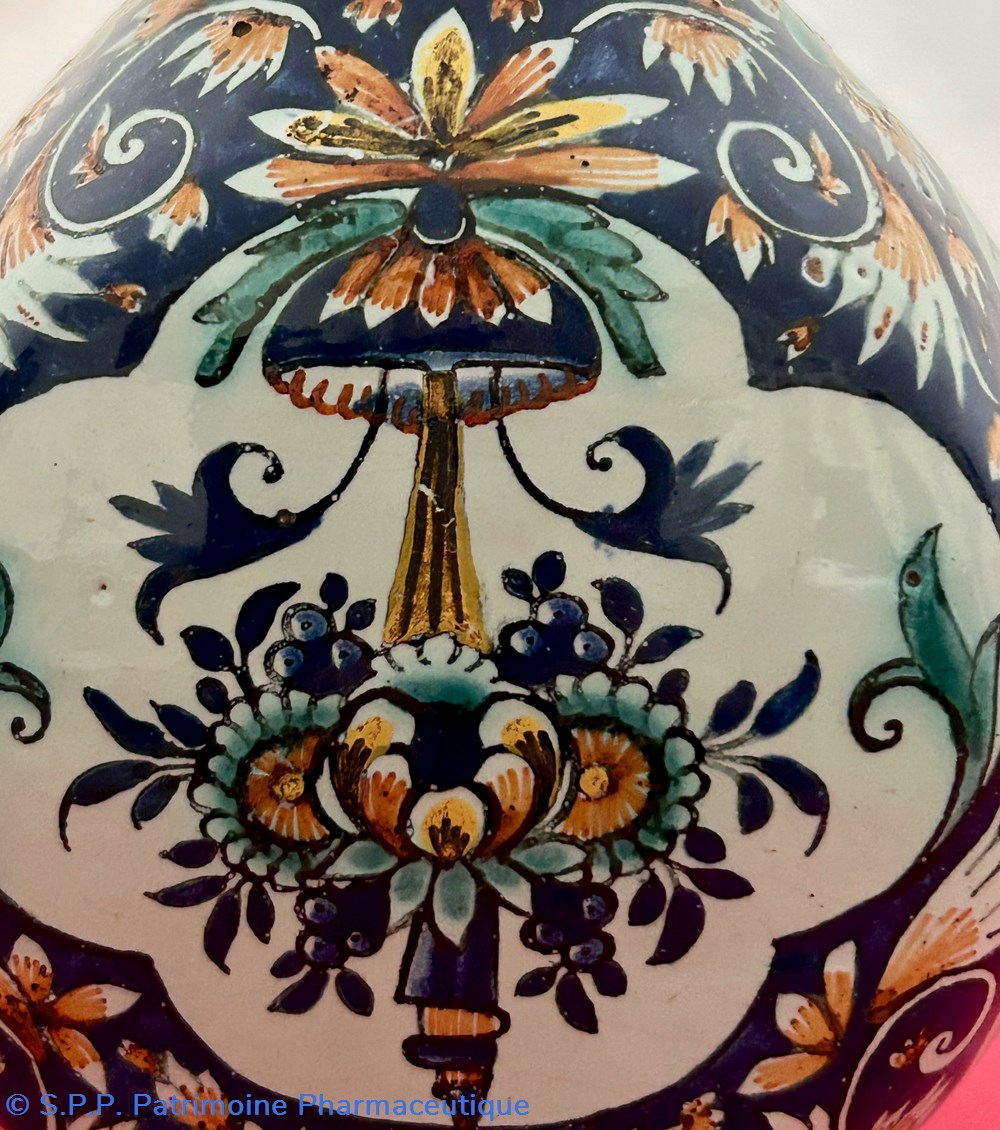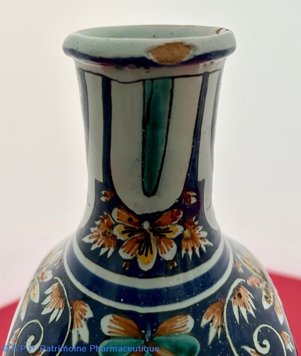 Des pièces similaires appartiennent aux collections du Musée National de la céramique à Sèvres, reproduites dans l'ouvrage d'Henri-Pierre Fourest et de Pierre-Nicolas Sainte-Fare-Garnot " Les pots de pharmacie, Rouen et la Normandie", page 109. Une paire de bouteilles identiques figurait à la vente d'ARTCURIAL du 4 juin 2002, lot 199