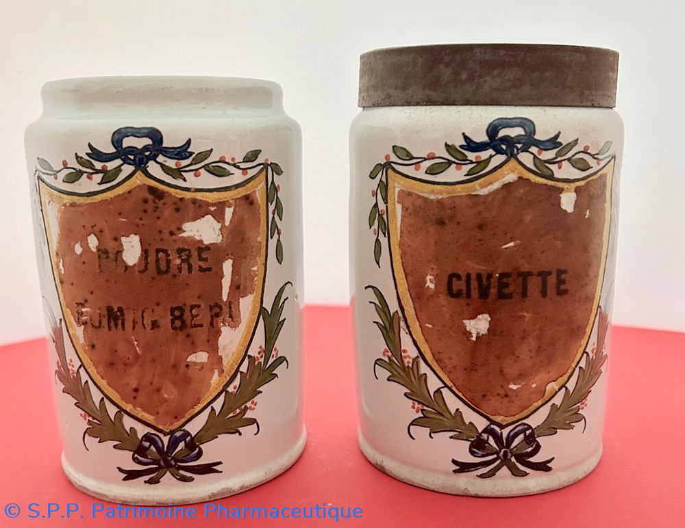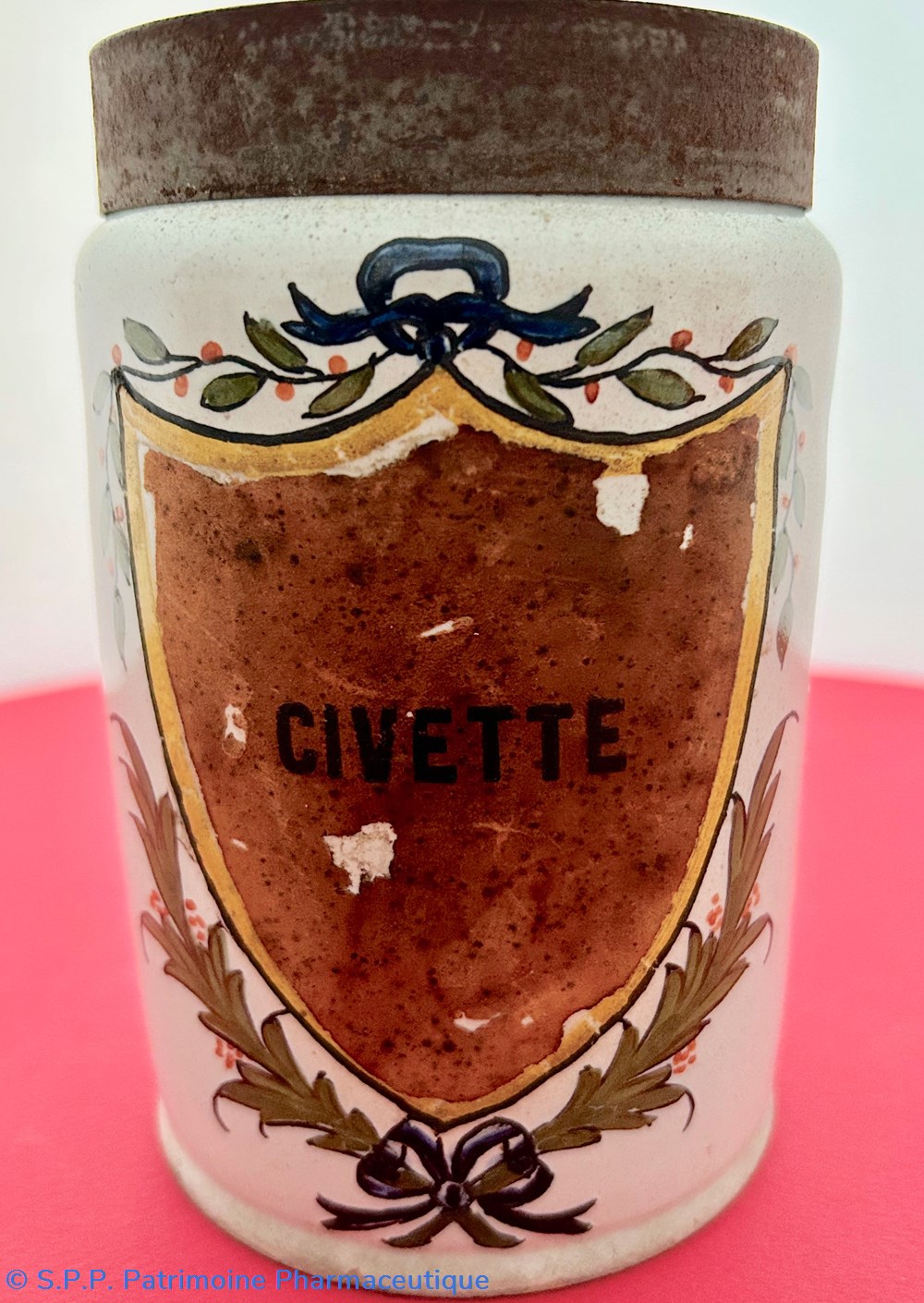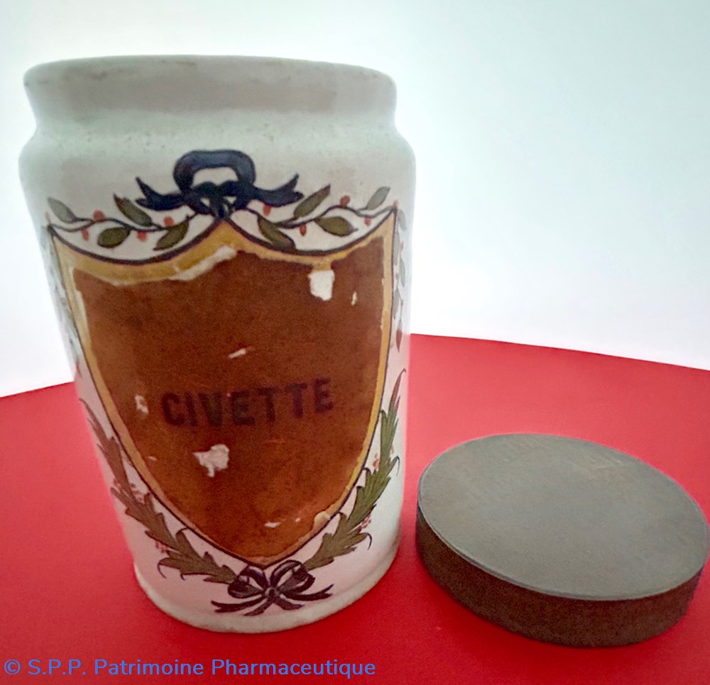 SUD-OUEST Pot droit en faïence (d'une paire) à décor polychrome d'un écusson surmonté d'une guirlande festonnée et soutenu de deux palmes nouées d'un noeud de ruban.Le coeur de l'écu, laissé vierge est ici garni d'une étiquette avec l'inscription : "CIVETTE". Ce pot est couvert de son couvercle de métal.