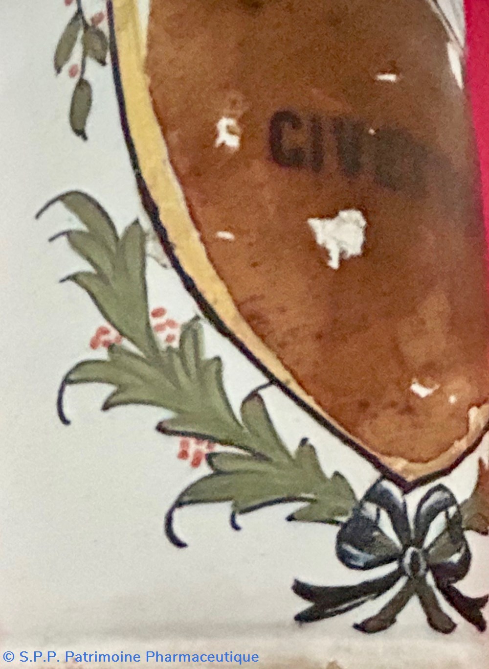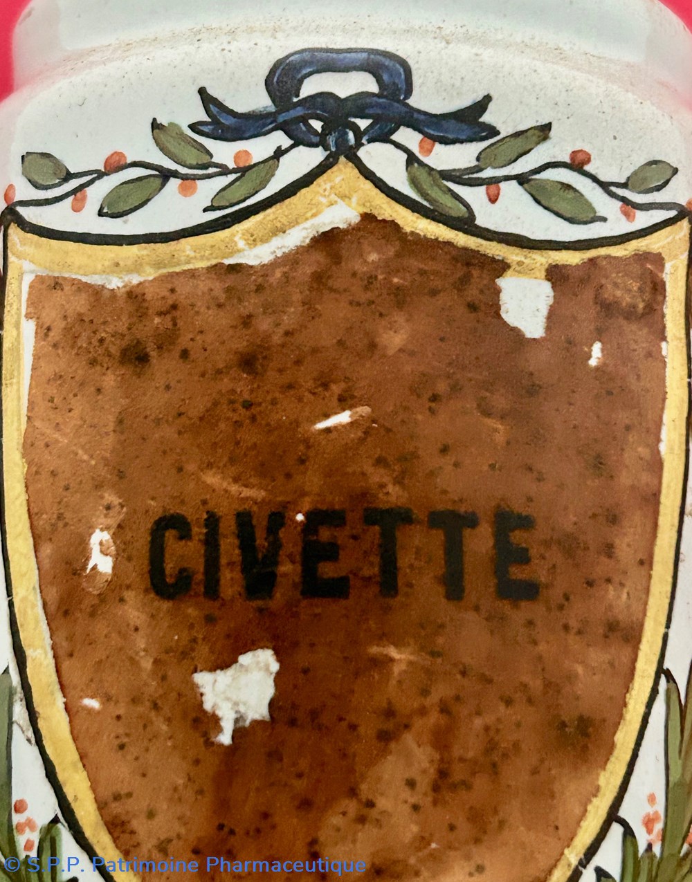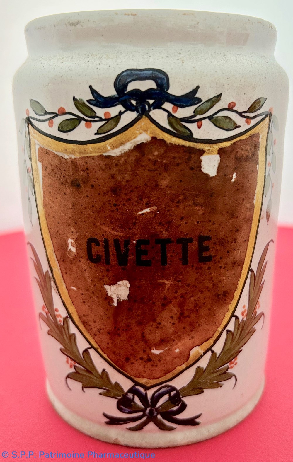 SUD-OUEST Pot droit en faïence (d'une paire) à décor polychrome d'un écusson surmonté d'une guirlande festonnée et soutenu de deux palmes nouées d'un noeud de ruban.Le coeur de l'écu, laissé vierge est ici garni d'une étiquette avec l'inscription : "CIVETTE". Ce pot est couvert de son couvercle de métal.