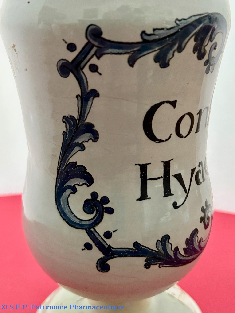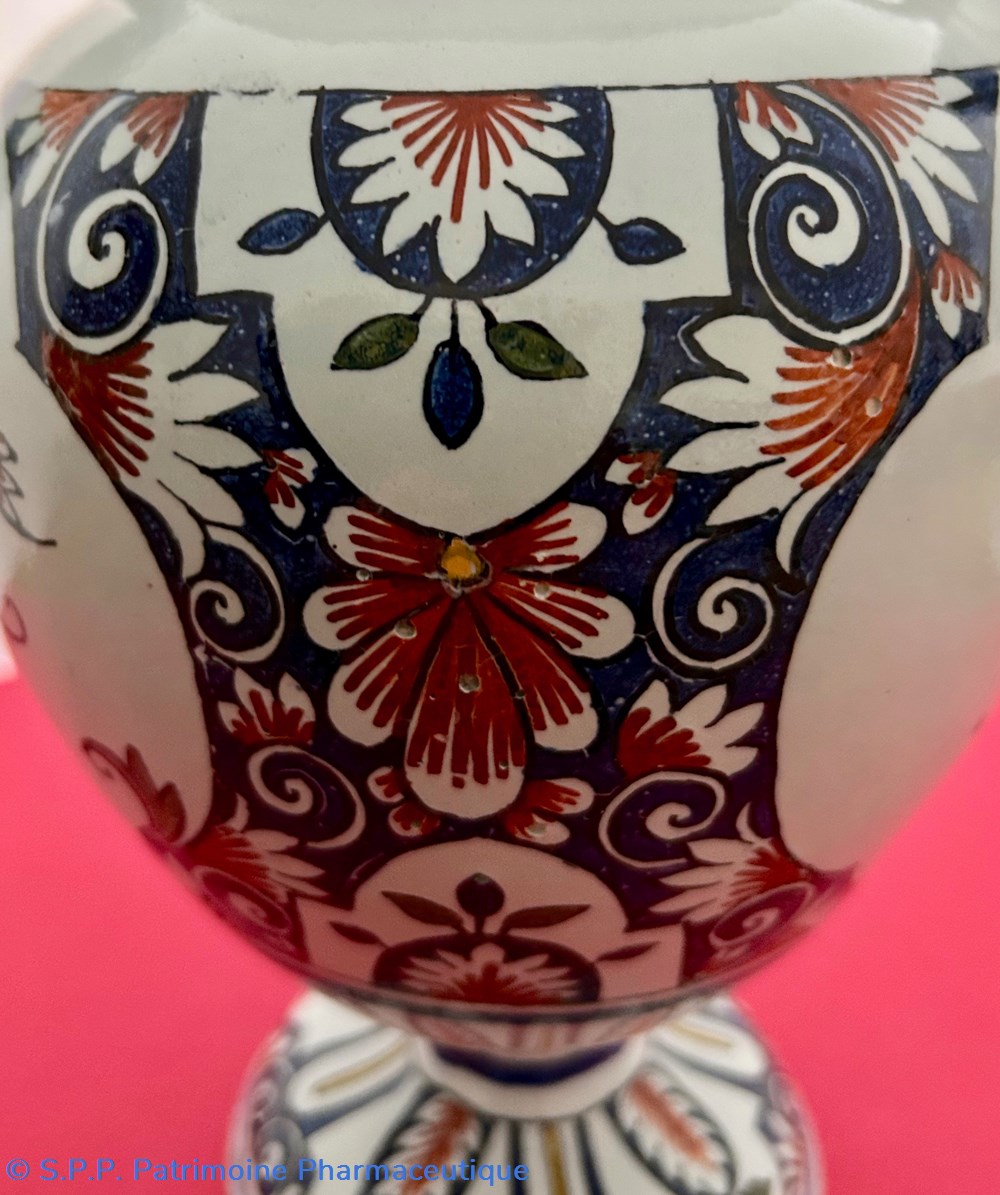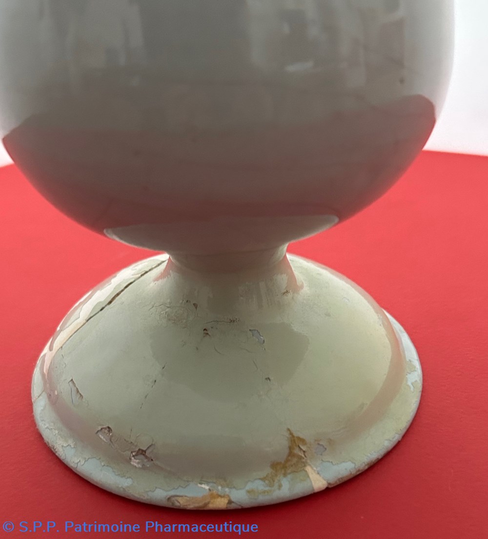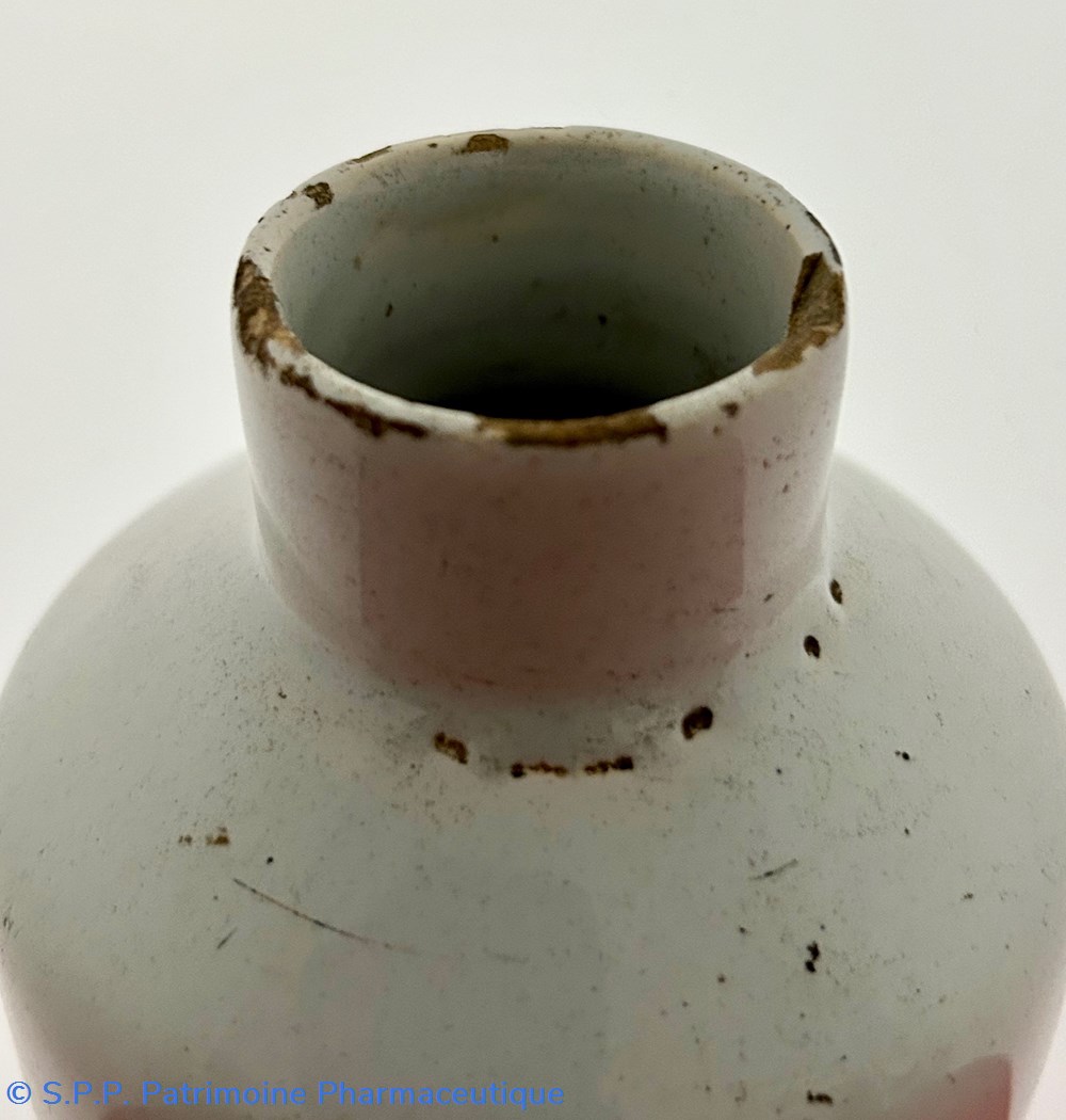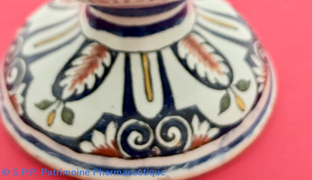 Des pièces similaires appartiennent aux collections du Musée National de la céramique de Sèvres, reproduites dans l'ouvrage d'Henri Pierre Fourest et Pierre Nicolas Sainte-Fare-Garnot "Les pots de pharmacie, Rouen et la Normandie", page 109.