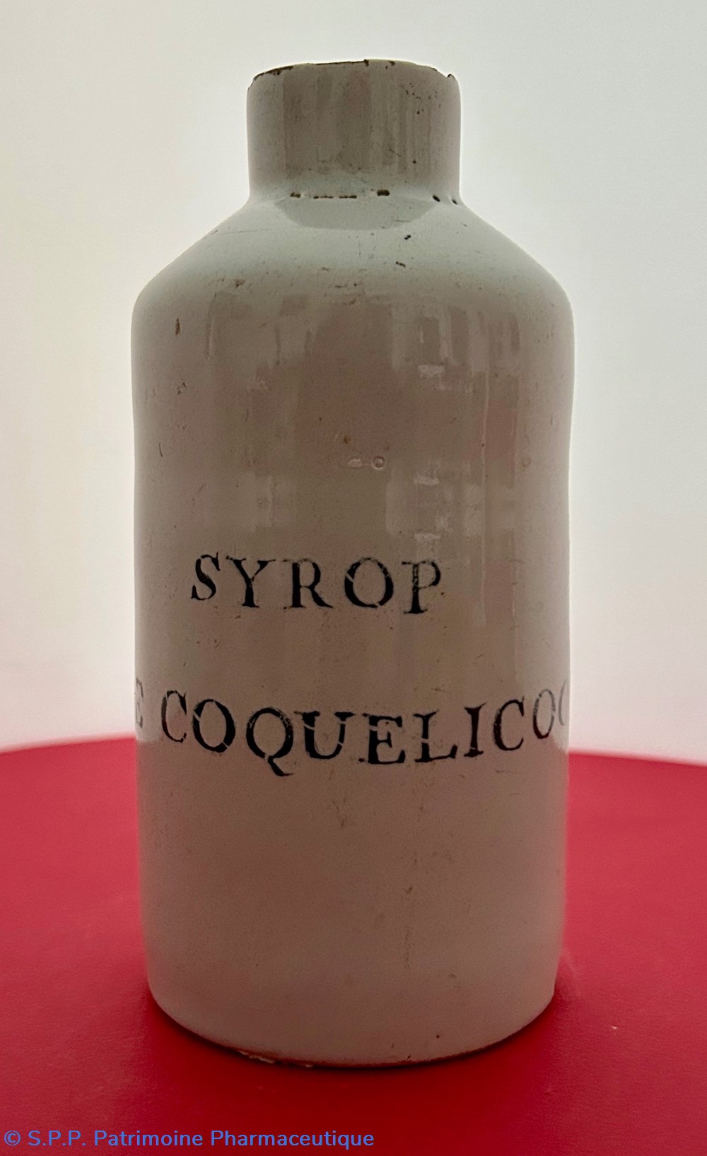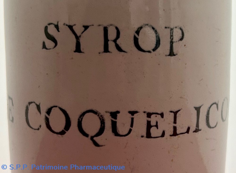 ROUEN - Petite bouteille à fond blanc attribuée à la Manufacture de P.J. de La Mettairie. Inscription : " SYROP DE COQUELICOT"