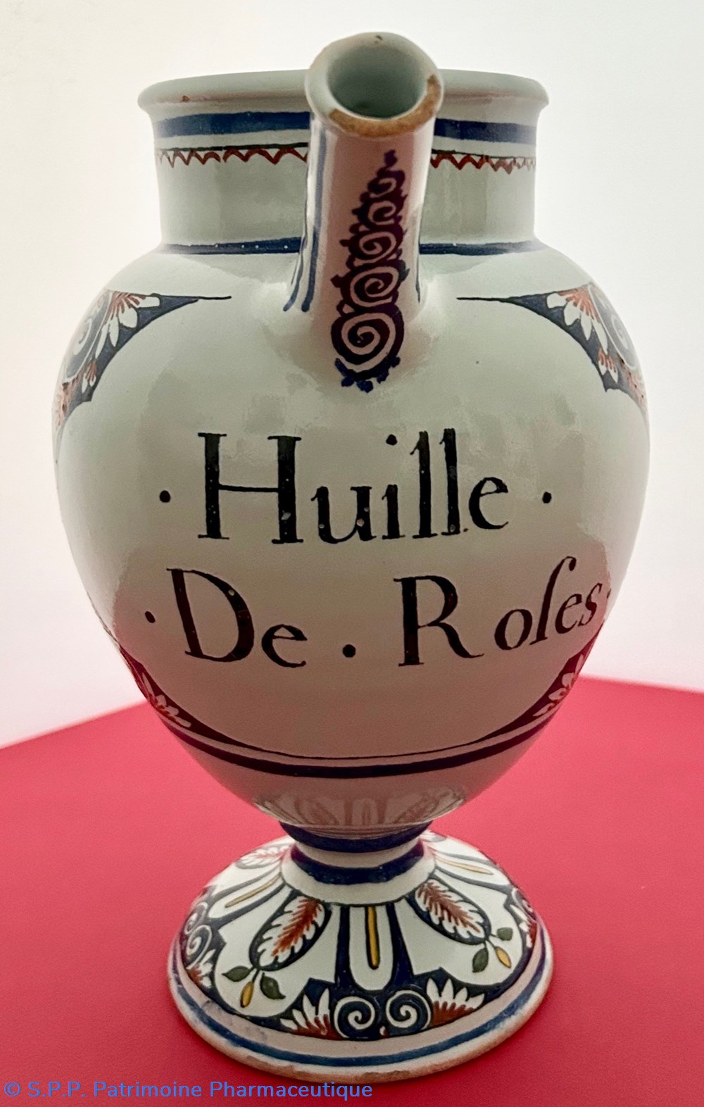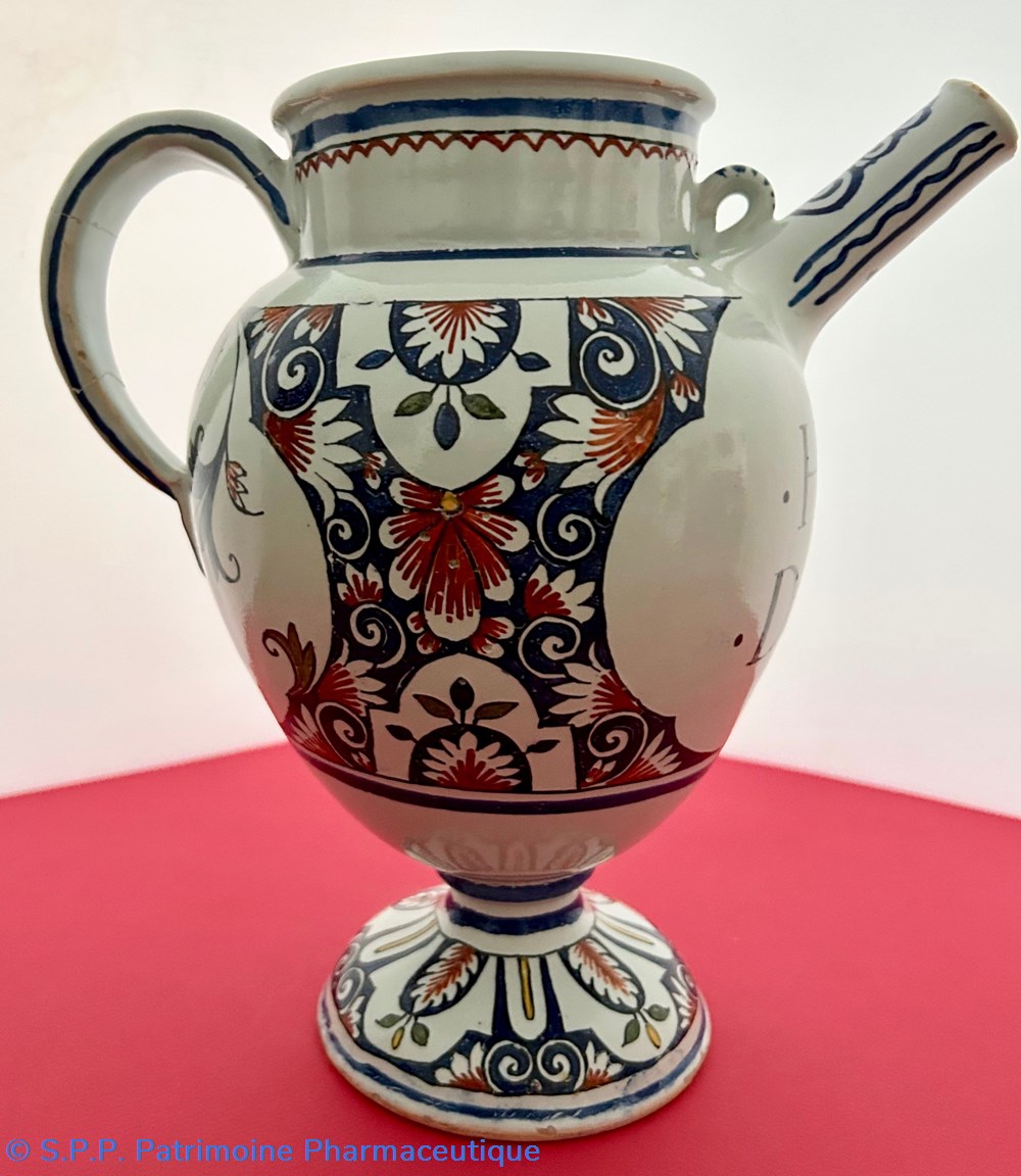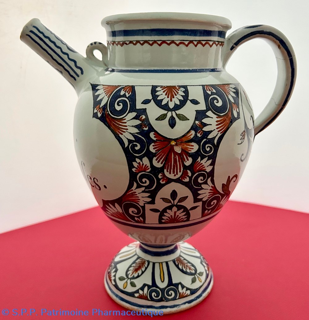 ROUEN - Chevrette en faïence à décor polychrome aux cinq couleurs" de cartouches quadrilobes et de lambrequins, fleurs et fleurons en motif et contre-motif. Le pied de la chevrette reprend les motifs de lambrequins, de fleurs et de feuillage, l'anse et le goulot sont ornés d'enroulements de ferronnerie. Inscription dans le cartouche : " . Huille . . De . Roses. "