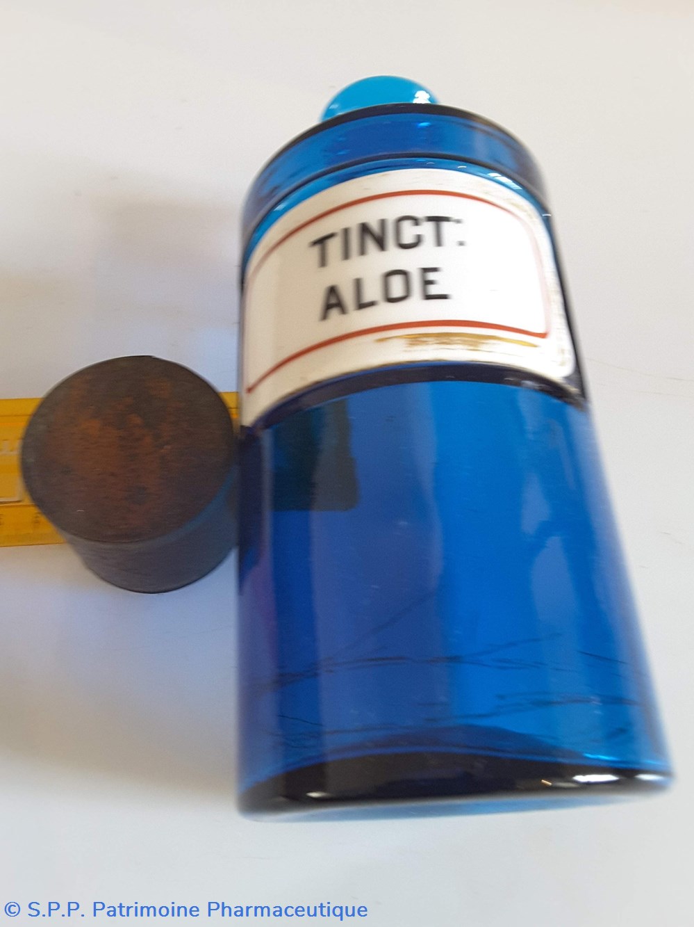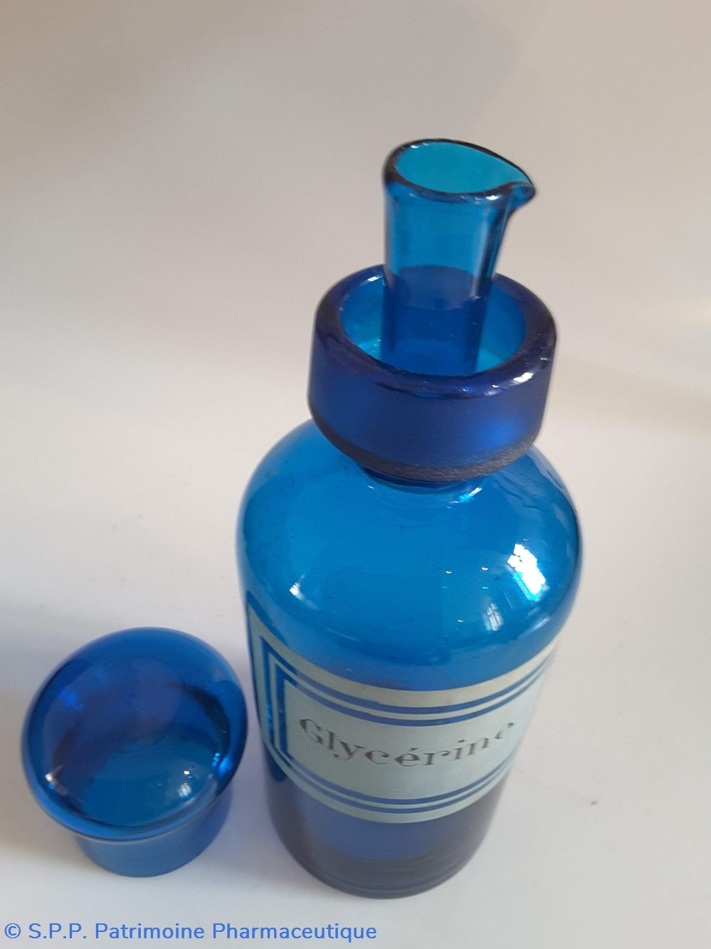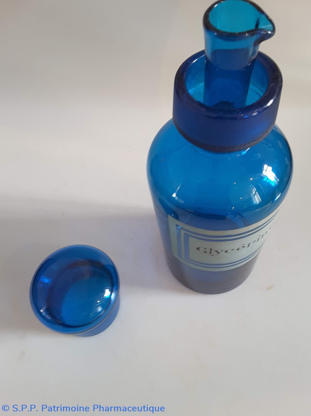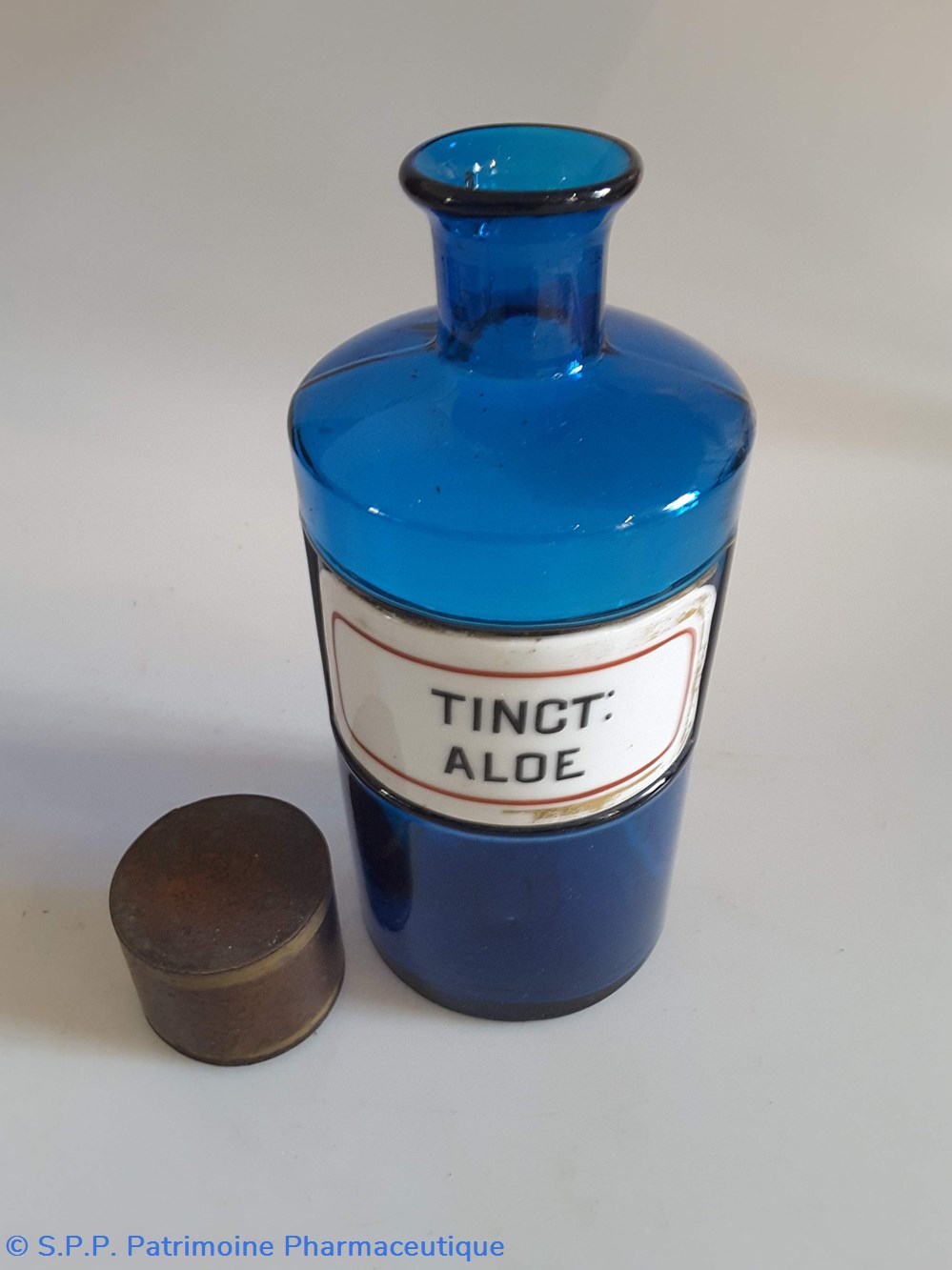 Pot en verre bleu étiquette en faïence Couvercle en tôle. Goulot droit