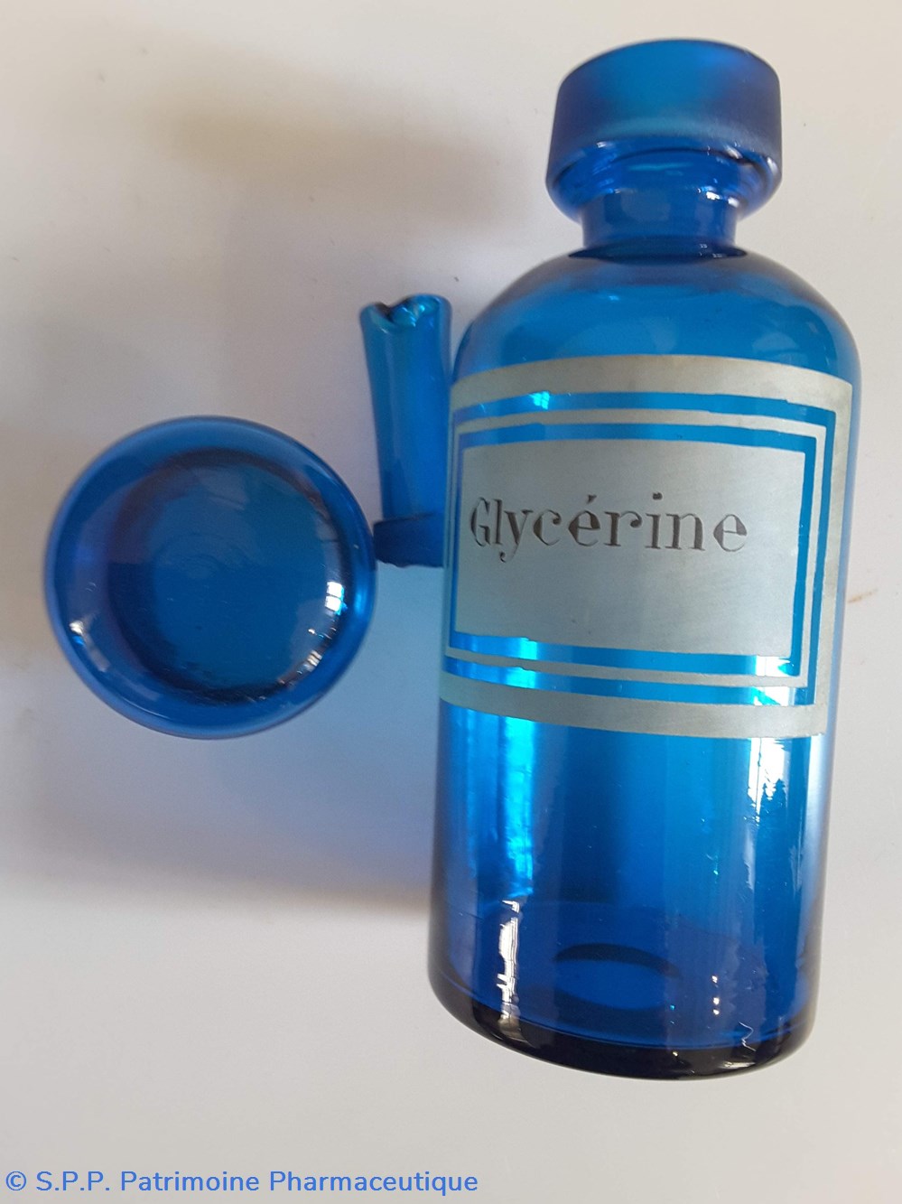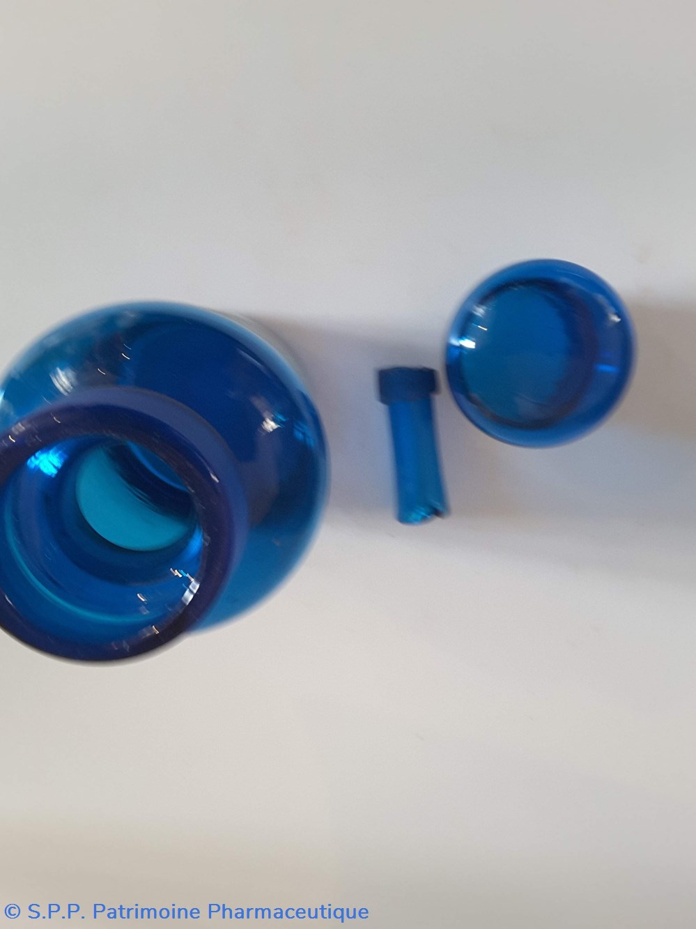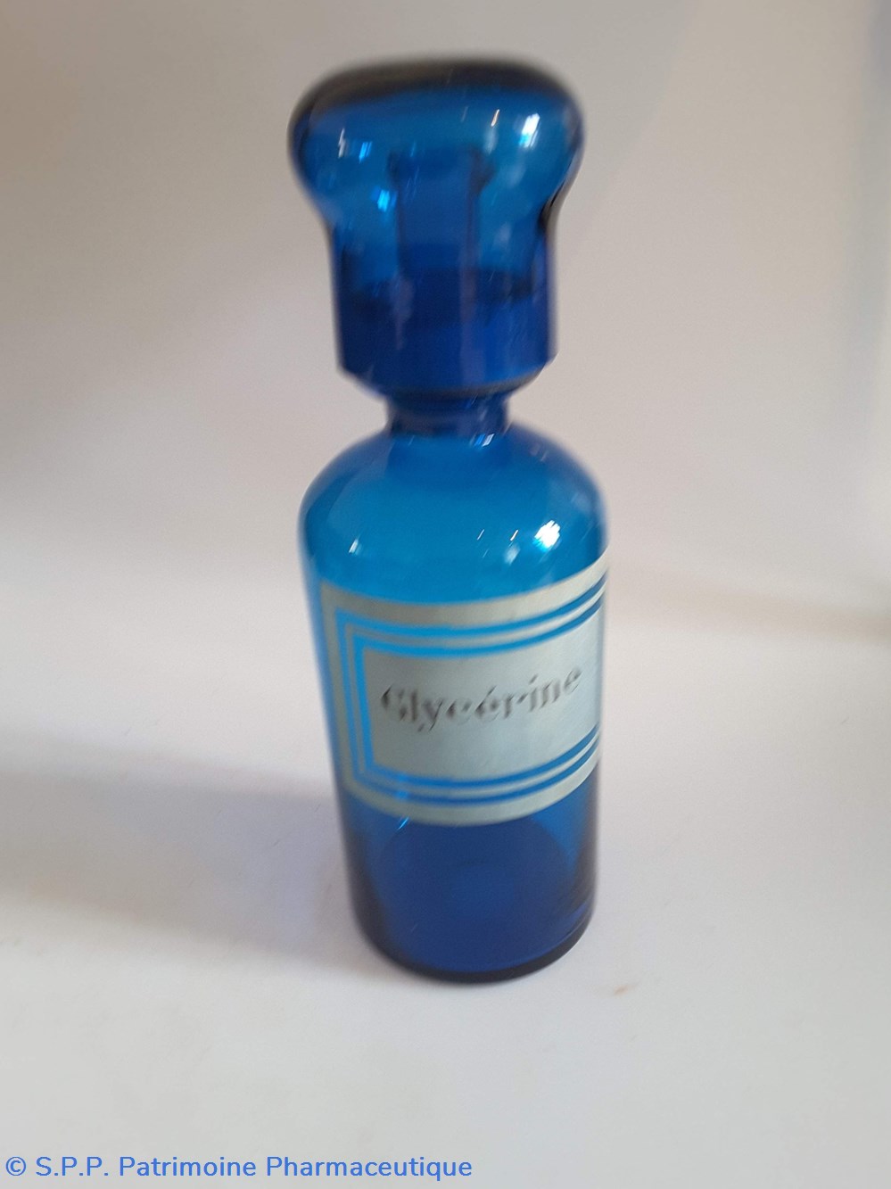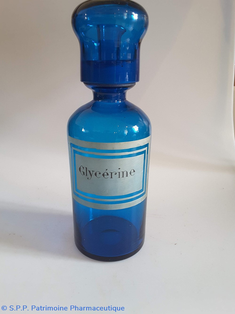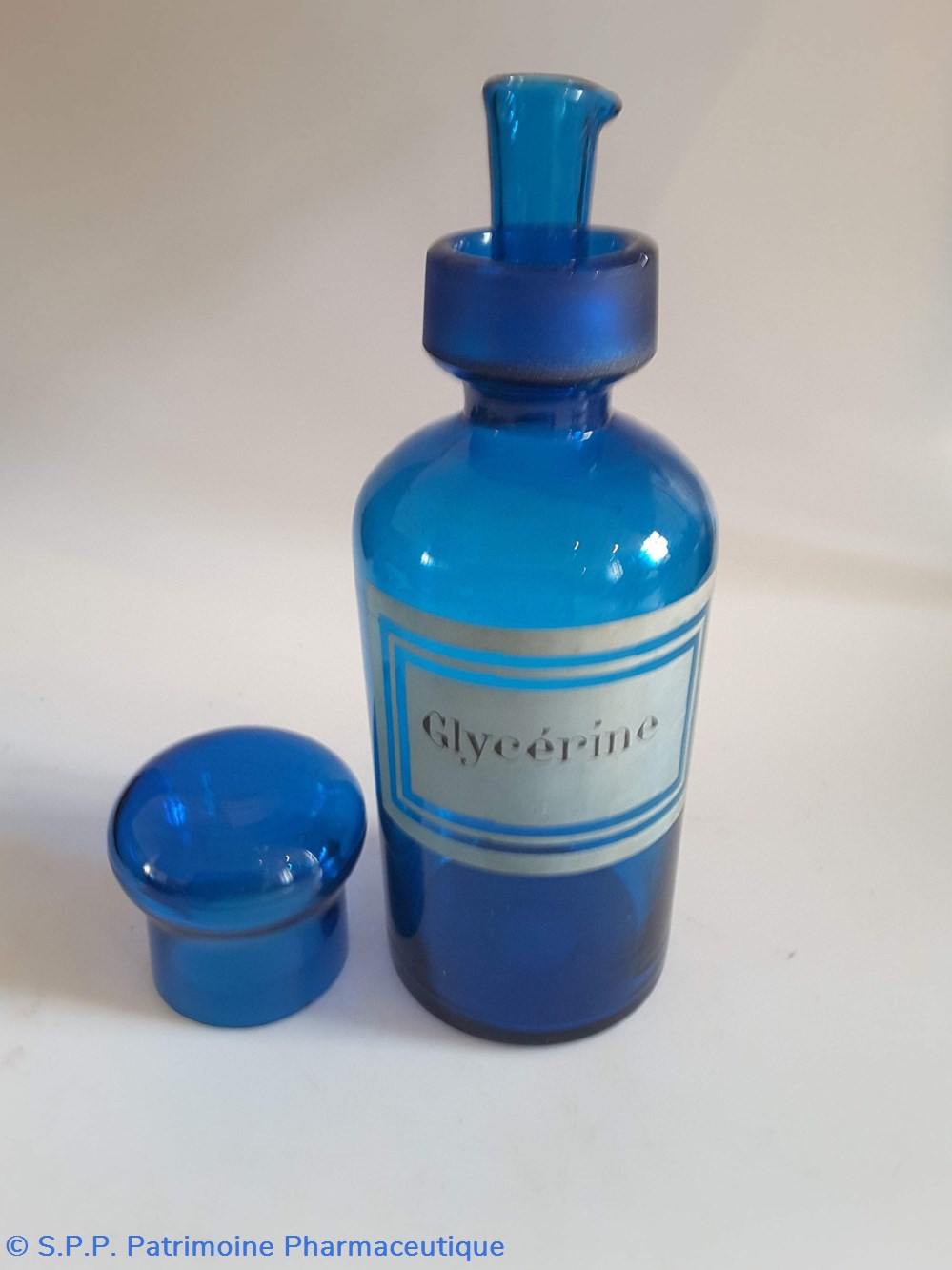 Pot en verre bleu étiquette en faïence Couvercle en tôle. Goulot droit