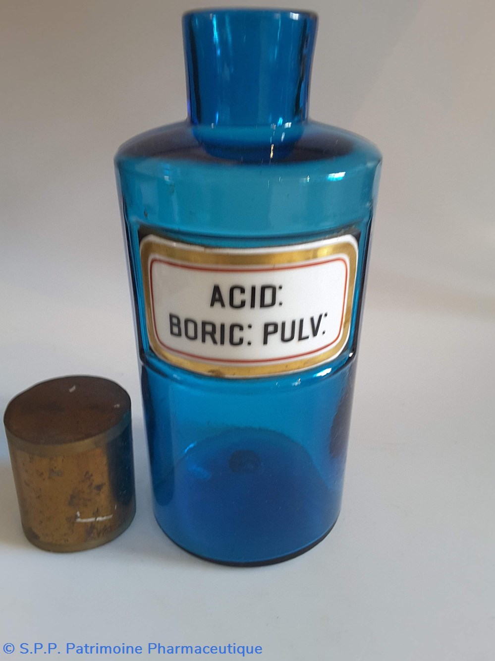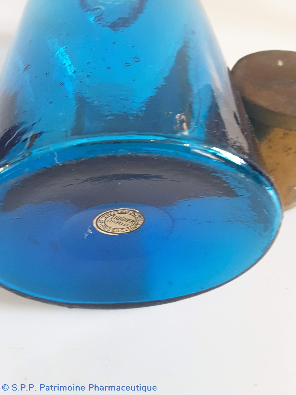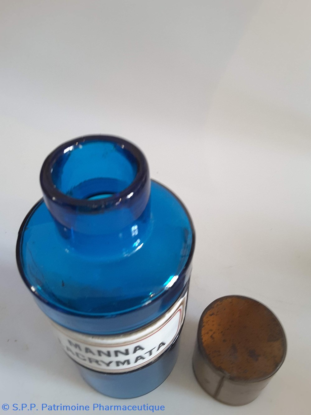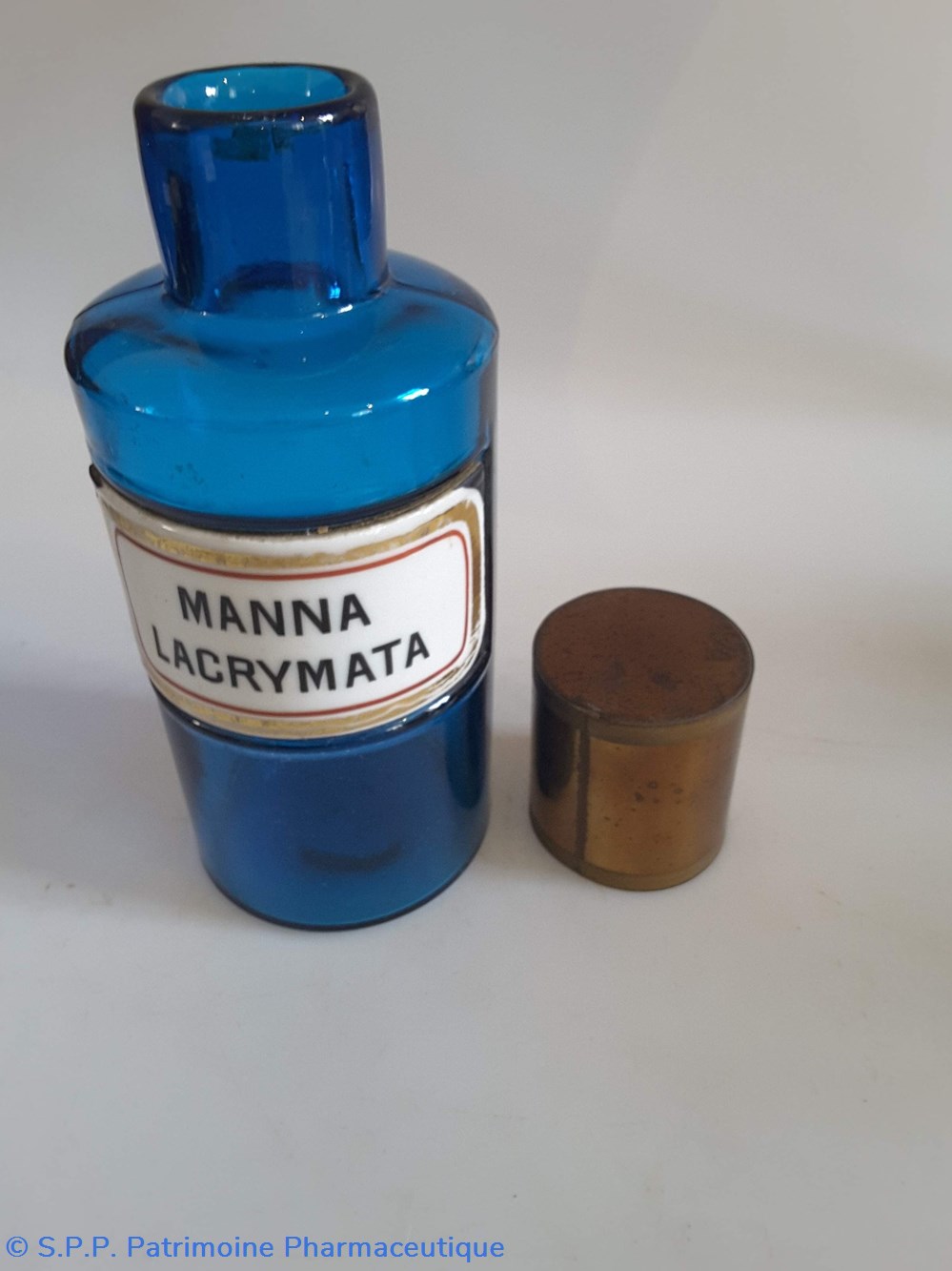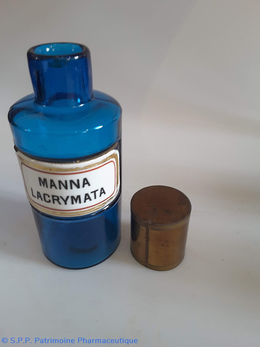 Pot bleu en verre surmonté d'un couvecle en tôle Etiquette en porcelaine avec contour rouge et or
