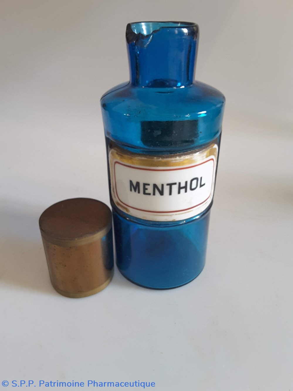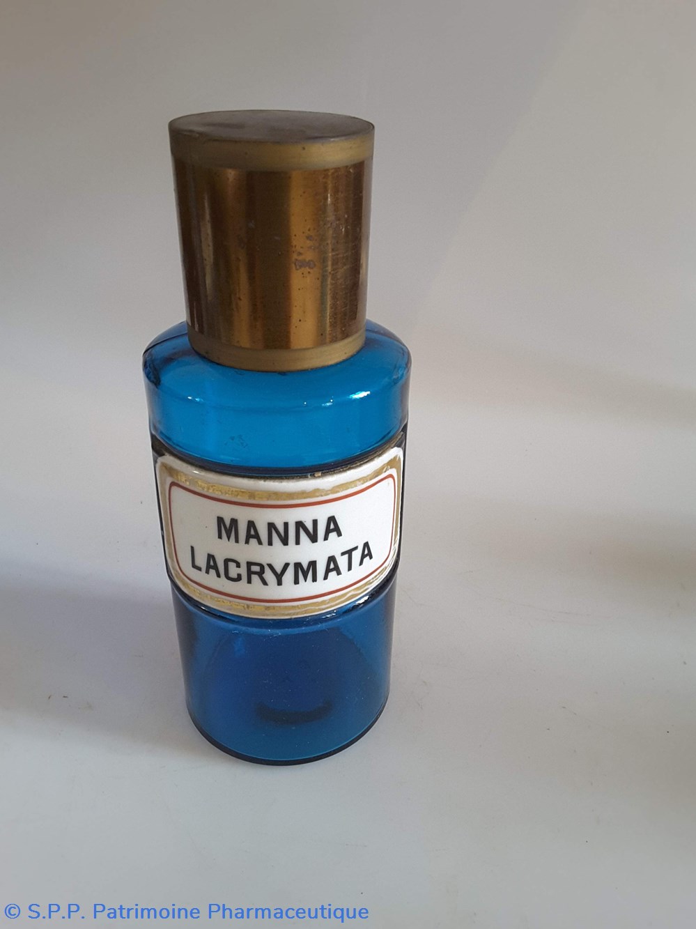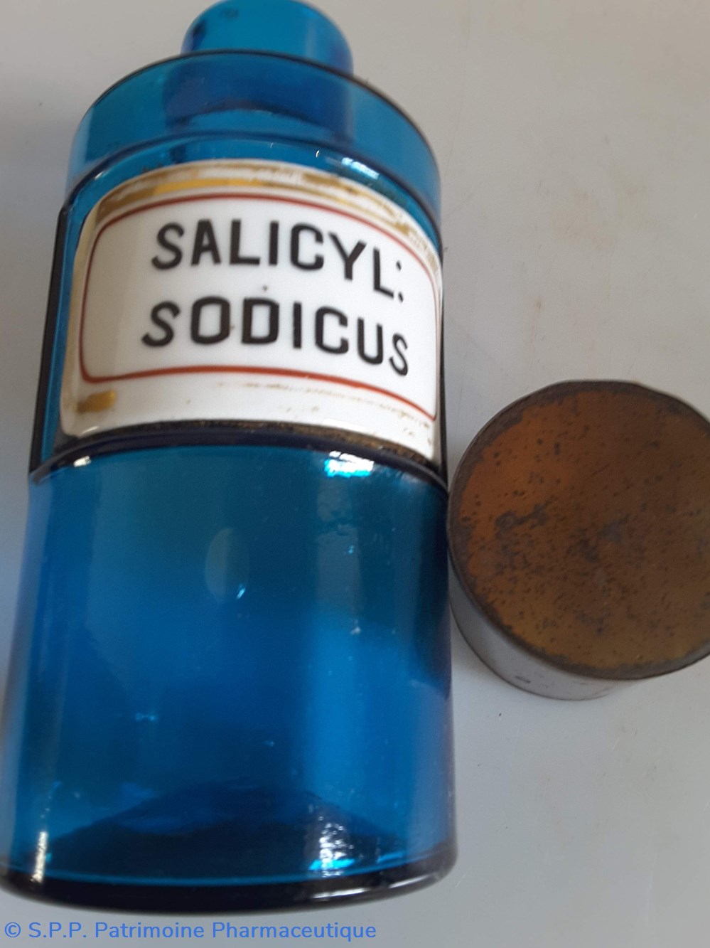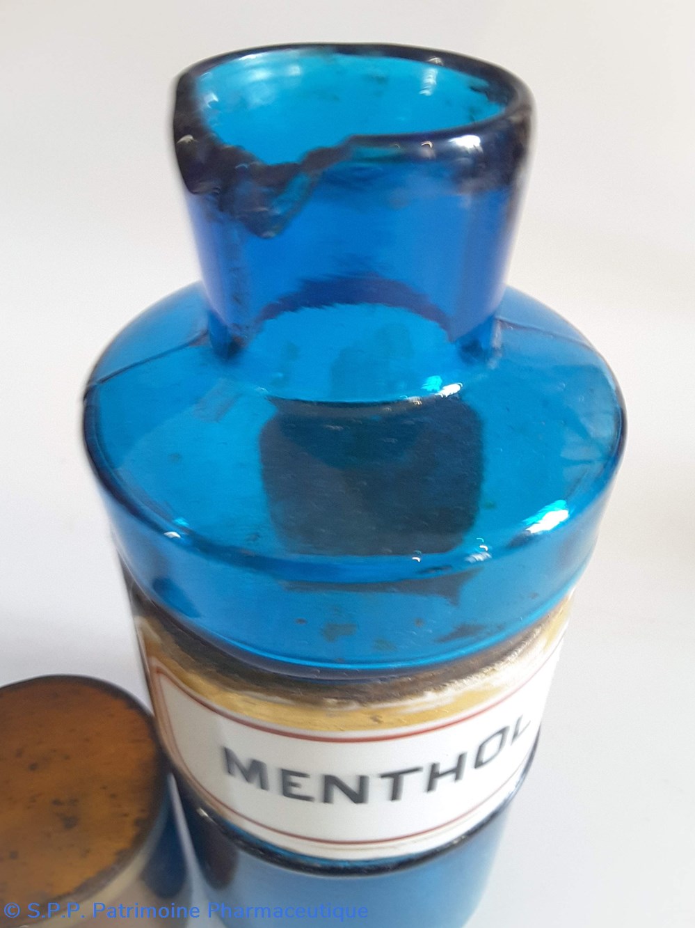 Pot bleu en verre surmonté d'un couvecle en tôle Etiquette en porcelaine avec contour rouge et or