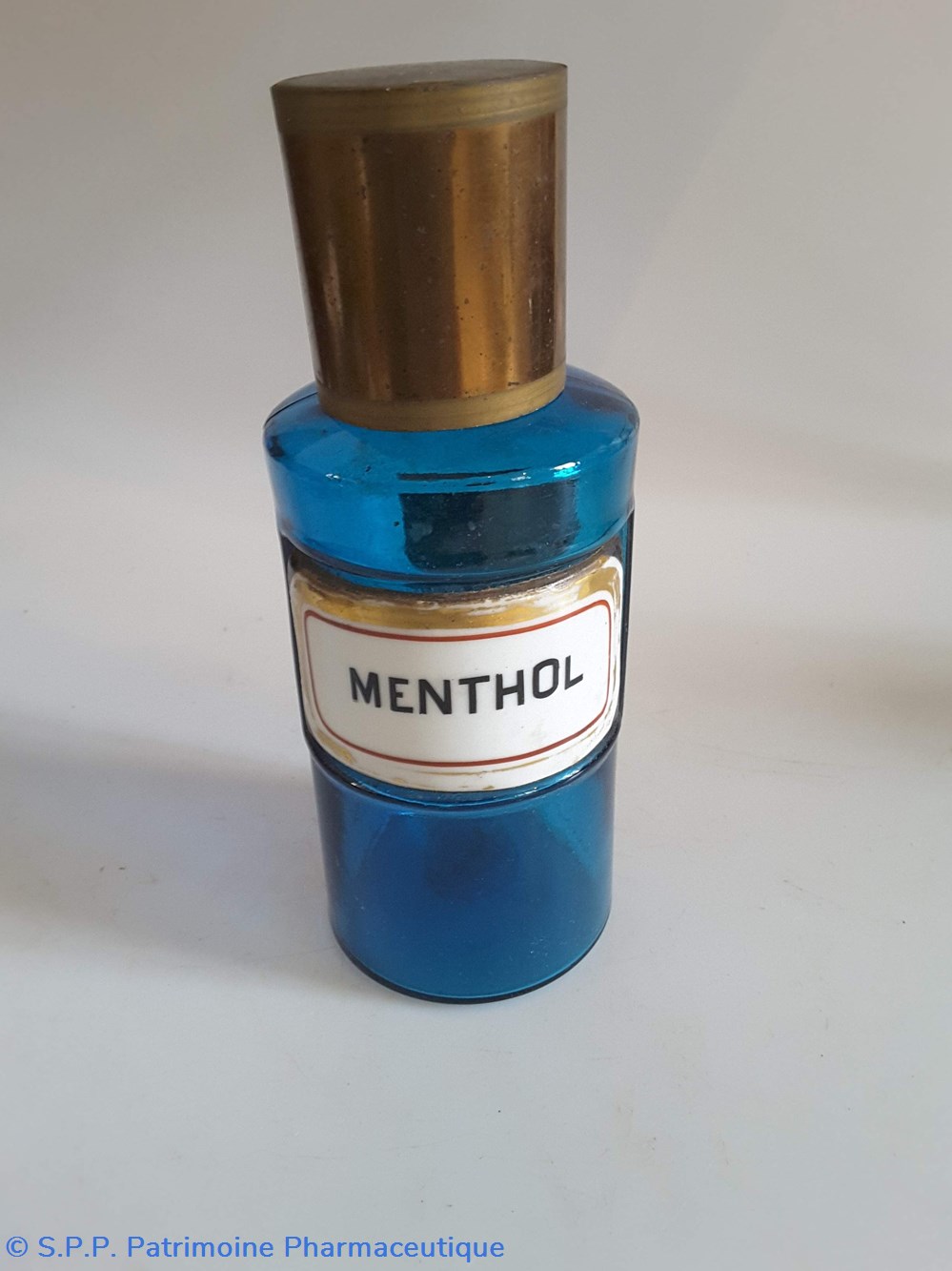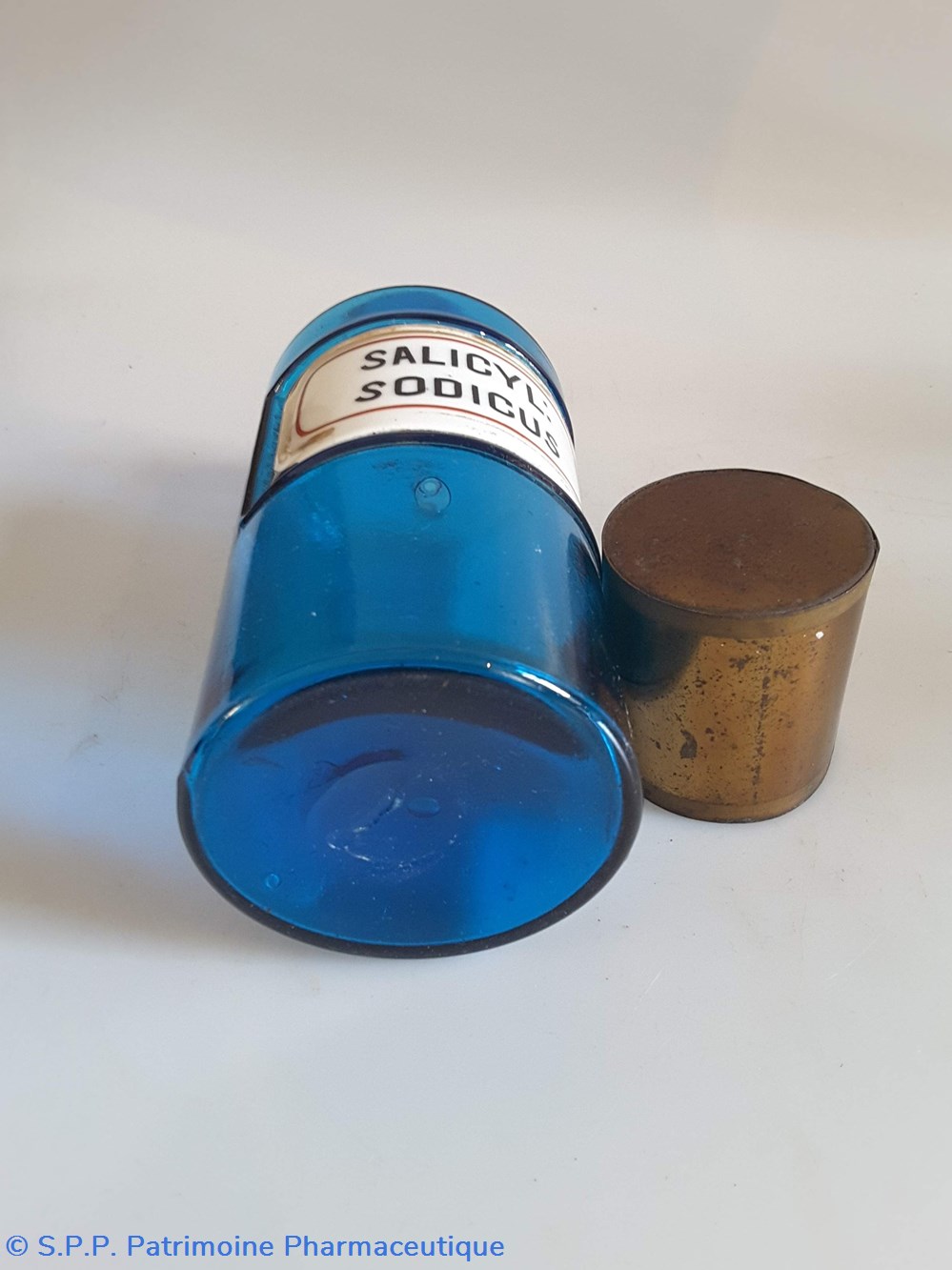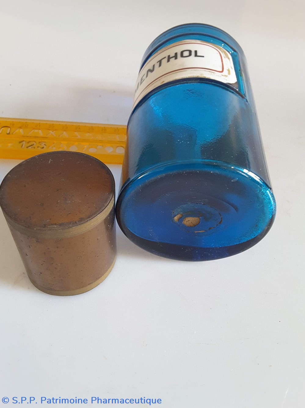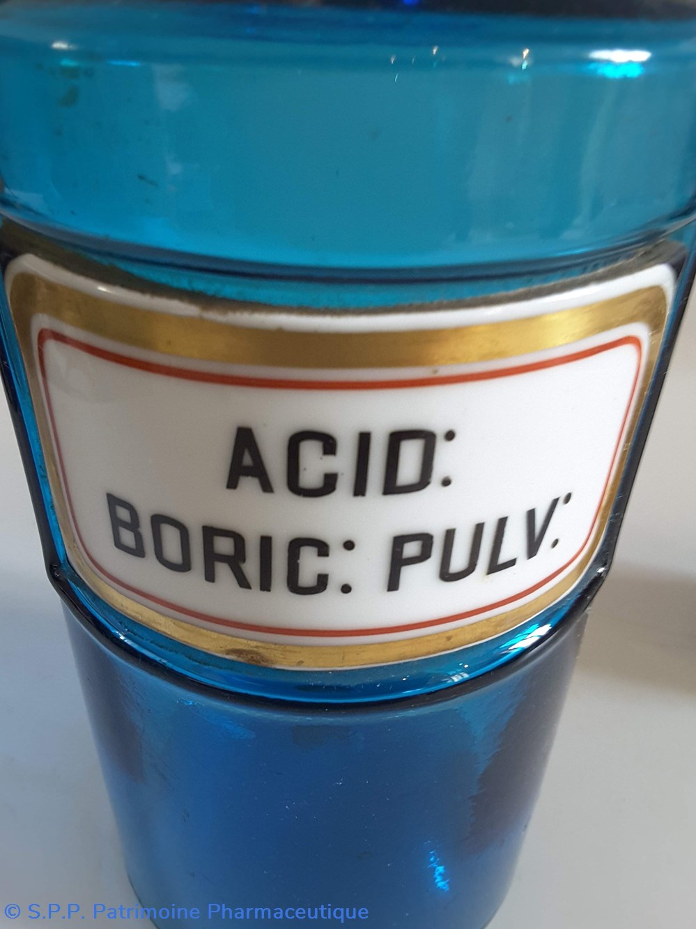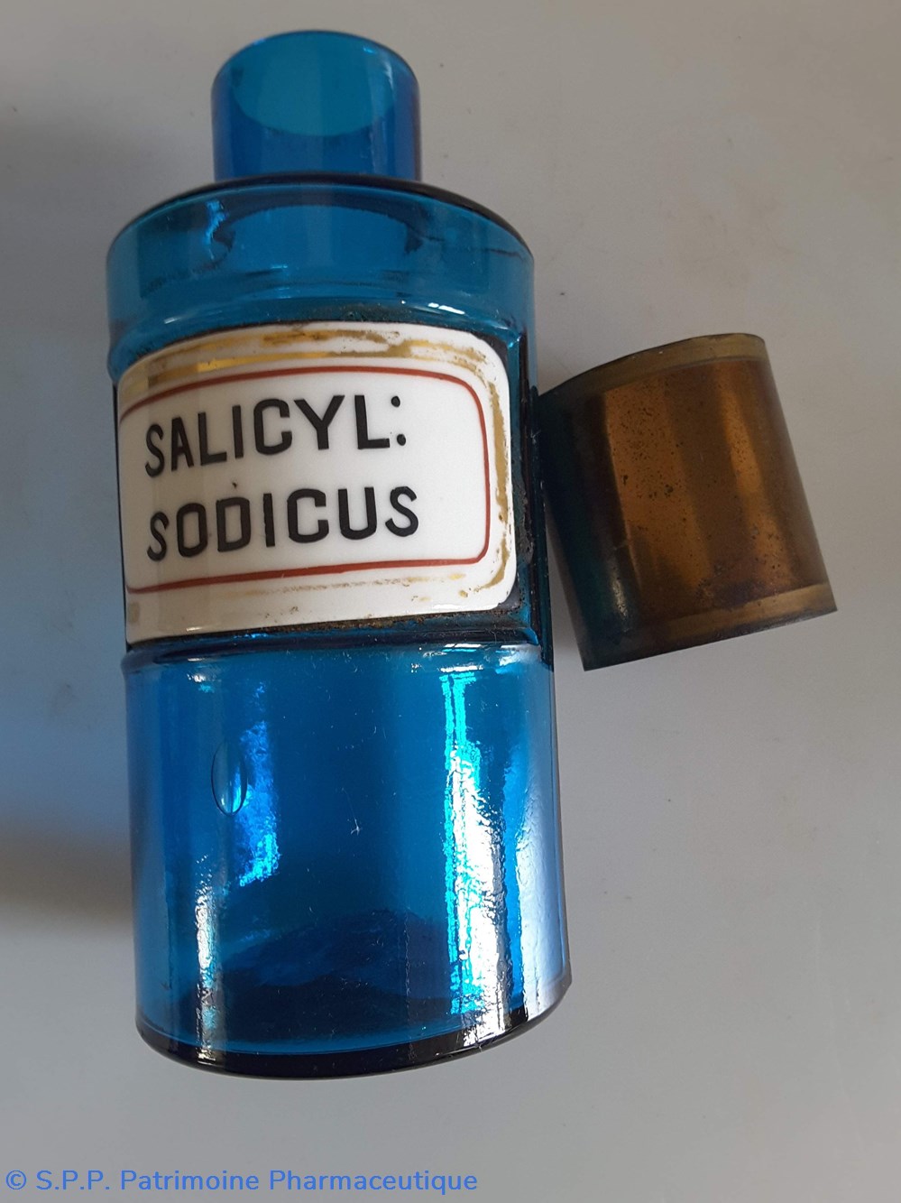 Pot bleu en verre surmonté d'un couvecle en tôle Etiquette en porcelaine avec contour rouge et or