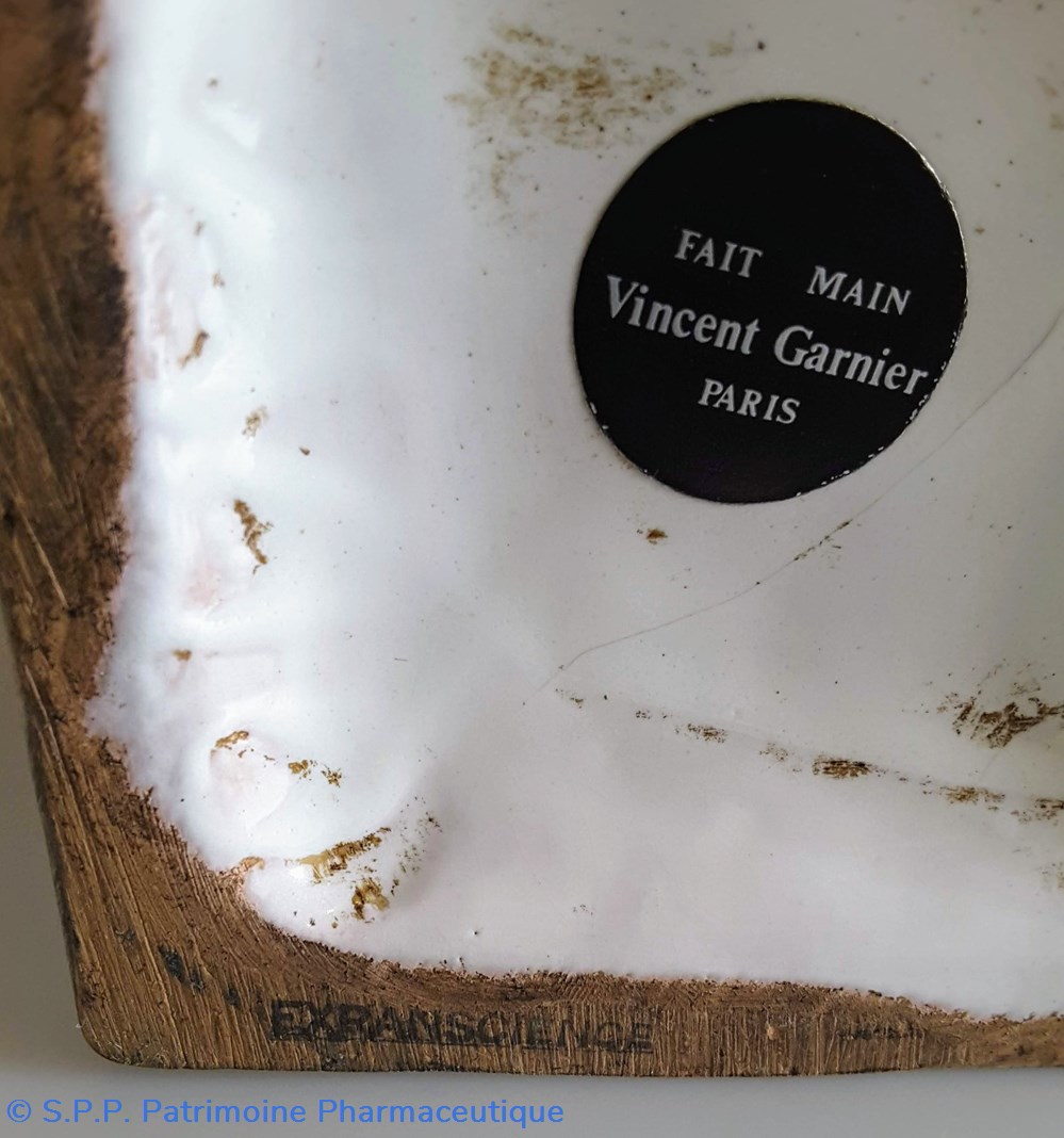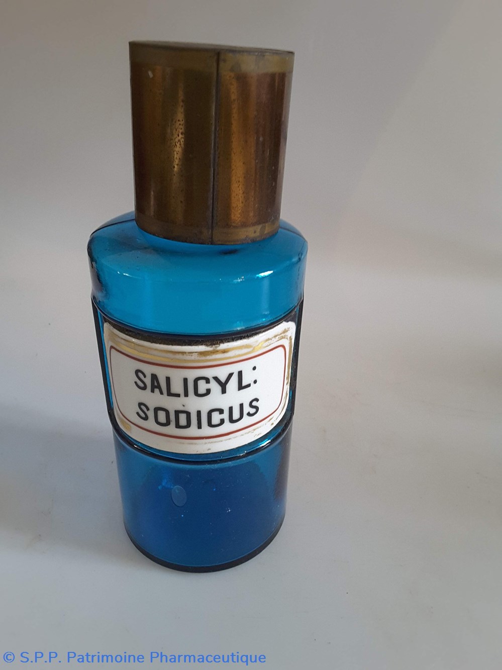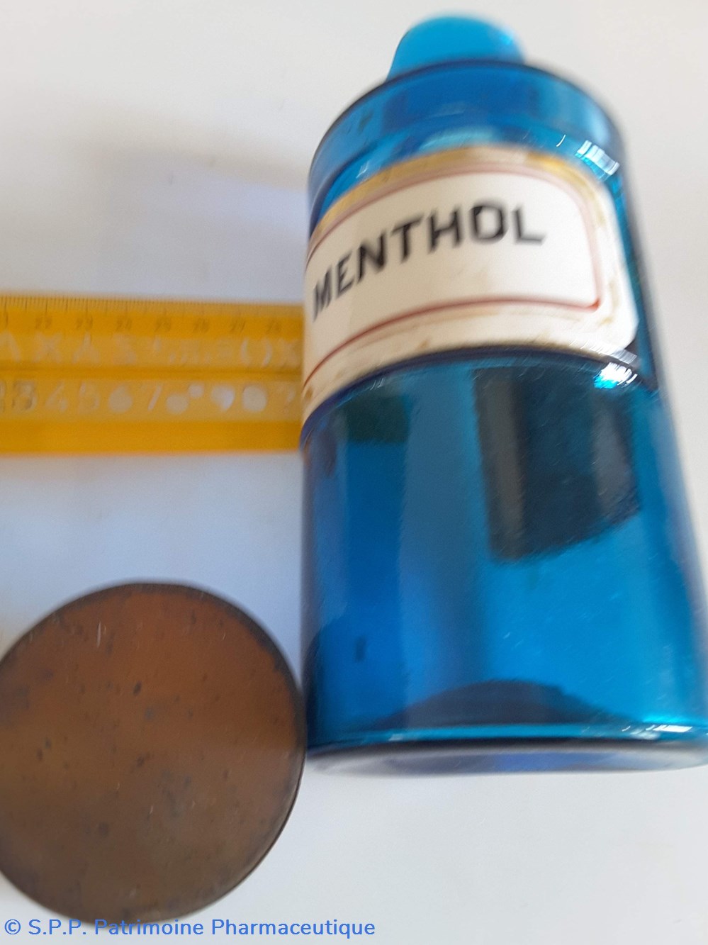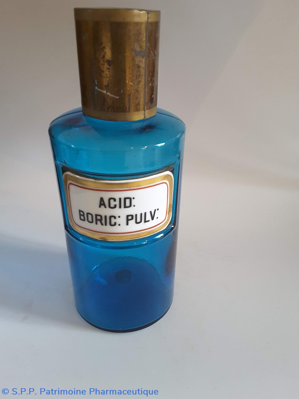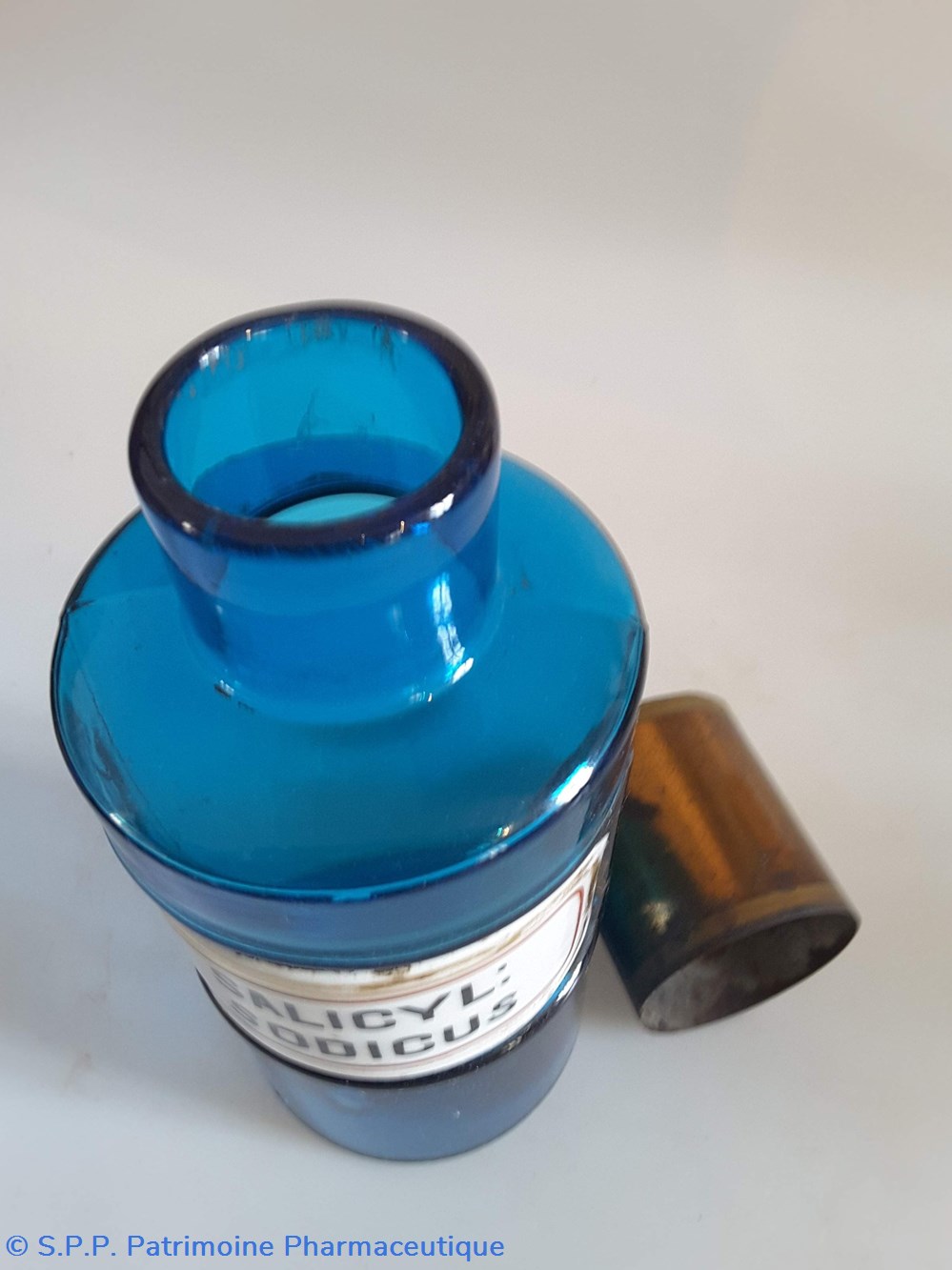 Pot bleu en verre surmonté d'un couvecle en tôle Etiquette en porcelaine avec contour rouge et or